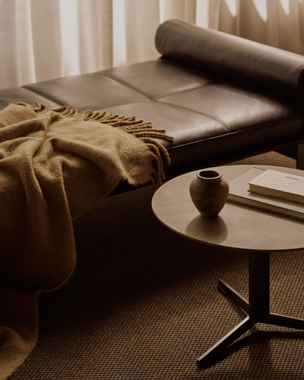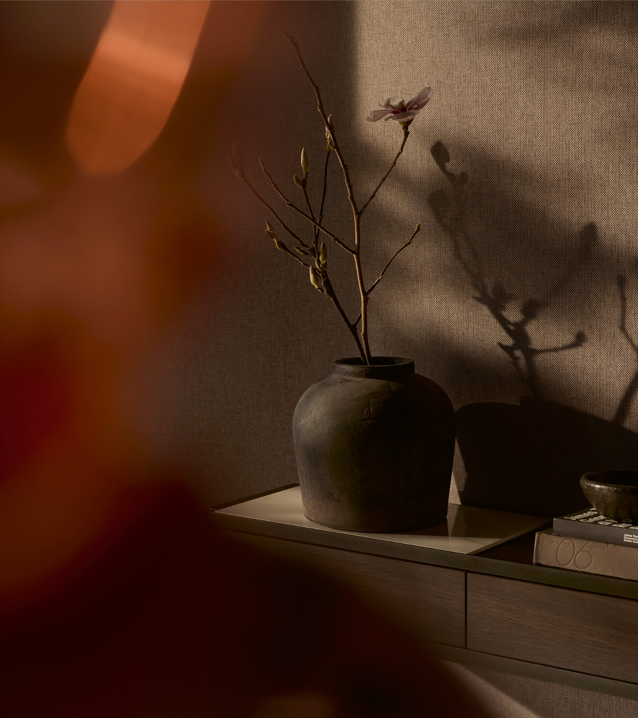 On a happy day, when the sun's rays warm the still damp earth, a house wakes up. Around it shine forests, ancient trunks, flowers, dew. Inside move light steps, the scent of incense, and a smile brightens the shadow. Silently the light brushes the grains of a table, an ancient ceramic, the dark and intense leather of an armchair with essential and elegant lines.