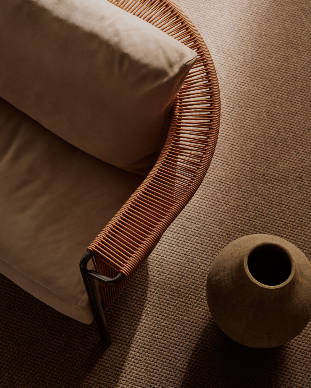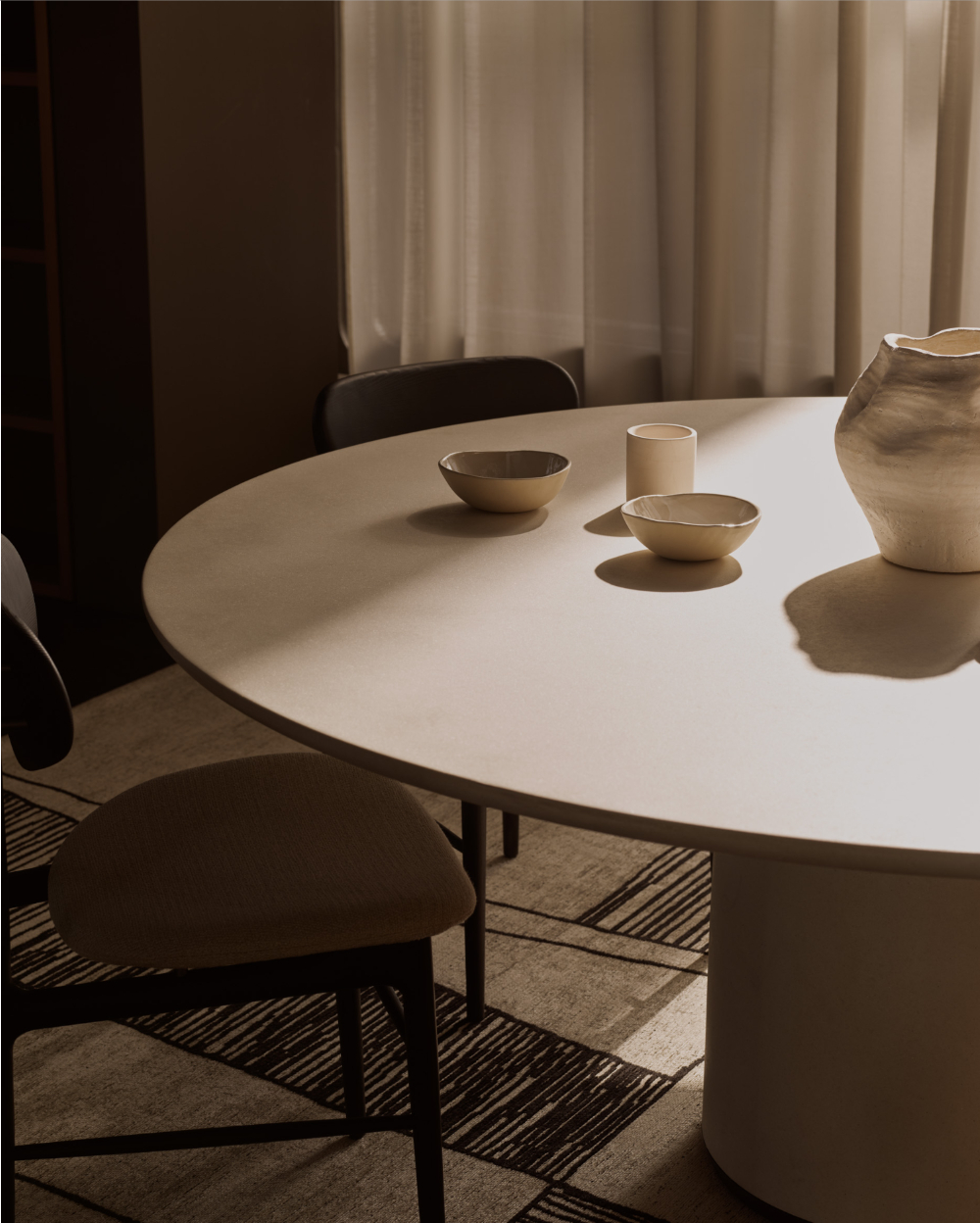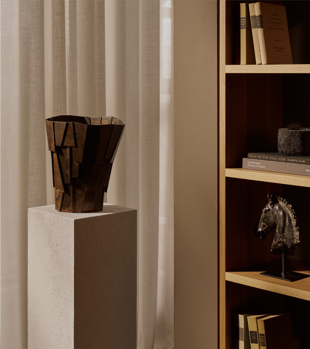 Maybe he has just returned from a trip to a distant country and his home embraces him happily. Two lives, that of a collector and his personal museum, come back together. The suitcase is still at the entrance, the shoes near the sofa, and a new painting is resting on the large wooden table, just like that, to feel the warmth and naturalness of this material that is already a work of art.