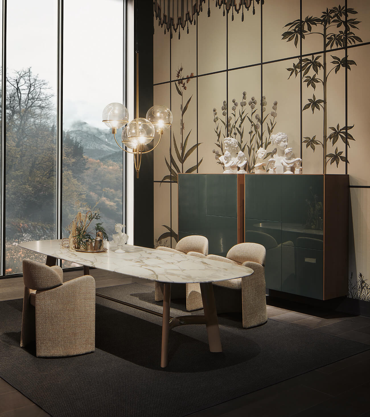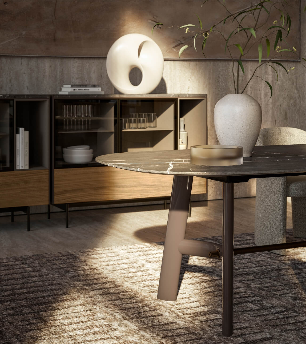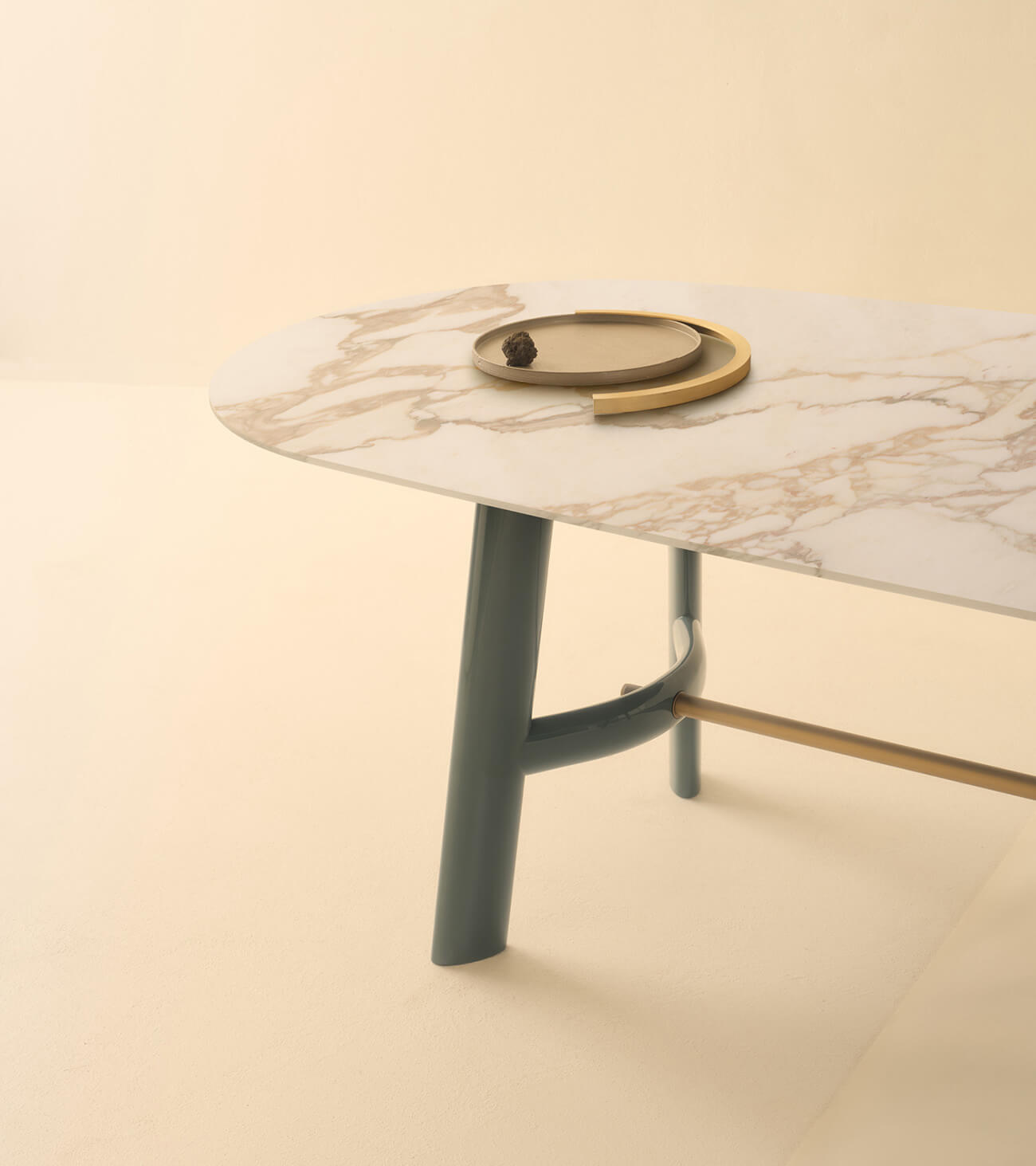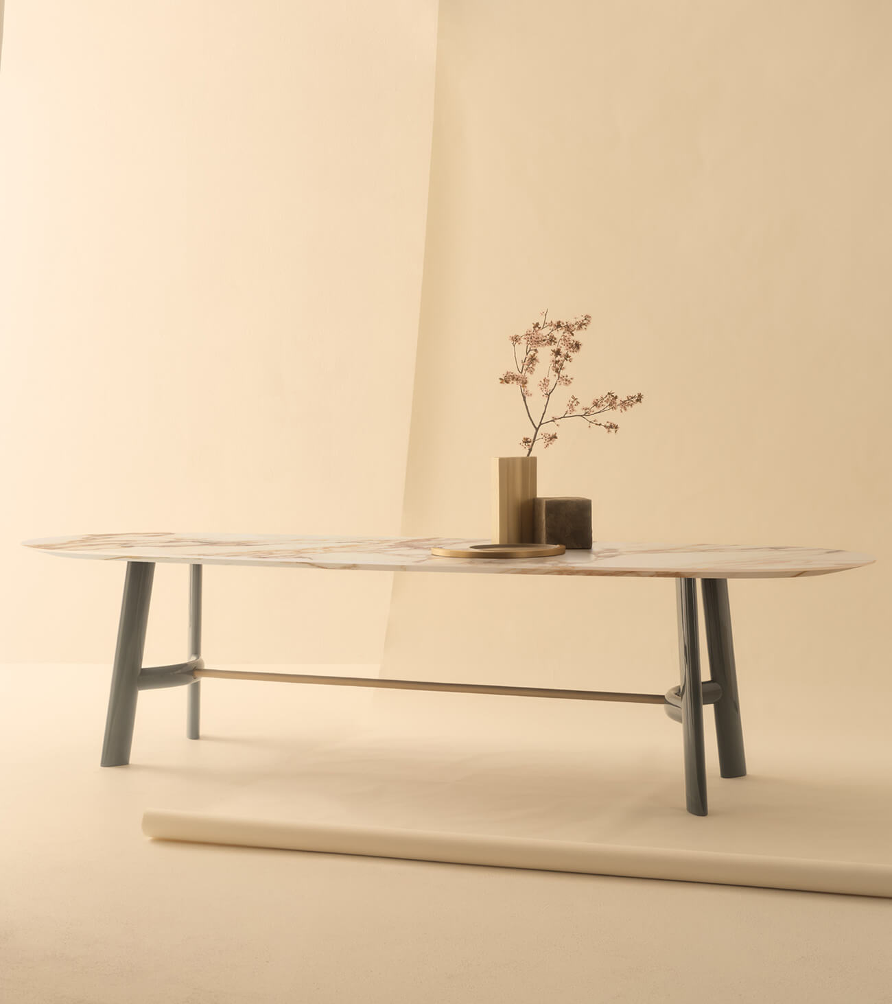 The supporting trestles, connected by a stretcher with a patinated bronze finish and a slightly curved wooden crossbar, reflect the aesthetic that inspires the table. The legs, available in glossy lacquered finish, can be combined with the different tops, further expanding the possibilities for compositional customization of the furniture: glossy and matte elements create unique and personal visual combinations that change the appeal of the product and adapt it to multiple settings.