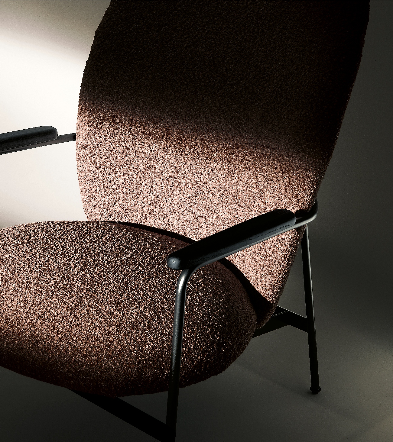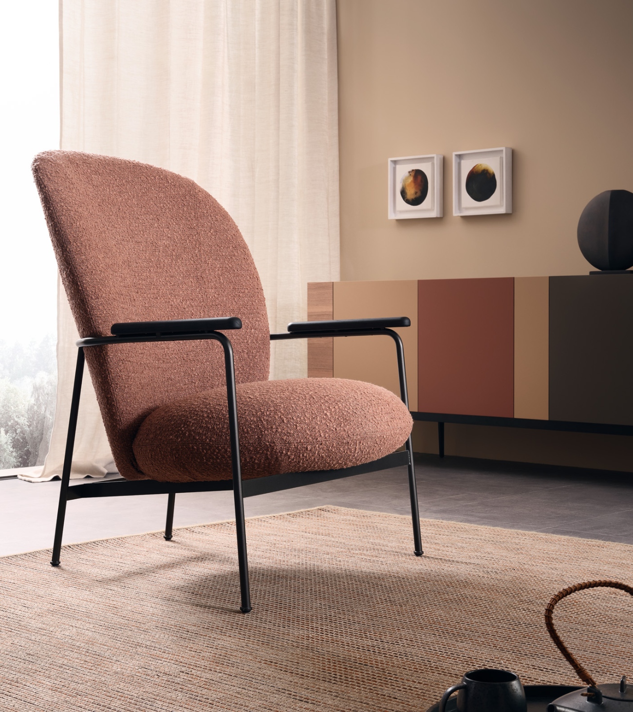Distinguished by its high backrest and rounded shape, the Claire lounge chair invites you to sit comfortably and enjoy a moment of relaxation. In contrast to the generous padding, the metal frame is minimalist, enhanced by solid wood armrests that add a reassuring tactile quality to the entire armchair.