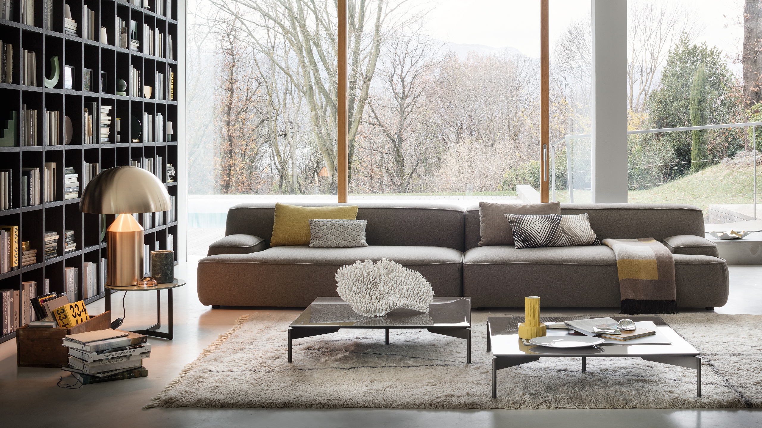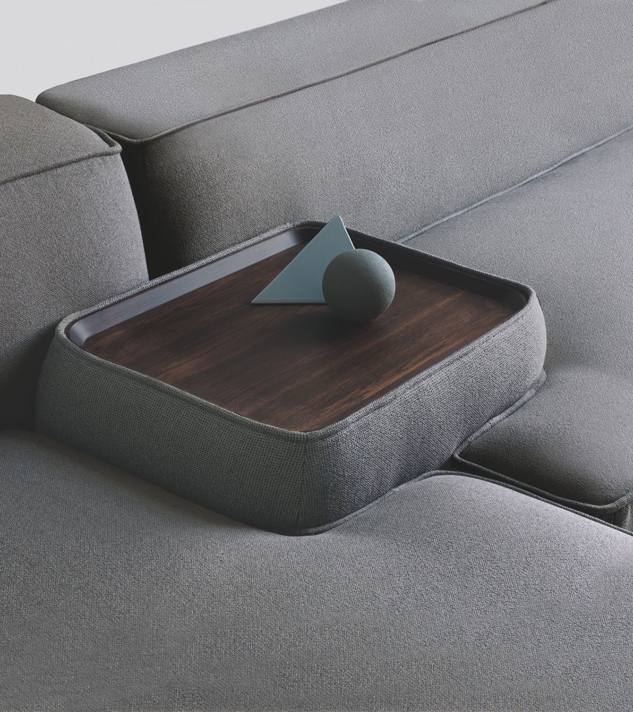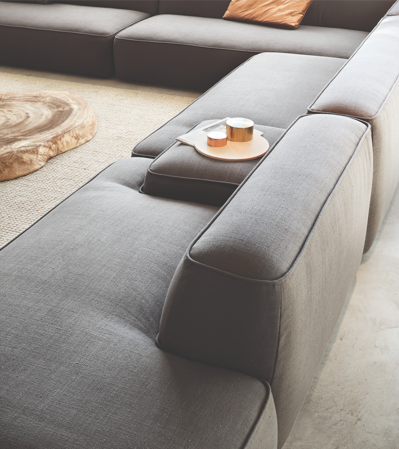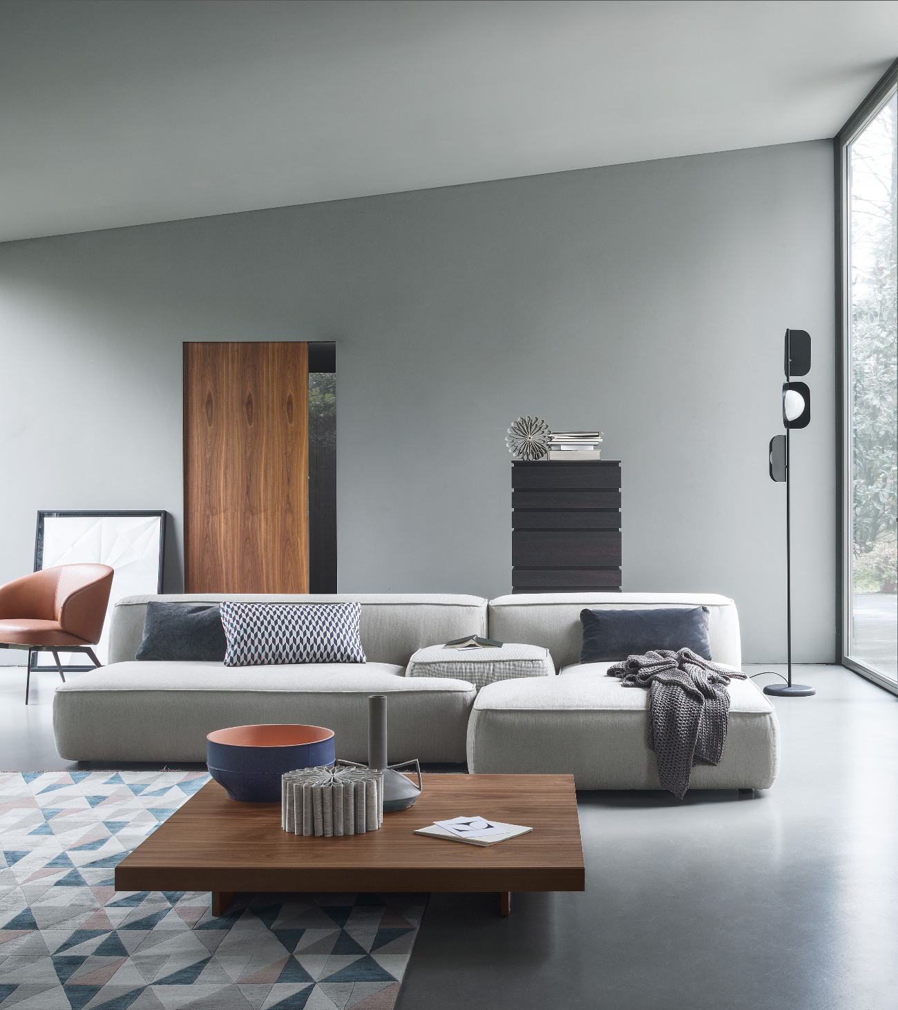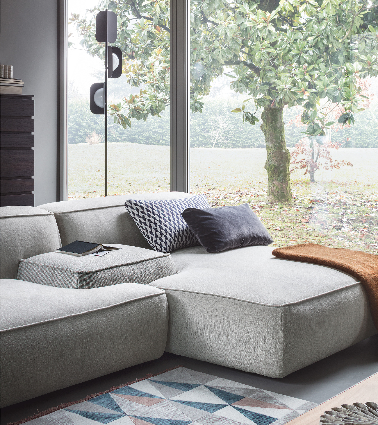 Playful geometries define endless composition possibilities, created using eighteen modules and three types of armrests, each differing in size, shape, and height: the central module can be selected as an end element, and vice versa, or can be detached to become an ottoman; the backrest can also function as a side or as a divider between two seats, while the armrest itself can become a small seat or a side table. The interplay of combinations extends to colors and materials, thanks to the option of combining elements in different colors, fabrics, and textures.