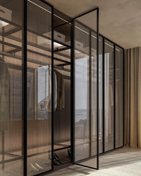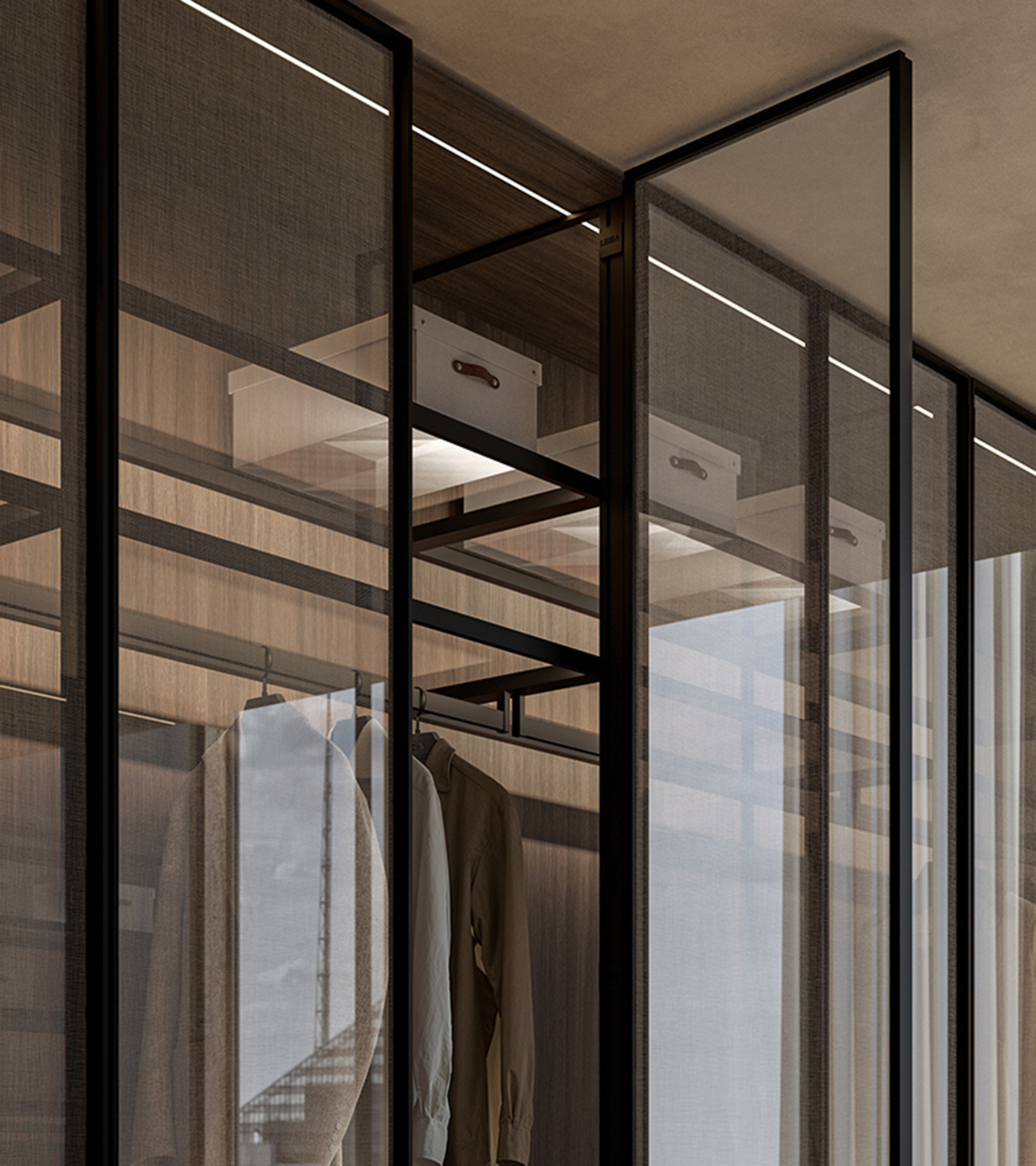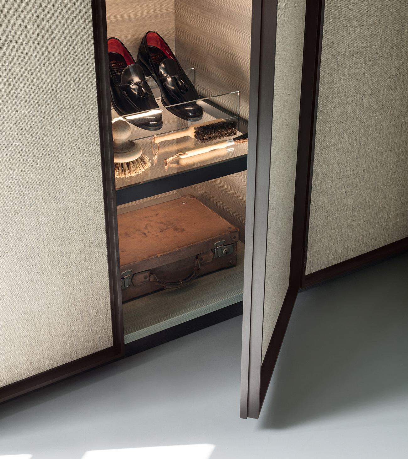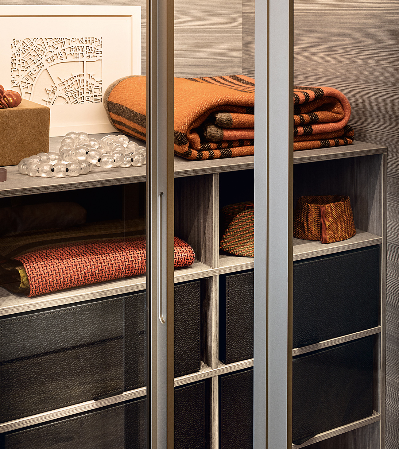 The version with glass doors embraces the trend of display-effect wardrobes, offering a sense of complete openness and absolute lightness, while the decorative textile covering evokes the essentiality and purity of oriental style. Adjustable in height, width, and depth, it provides numerous options for interior customization. The Armadio al Centimetro program offers a variety of finishes from the catalog and a rich selection of accessories designed to optimize space according to specific functional needs: drawer units, trouser racks, belt holders, shoe racks. Shelves and hanging rails with integrated lighting. Not to mention refined details in leather and fabric, such as drawer mats and shirt compartment boxes.