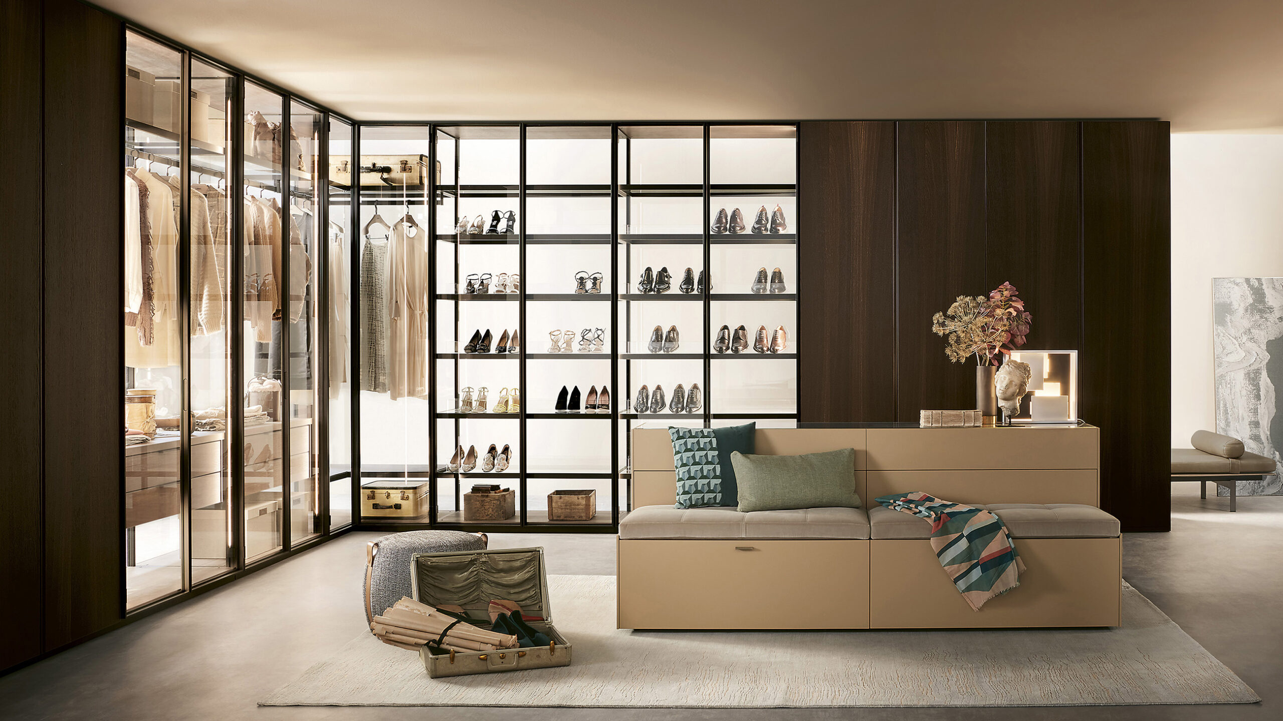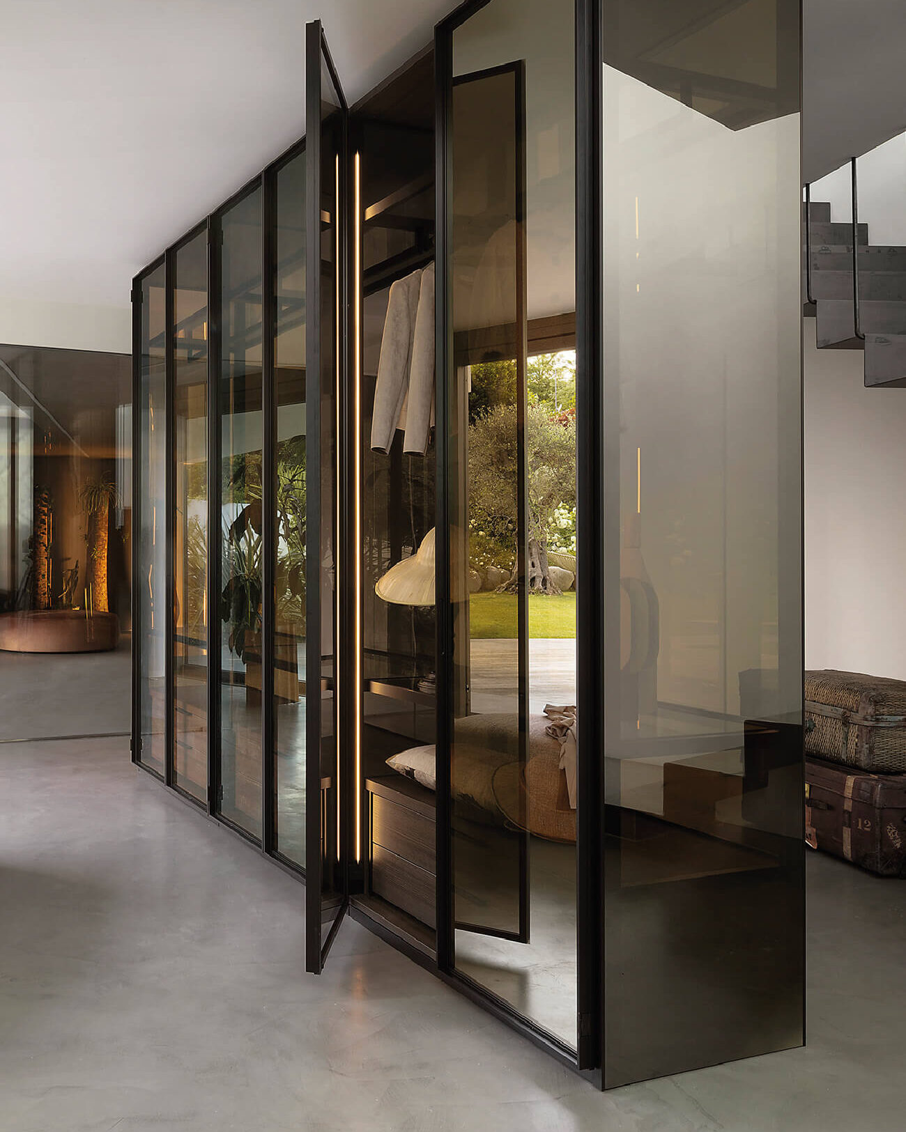 The Dandy wardrobe by Lema, designed by Officinadesign Lema, reinvents the closet space with centimeter-level modularity and bespoke craftsmanship. Doors in tempered glass, mirror, lacquered finish, leather, or fabric (38 mm thickness) on an aluminum, bronze, or sand-colored frame. Modular structure allows you to configure compartments, shelves, drawer units, and custom accessories. Integrated LED lighting enhances every detail. Premium Made in Italy finishes.