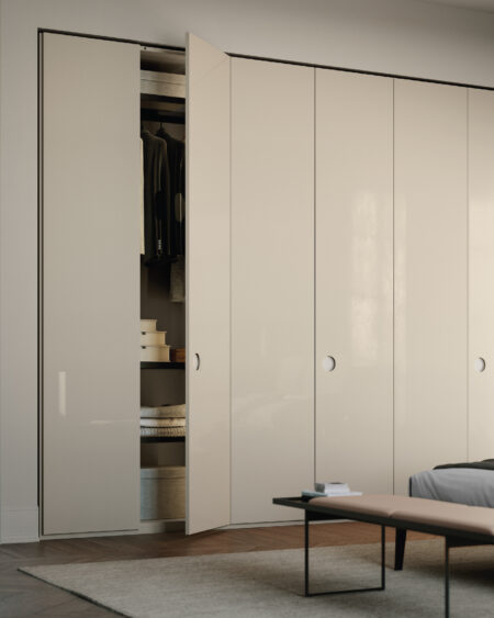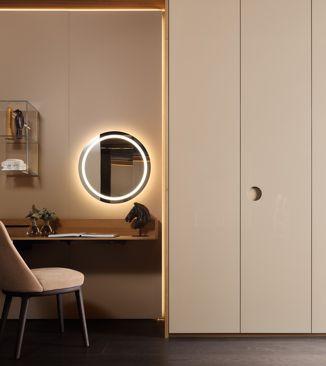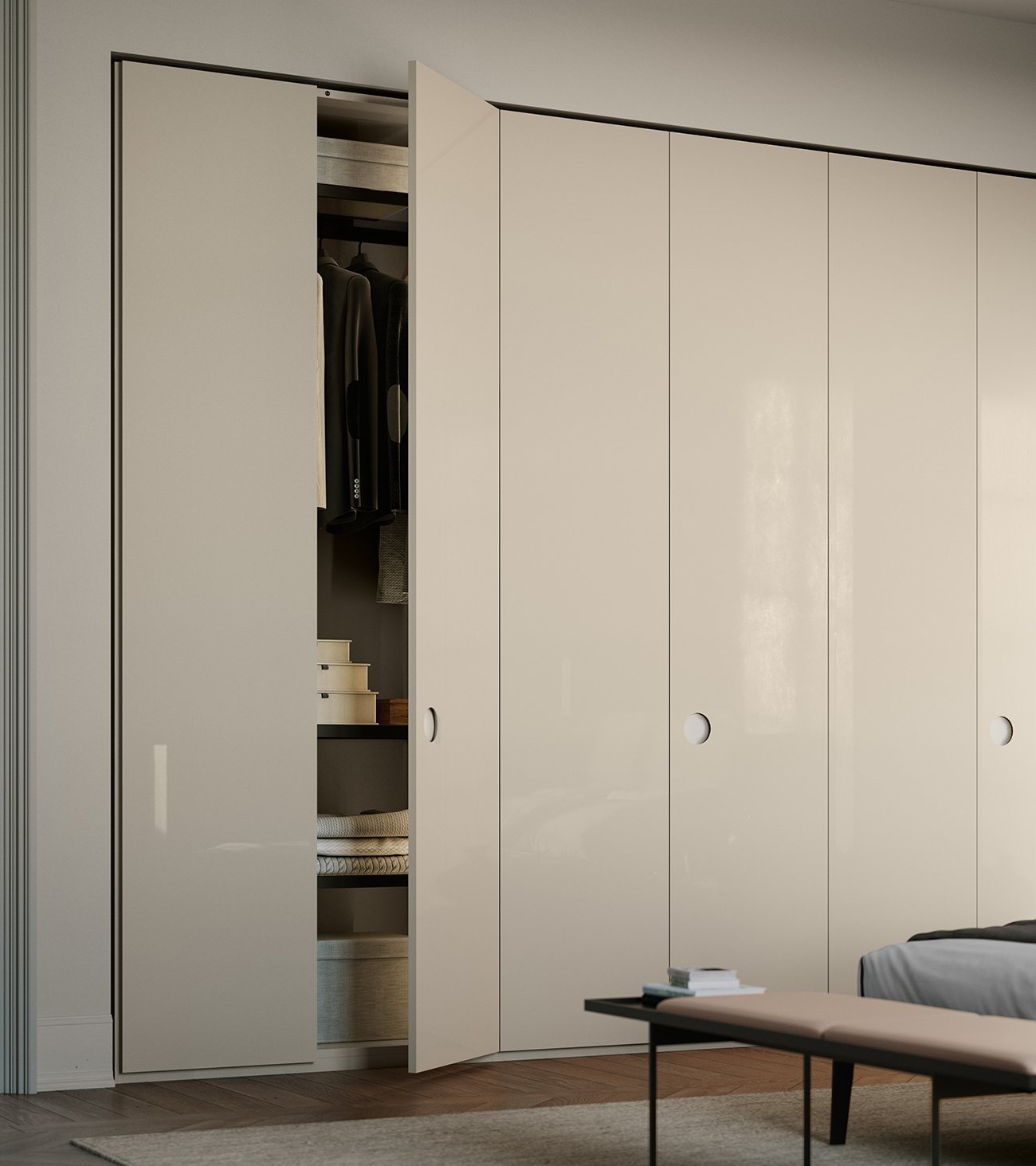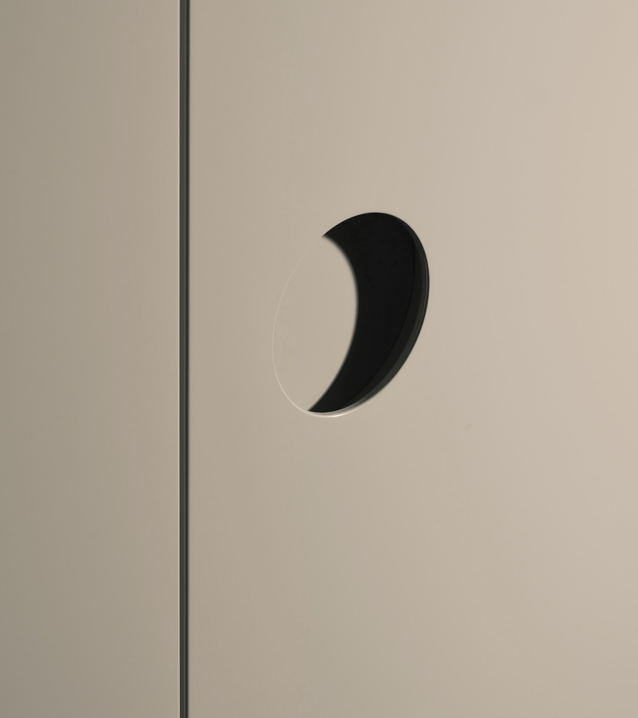Elegance and functionality meet like light and shadow in Eklissy, the Made-to-Measure Wardrobe designed by Piero Lissoni. The hinged door features a circular handle carved into its thickness, a stylistic detail that captures the light and creates an interplay of shadows reminiscent of the phases of an eclipse—the inspiration behind the entire project.