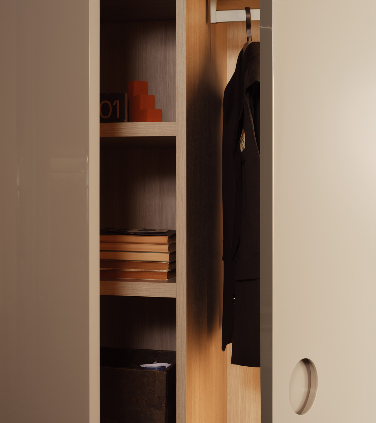 Available in a matte or glossy finish, Eklissy can be customized in every detail: the extensive range of finishes in the catalog allows you to create a wardrobe tailored to your individual style, personalizing both dimensions and colors. The base of the handle, finished in matte lacquer, can either match the door or contrast with it, allowing for unique and personalized color combinations. The interior spaces can be fitted with drawer units, shelves, and clothes rails with integrated lighting, enhanced by luxurious leather and fabric details such as drawer mats and shirt boxes for the dedicated compartments.