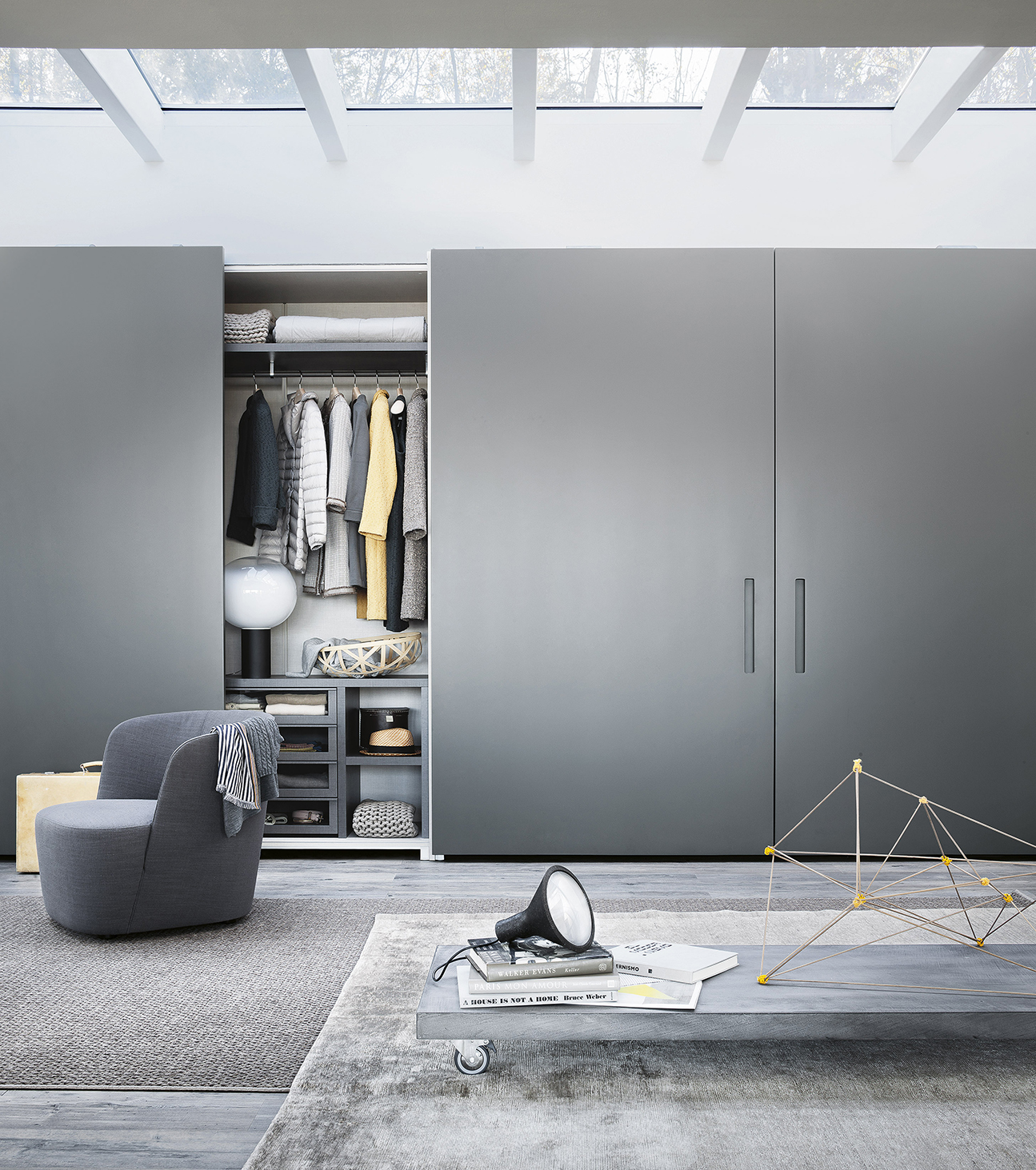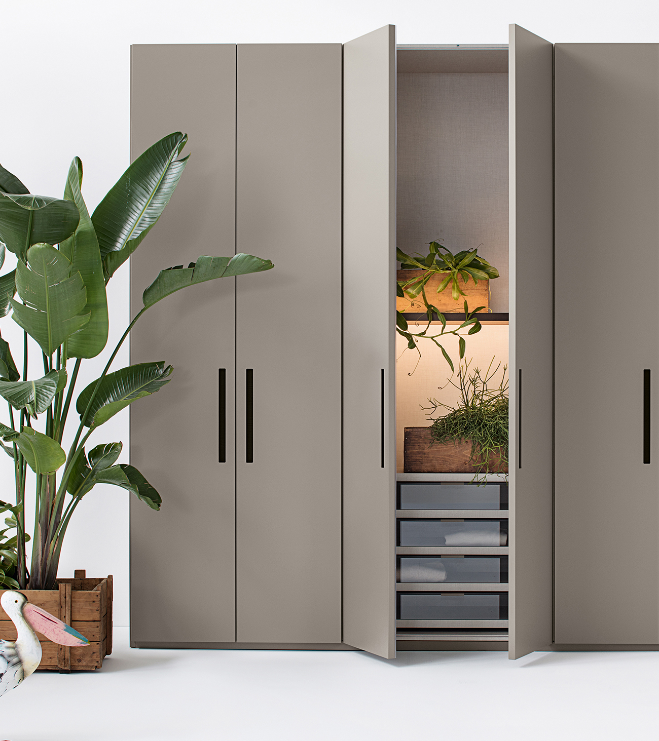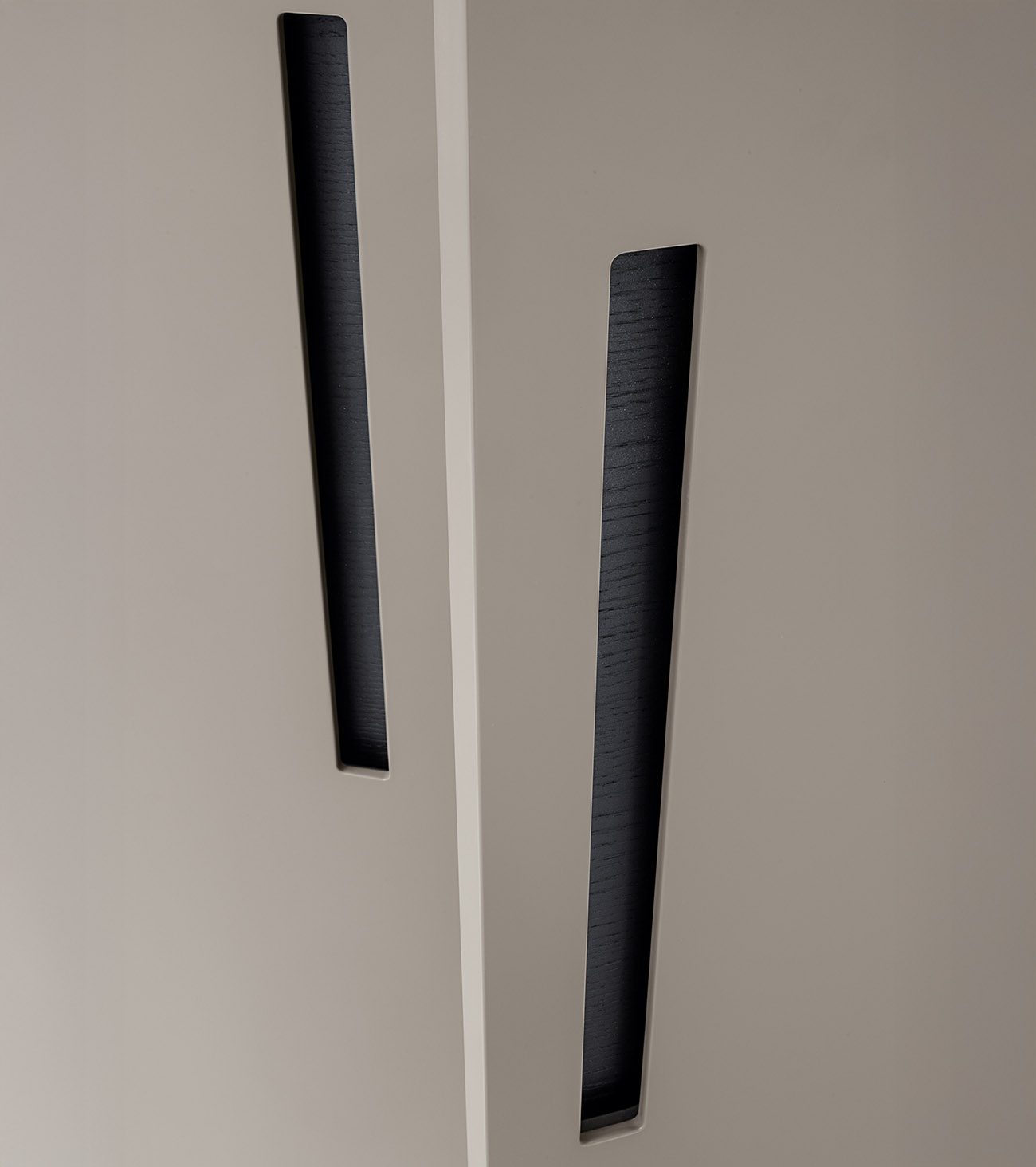 A minimalist solution, the Ellevi Armadio al Centimetro by Officinadesign Lema effortlessly integrates with understated elegance into any interior setting. Its distinctive stylistic feature is the vertical handle, crafted within the thickness of the door, with a background either tone-on-tone or in contrast with the door’s finish. Ellevi can be customized in depth and is available with glossy or matt lacquered doors in hinged, sliding, and flush versions. The sophisticated folding opening system allows for the alignment of the flush doors on a single plane, offering the aesthetic advantage of a perfectly continuous surface, free of any protrusions or recesses.