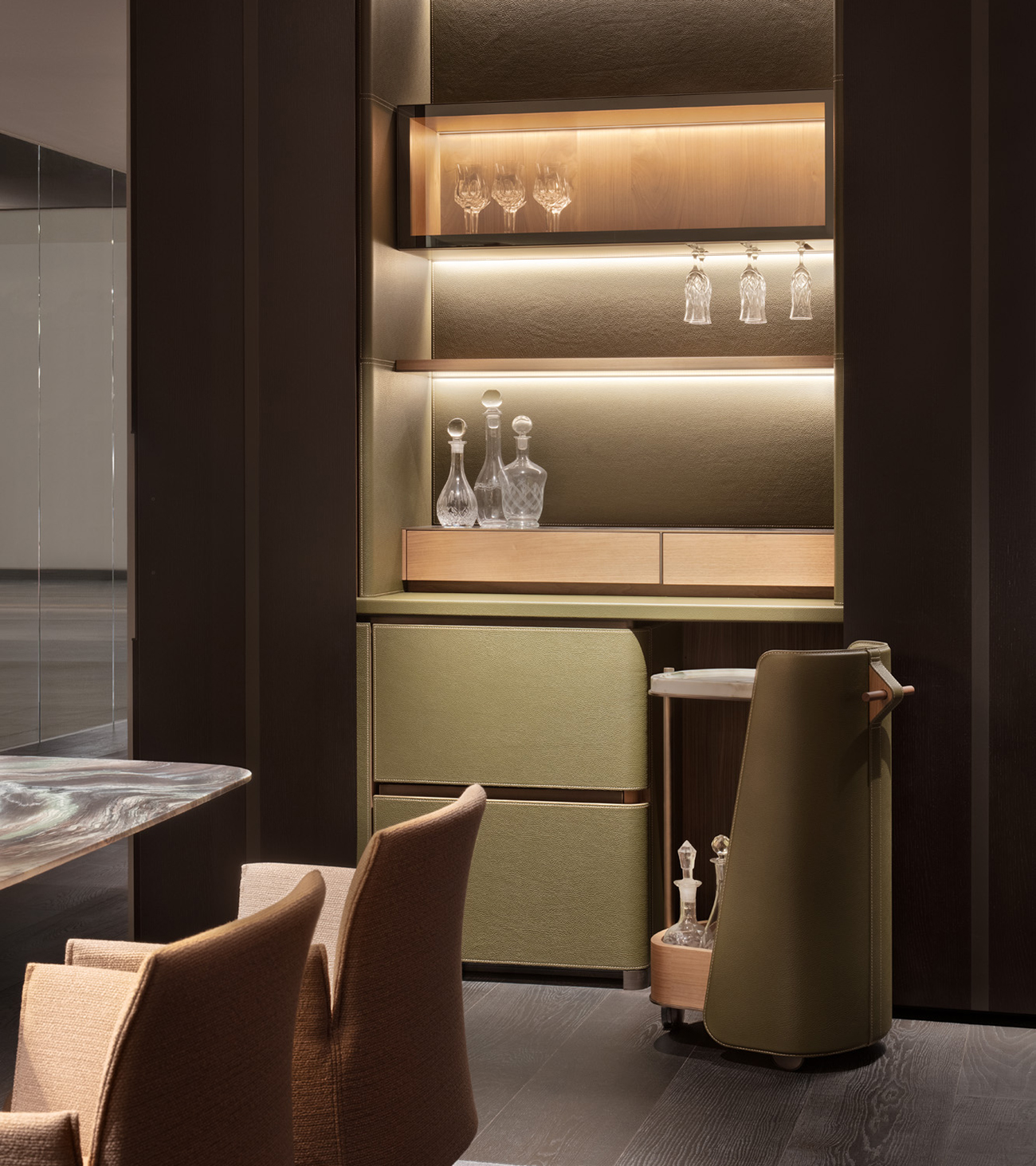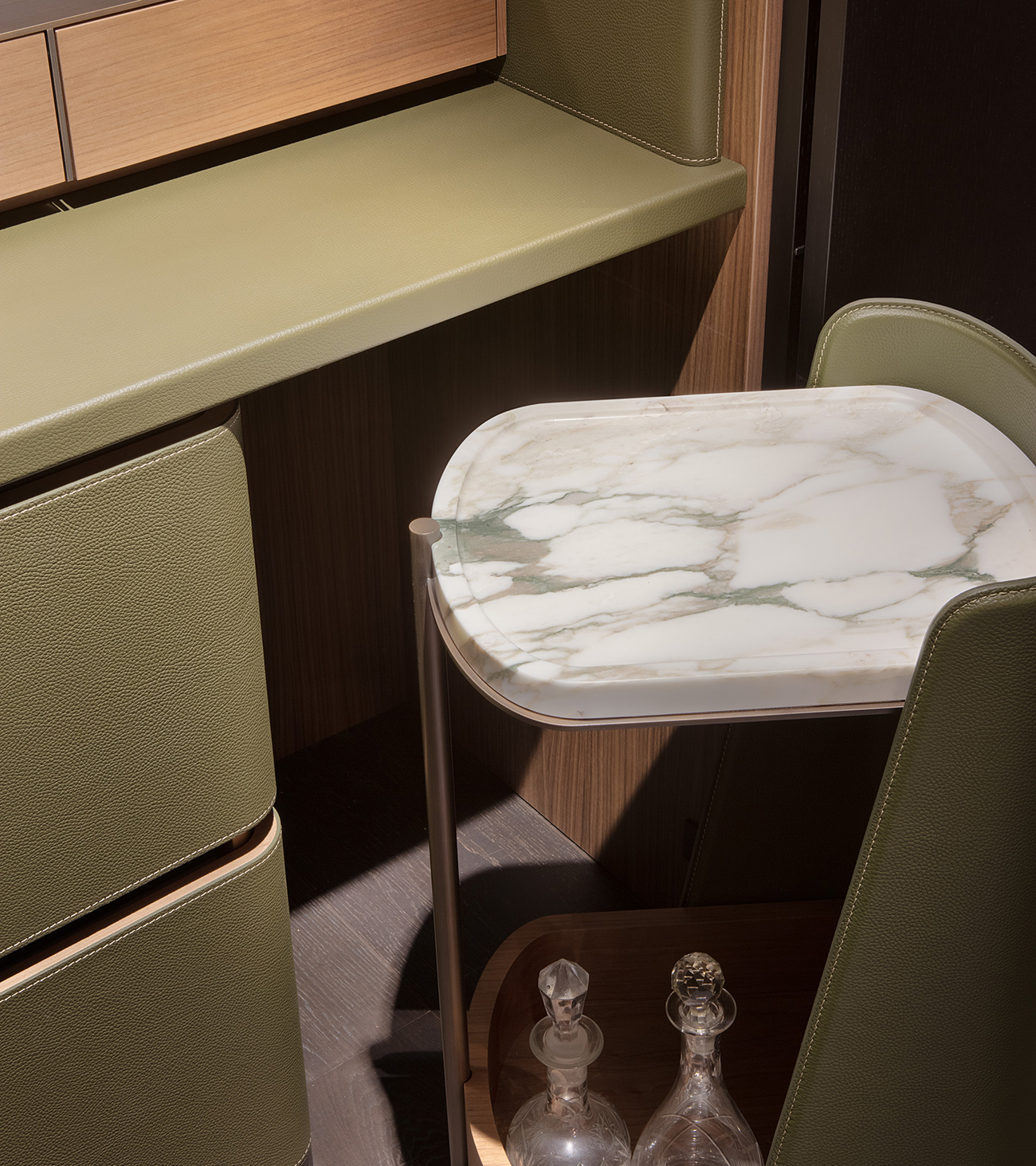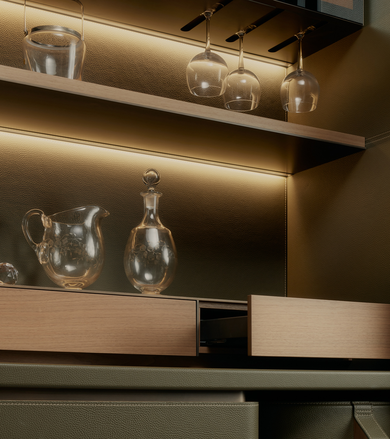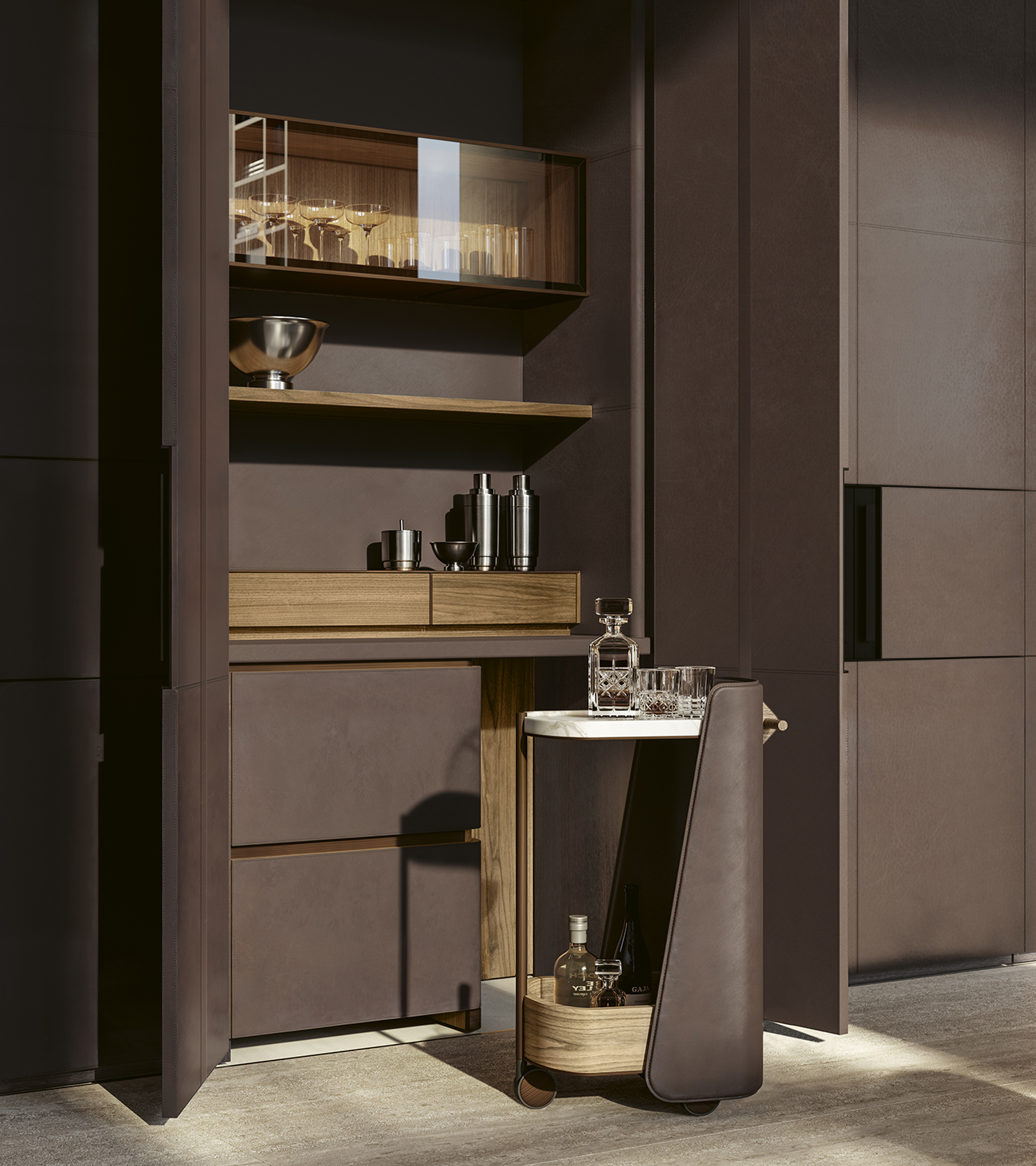 The paneling, upholstered in leather or hide —a distinctive feature of Eureka— conceals a mix of elements that frame elegant glassware and fine bottles of spirits. Customizable in every detail and fully equipped to meet any requirement, Eureka is completed by a retractable trolley positioned near the dedicated space designed to accommodate the finest refrigeration technologies.