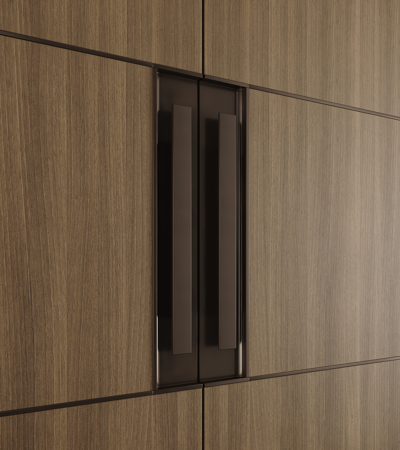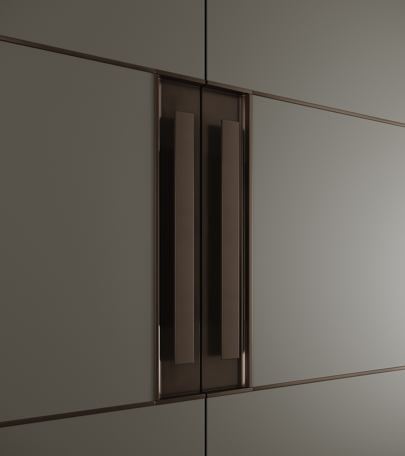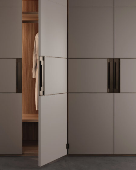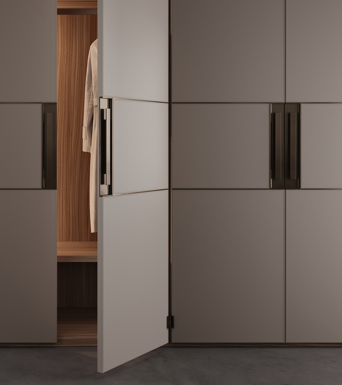 Elegance expressed in every detail makes Eureka the ideal bespoke system for safeguarding your garments—a discreet everyday companion that reveals its personality through a perpetual balance of aesthetics and functionality. Designed by Steve Leung, the wardrobe features a hinged door with a bronze handle, expanding the range of LEMA components available to create your wardrobe tailored to your personal aesthetic and spatial needs.