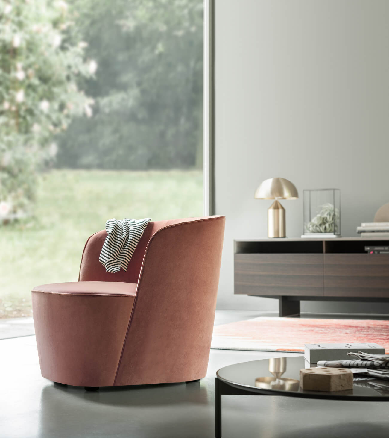 Great sophistication and compact dimensions distinguish Felix, designed by Roberto Lazzeroni. This discreetly styled lounge chair features soft, rounded shapes with no sharp edges.