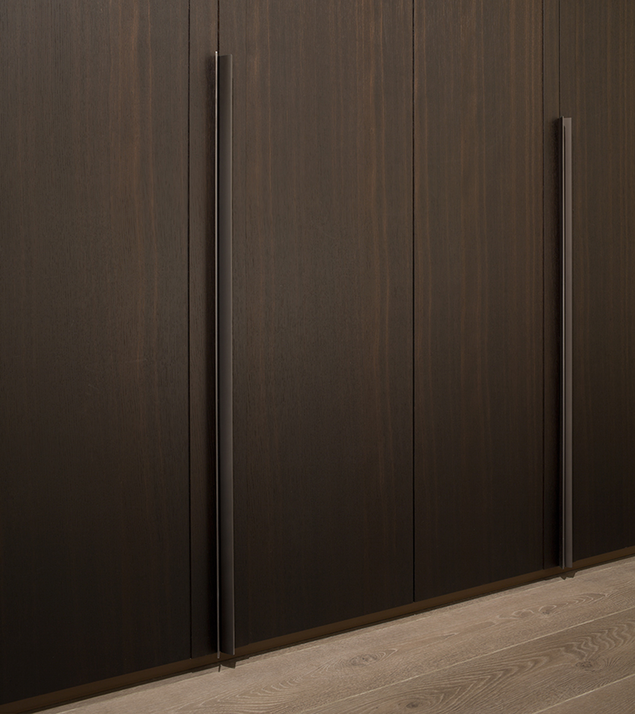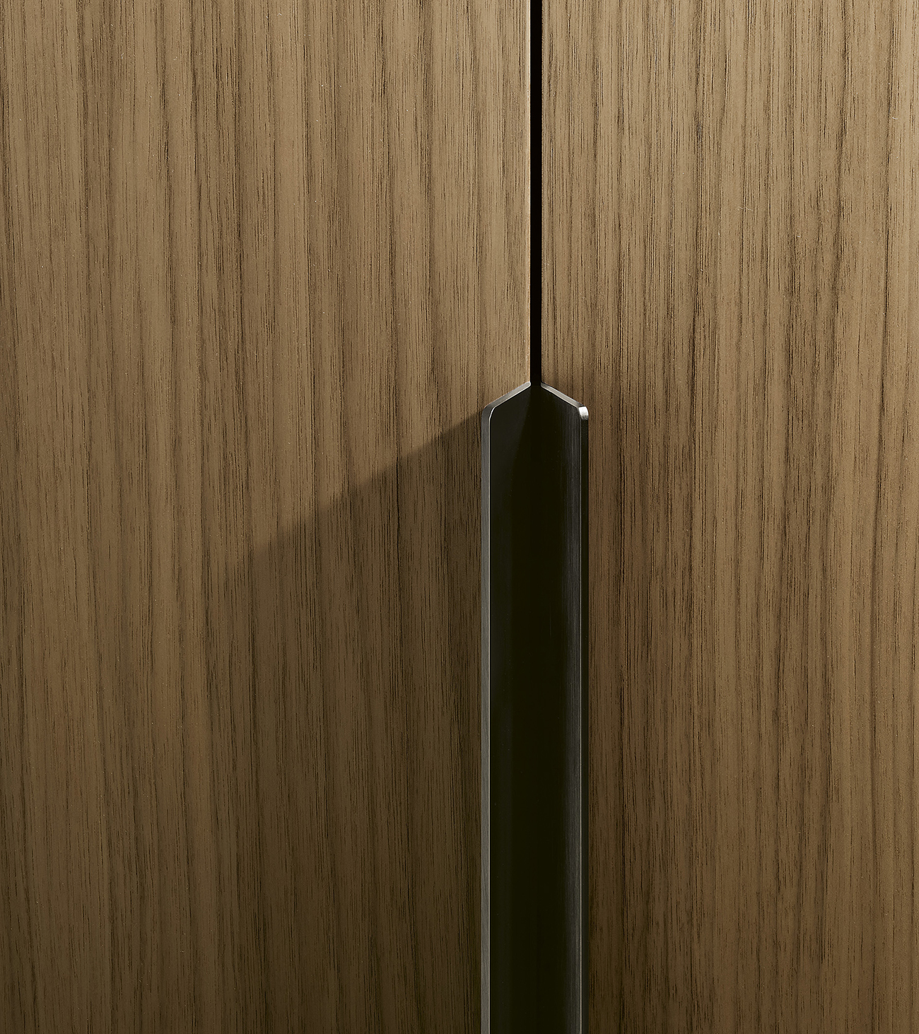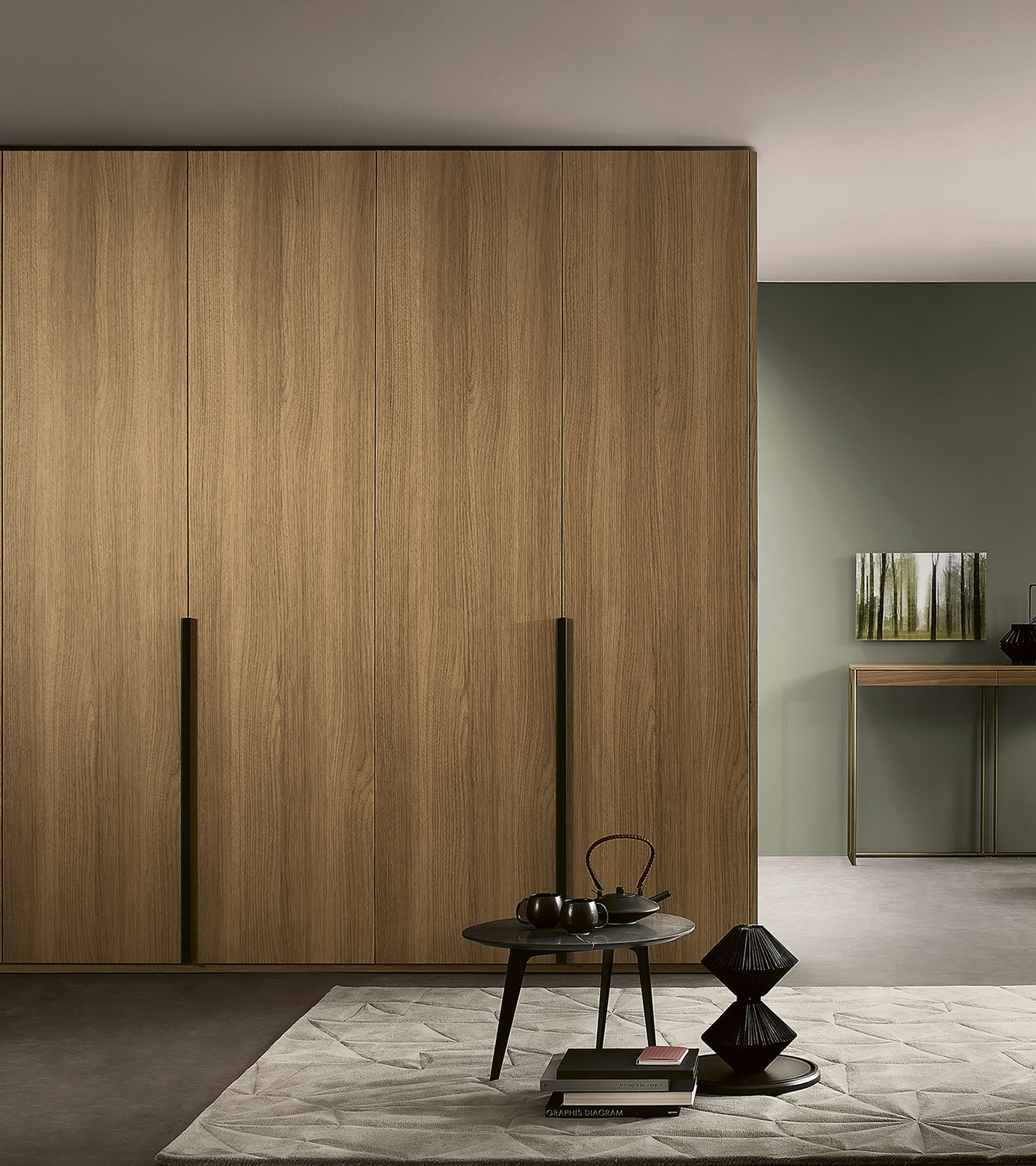 The Flago custom wardrobe by LEMA, designed by Officinadesign Lema, features 25 mm doors in MDF tupan or melamine panel with melamine finishes, matte or glossy lacquer, and versions in fine wood. The handle with a cut in painted aluminum in bronze epox M421, palladium M491, or matt LCT creates a continuous, understated, and elegant line. Available with hinged doors and customizable in width, height, and depth, also in a corner version.