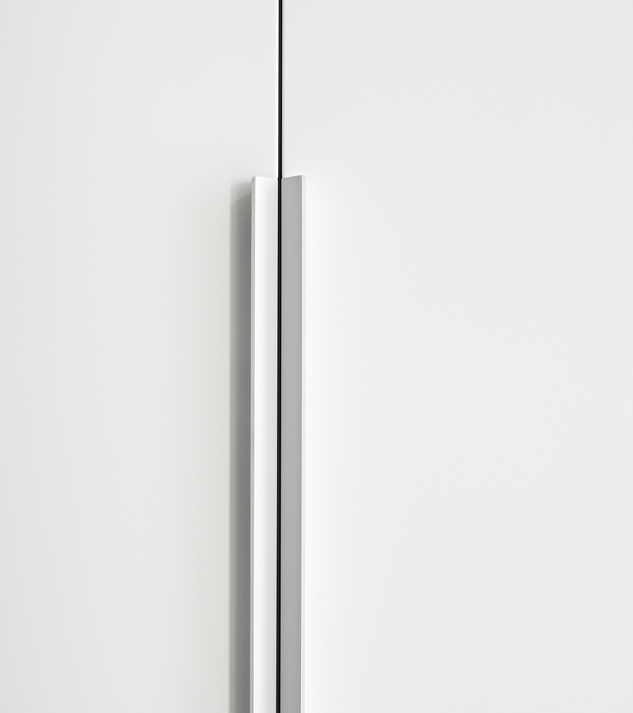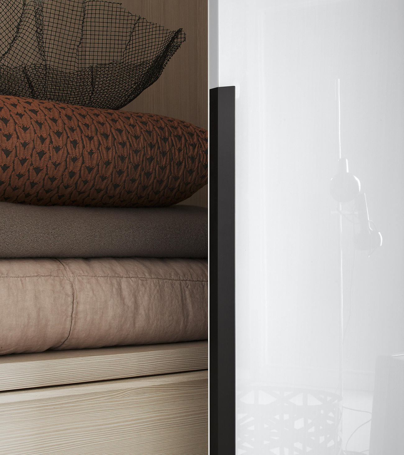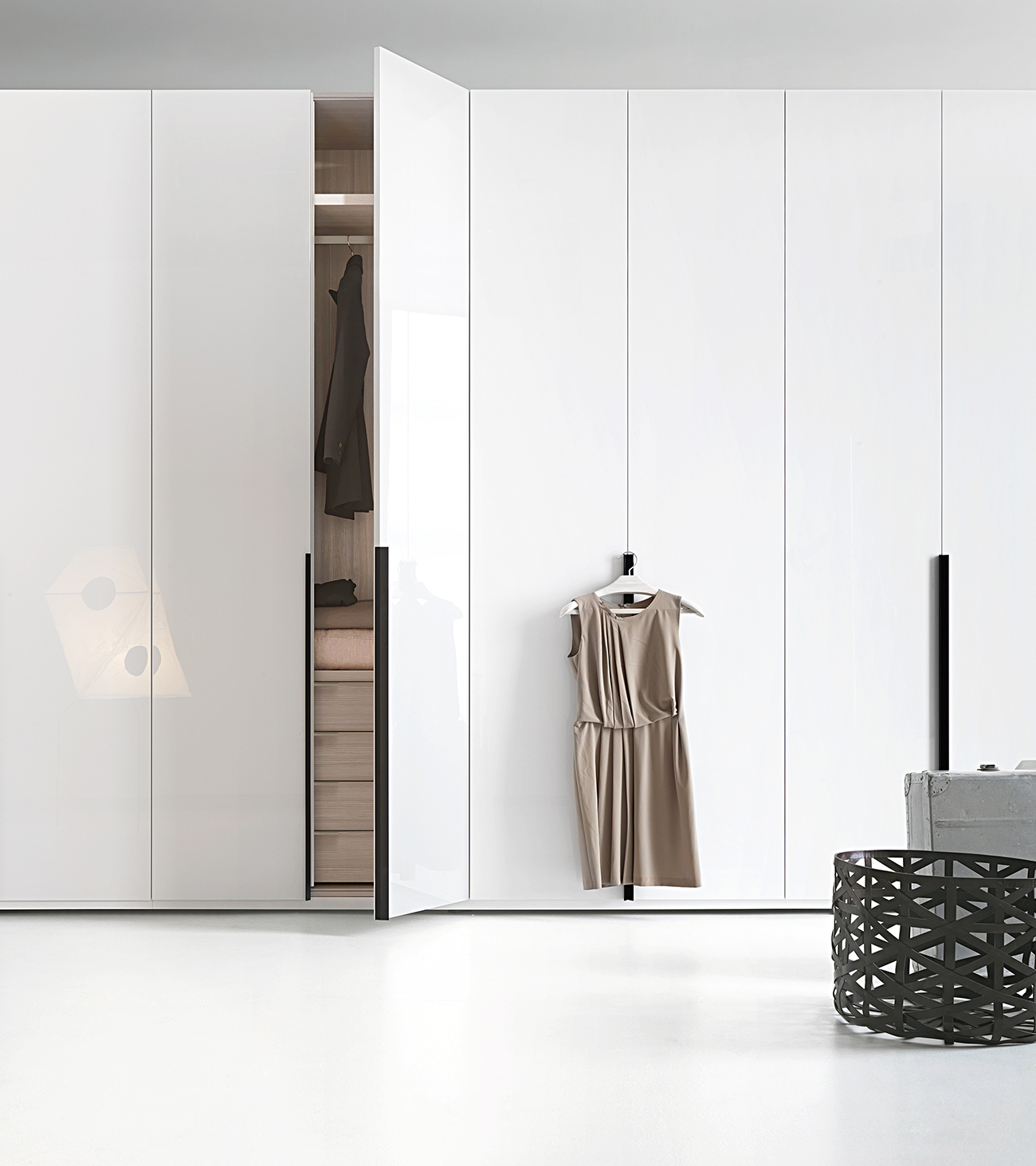 Essential character for the Flago Made-to-Measure Wardrobe by Officinadesign Lema, which is distinguished by its glossy and matte lacquered doors, characterized by the elegant detail of the light and slender line of the handle in bronze anodized aluminum or lacquered in the same color as the door. Versatile and customizable, Flago is a made-to-measure wardrobe with hinged doors that can be reduced in height, width, and depth, and is also available for corner solutions.
