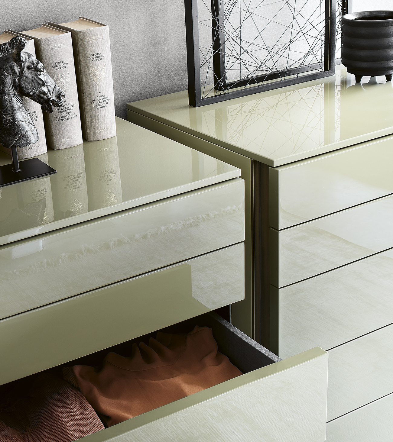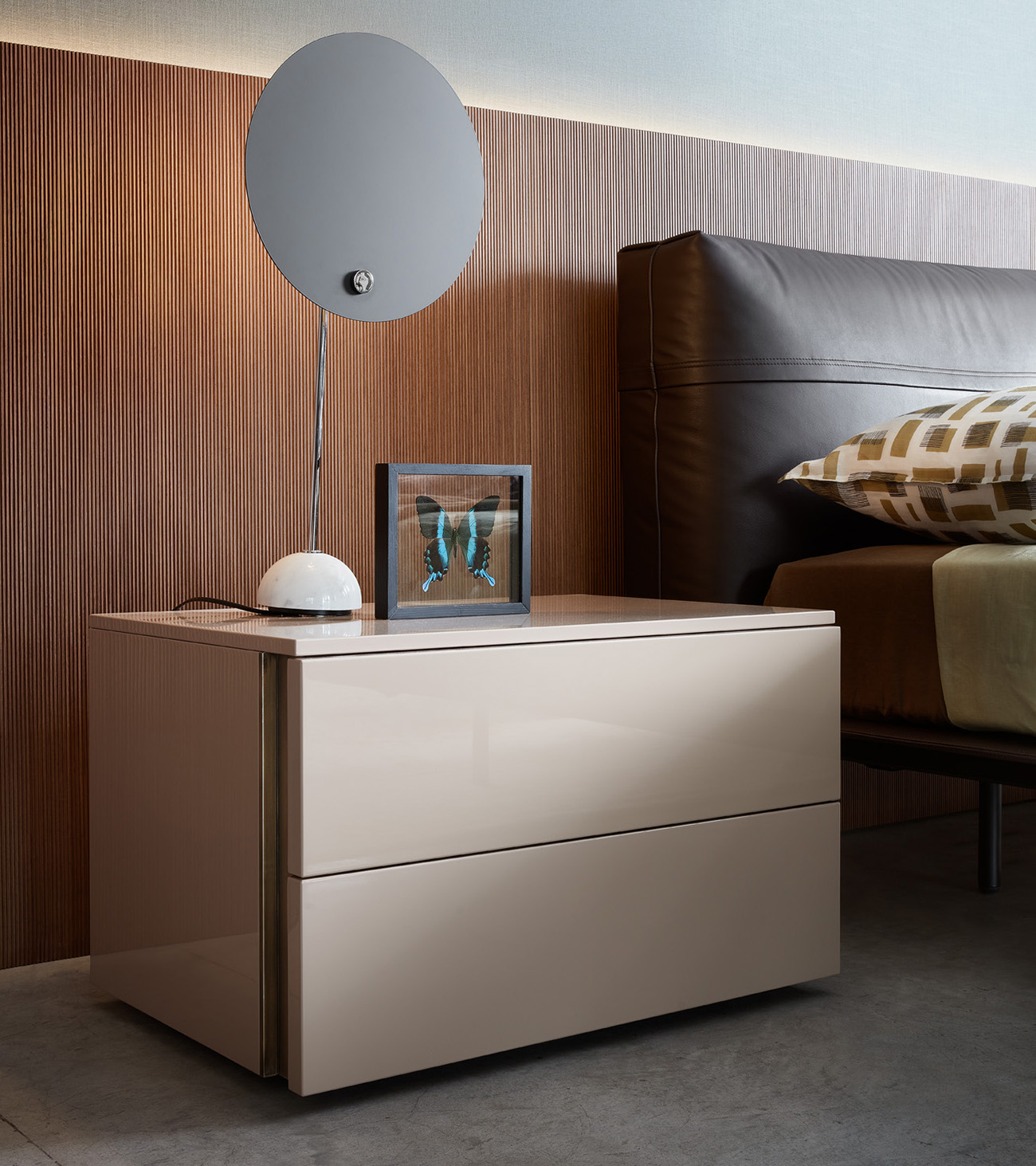 Attention to proportions, slight shifts in the alignment between the parts, and the material palette enriched by tops in wood, glossy or matt lacquer, or natural stone, distinguish a group of sober and elegant products, easy to pair with different beds.