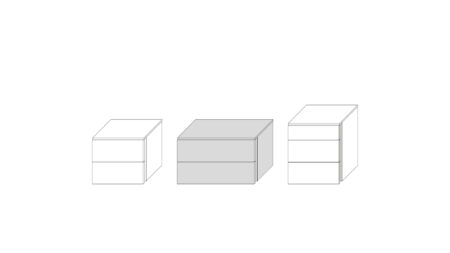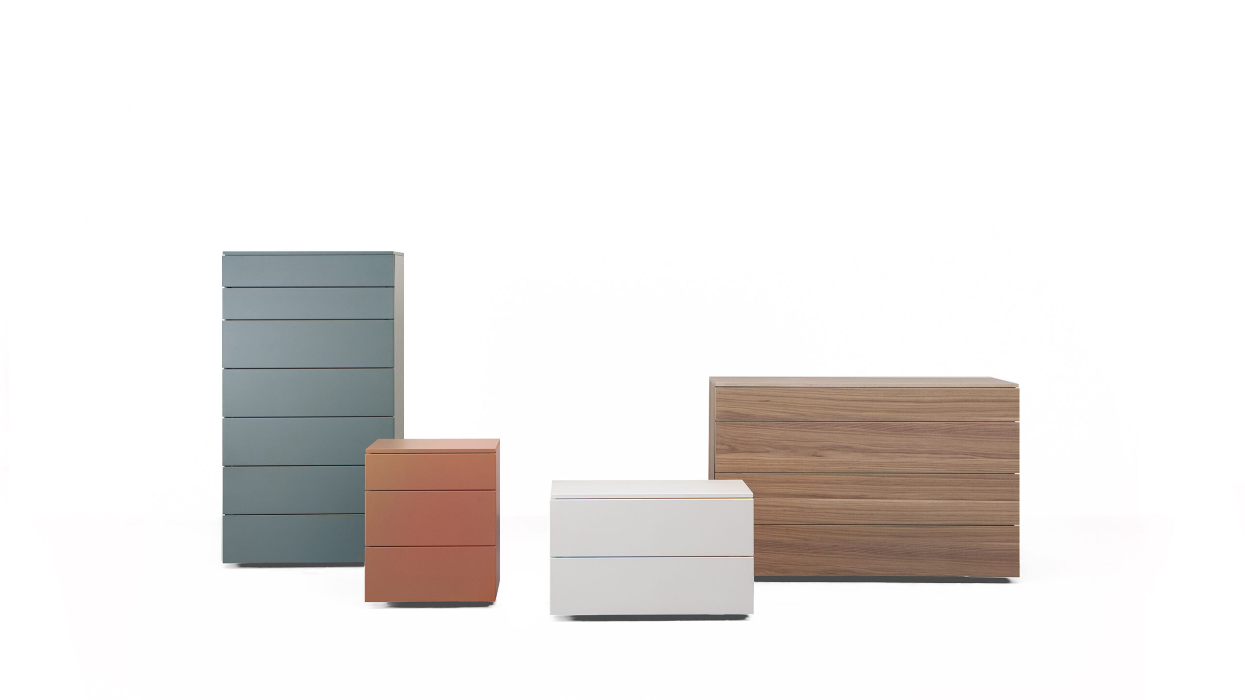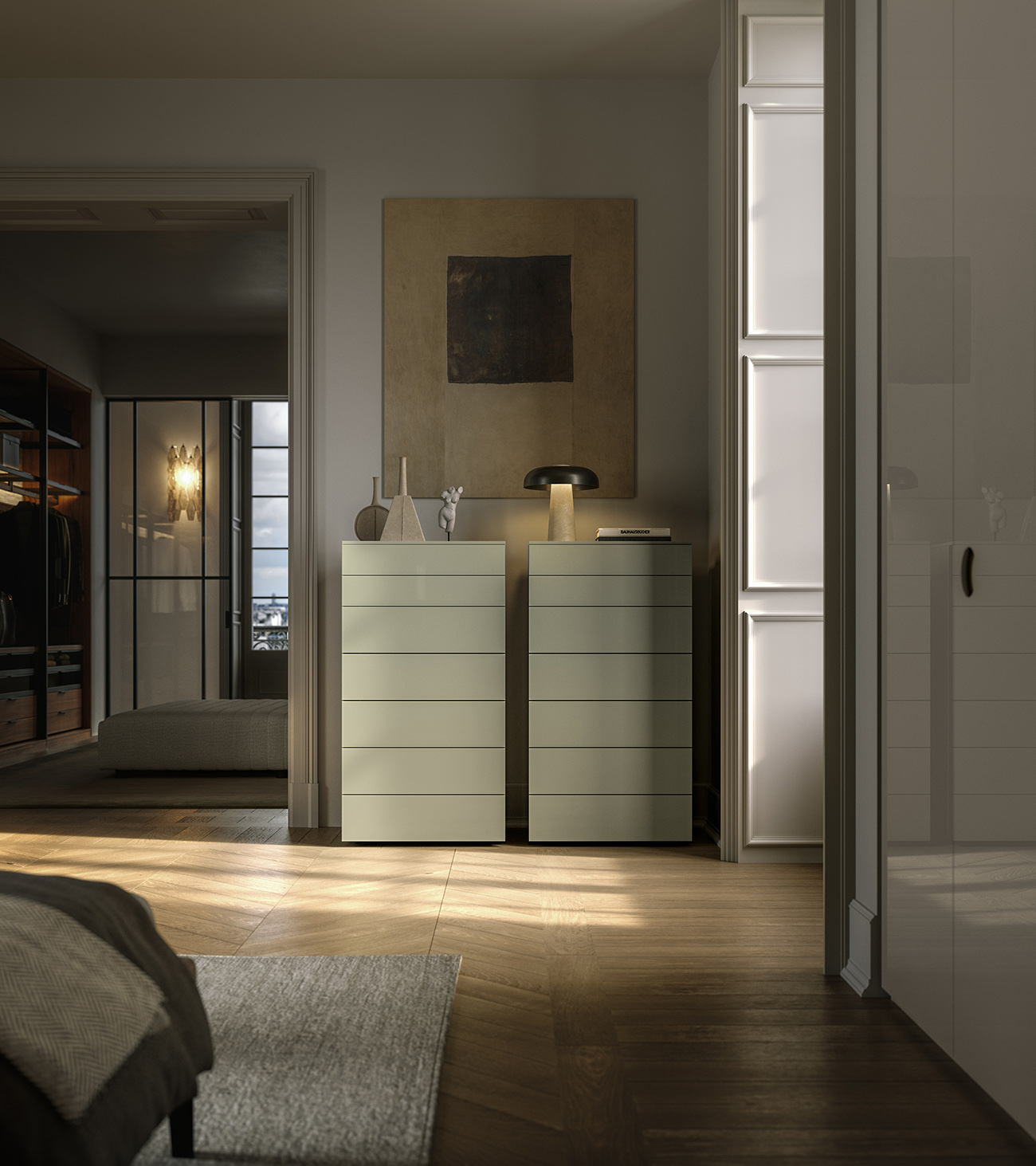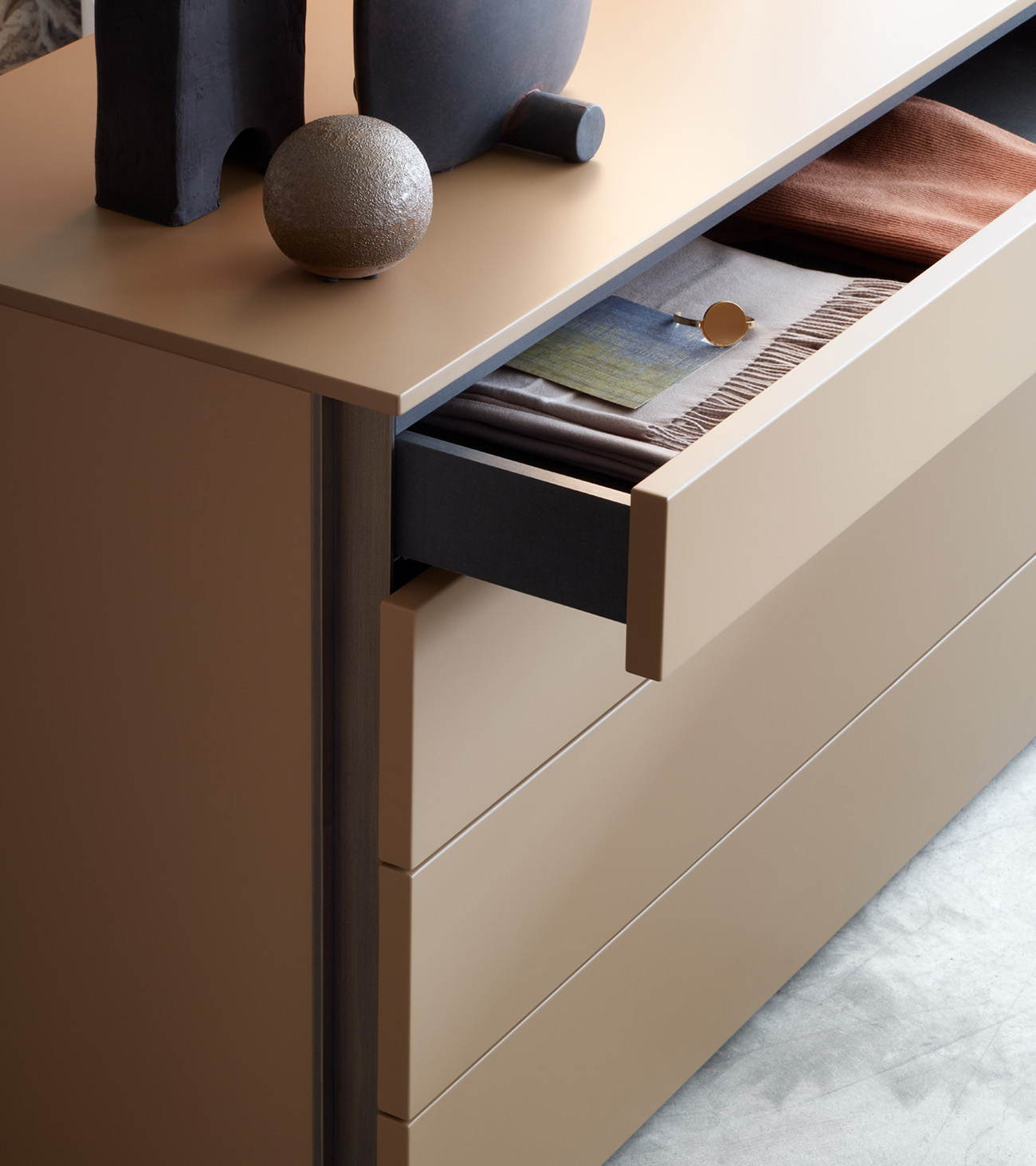 Florens is a group of drawer units, bedside tables, and tall chests placed on the floor, highly spacious, that fit with discreet charm into the sleeping area. Strict geometric purity of essential and compact volumes, monoliths of material and color marked by the cut of the recessed handle profile, sometimes on the side and other times in the center.