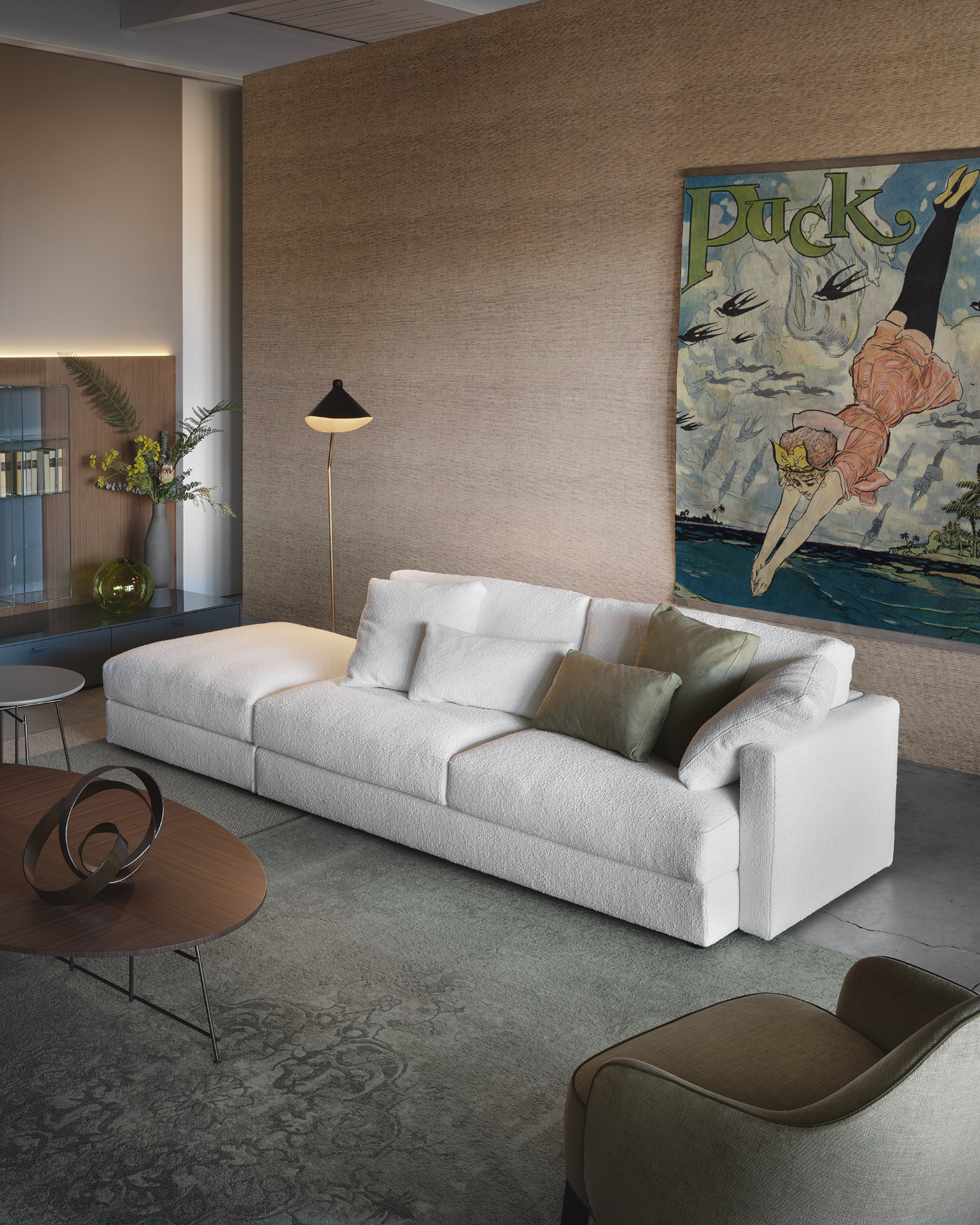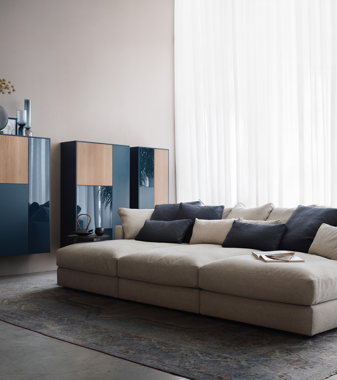Glee is a modular floor sofa distinguished by its essential lines and soft volumes. Capable of fitting into any environment and dialoguing with any style of décor, Glee makes versatility its hallmark, adding a touch of freshness and contemporaneity to spaces.