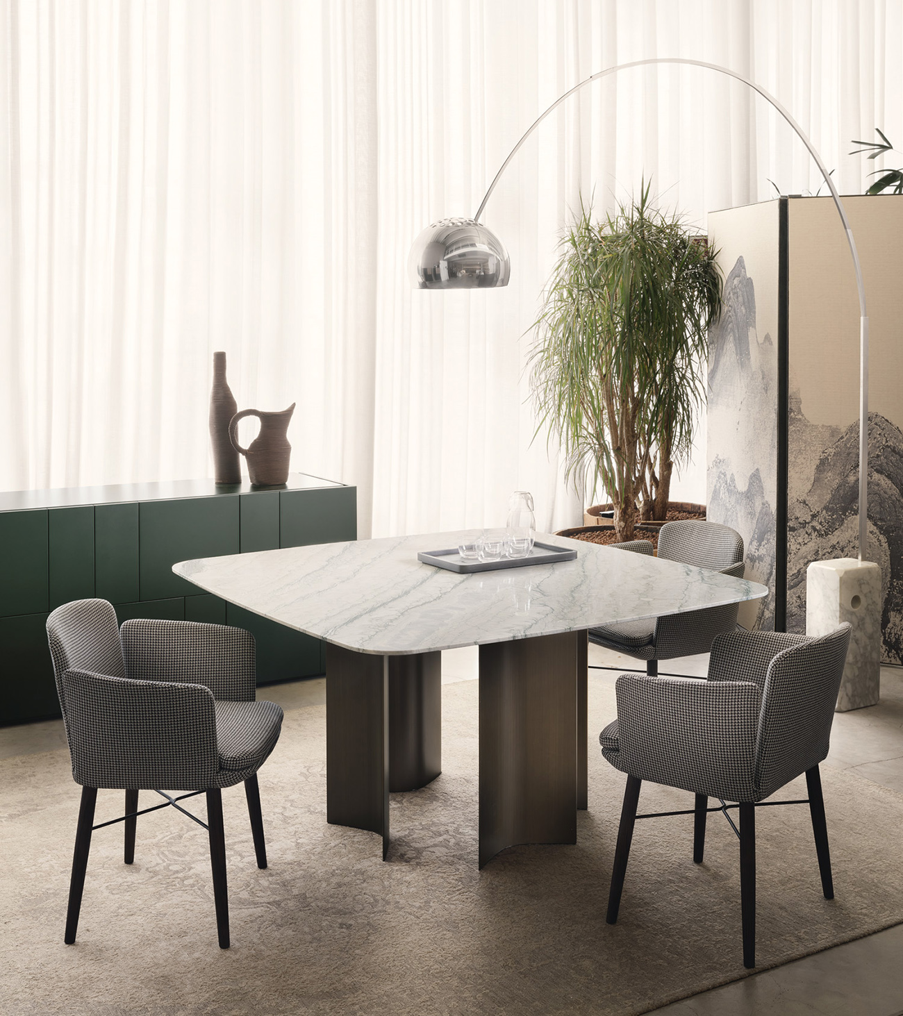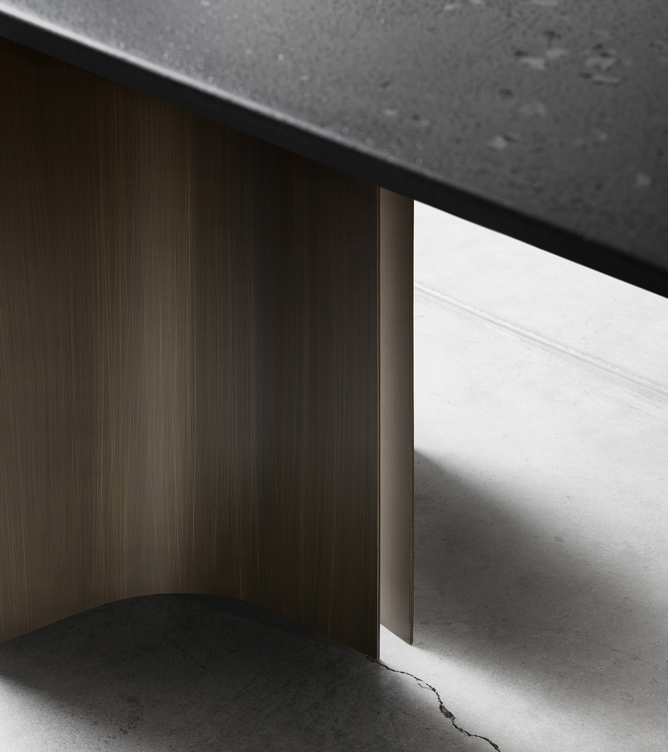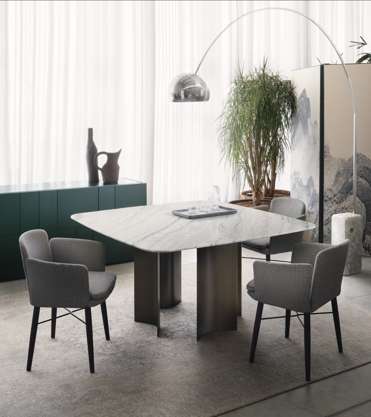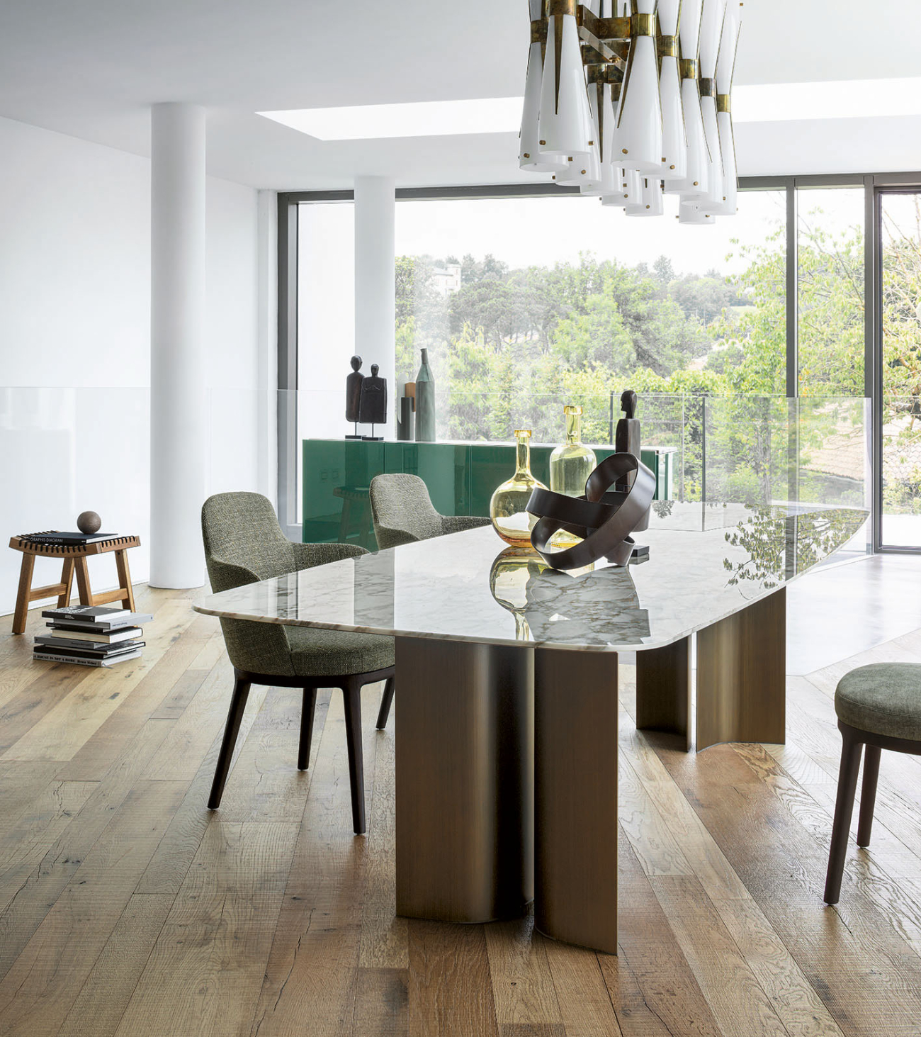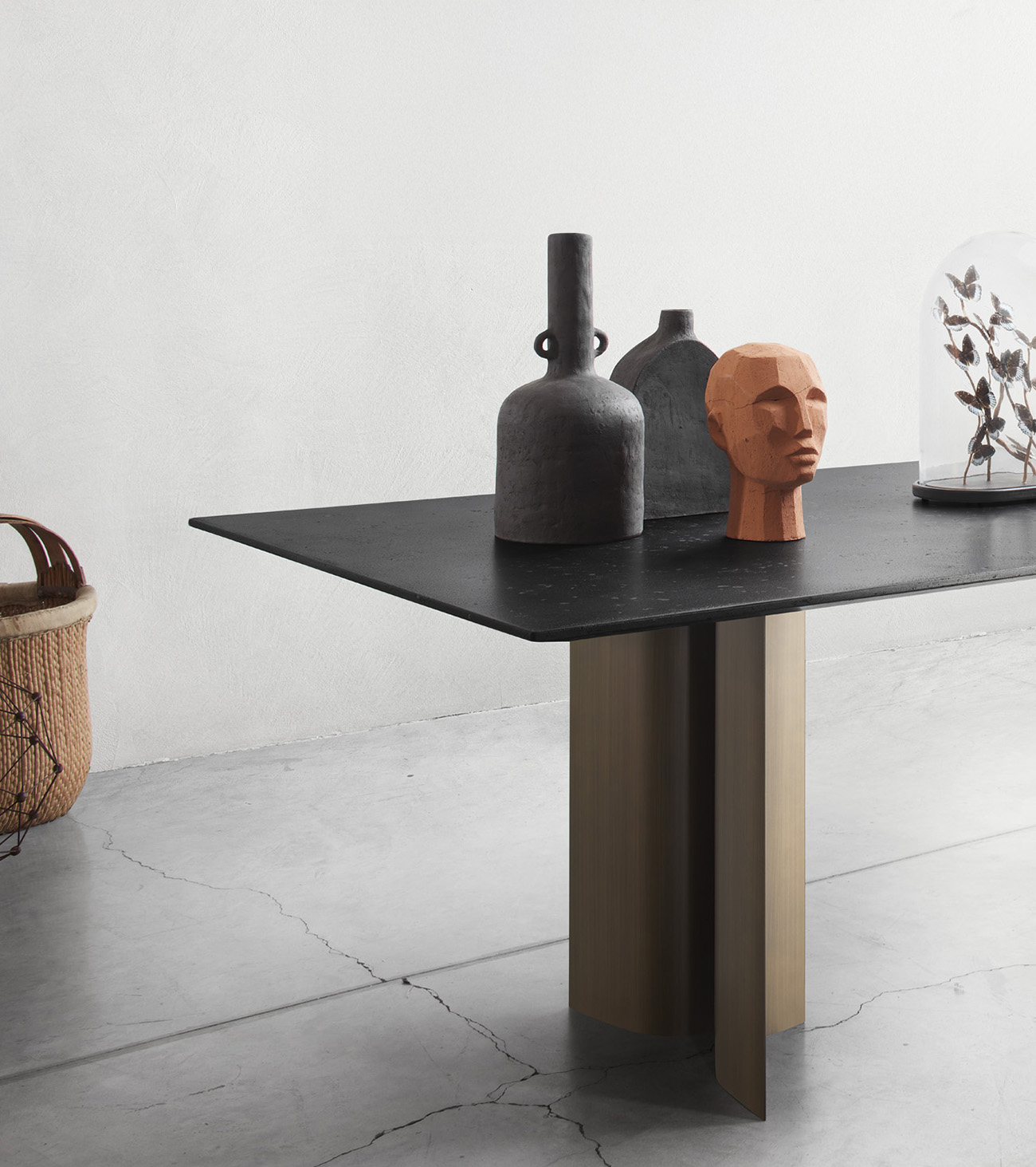 Gullwing is a table system born from the in-depth research of Gabriele and Oscar Buratti into the “complex essentiality” of curvilinear forms and the value of volumetric richness that springs from them. The project is characterized by the skilful combination of materials and the sculptural shapes of the base, which interact with light and space, generating chiaroscuro, reflections, and continuously shifting cuts.