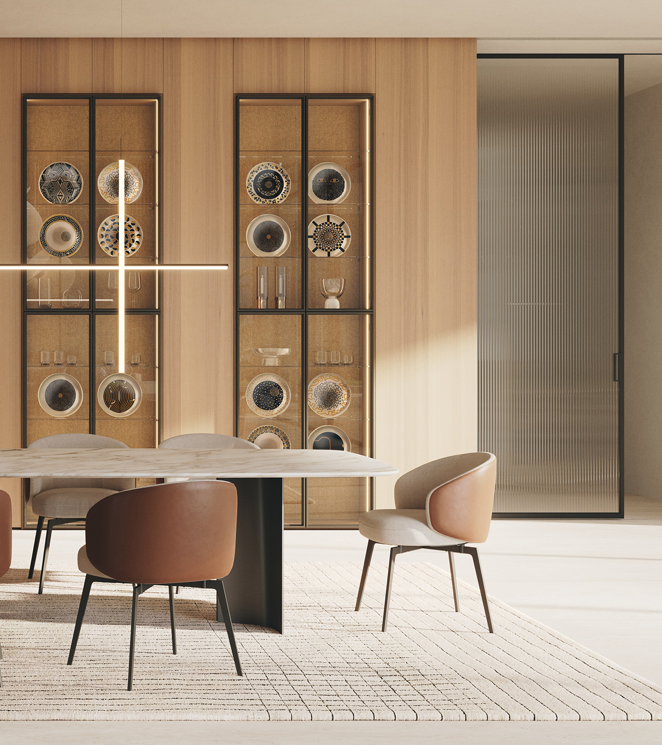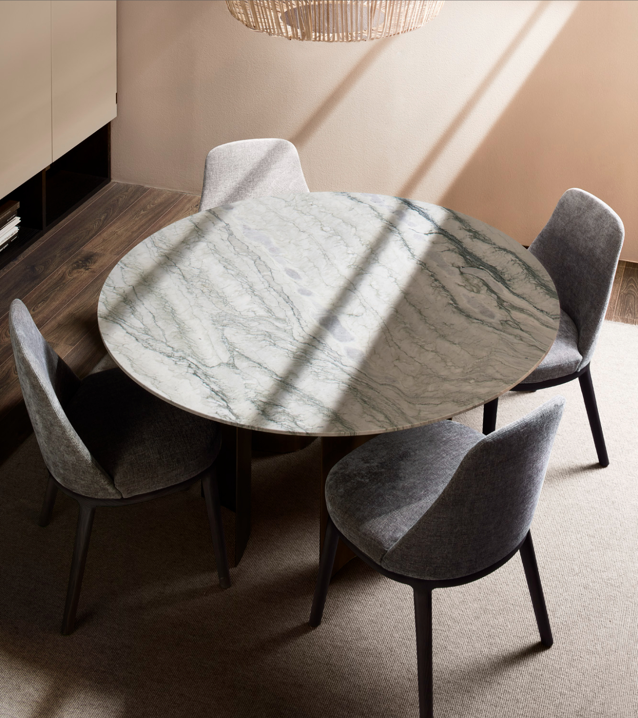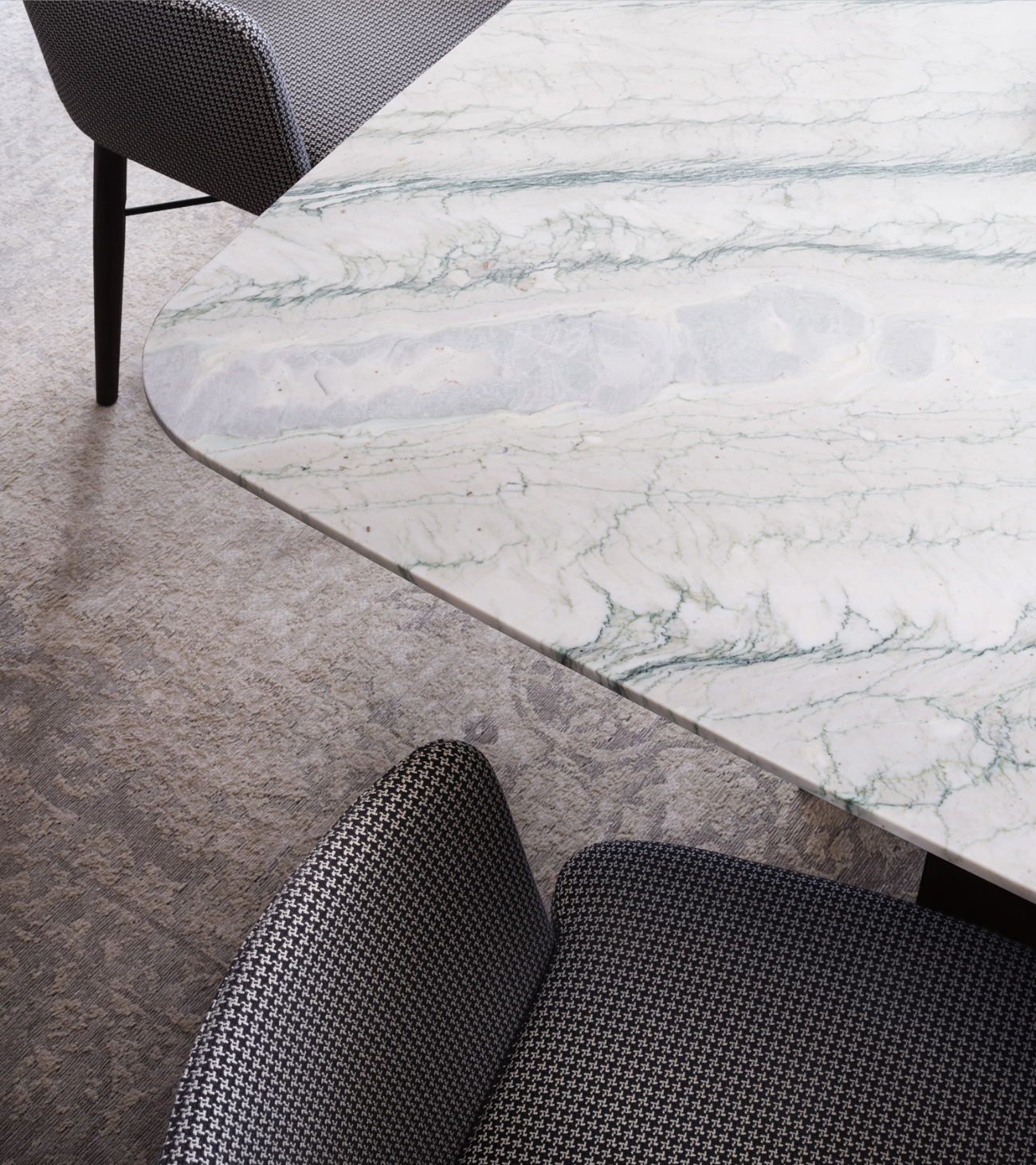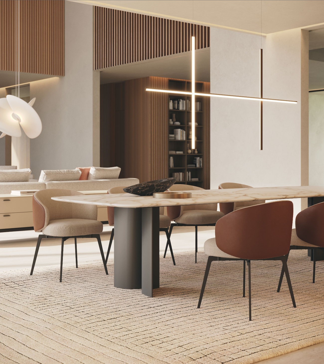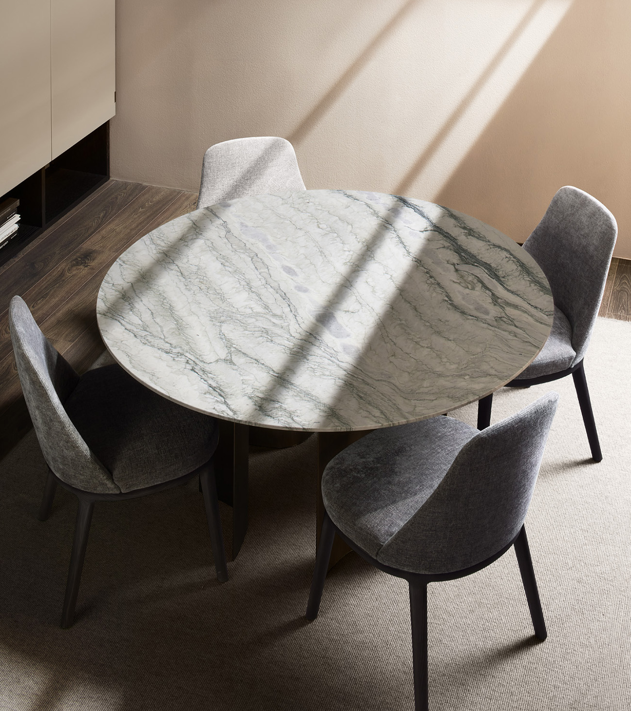 Gullwing is a table system born from the in-depth research of Gabriele and Oscar Buratti into the “complex essentiality” of curvilinear forms and the value of volumetric richness that springs from them. The project is characterized by the skilful combination of materials and the sculptural shapes of the base, which interact with light and space, generating chiaroscuro, reflections, and continuously shifting cuts.
