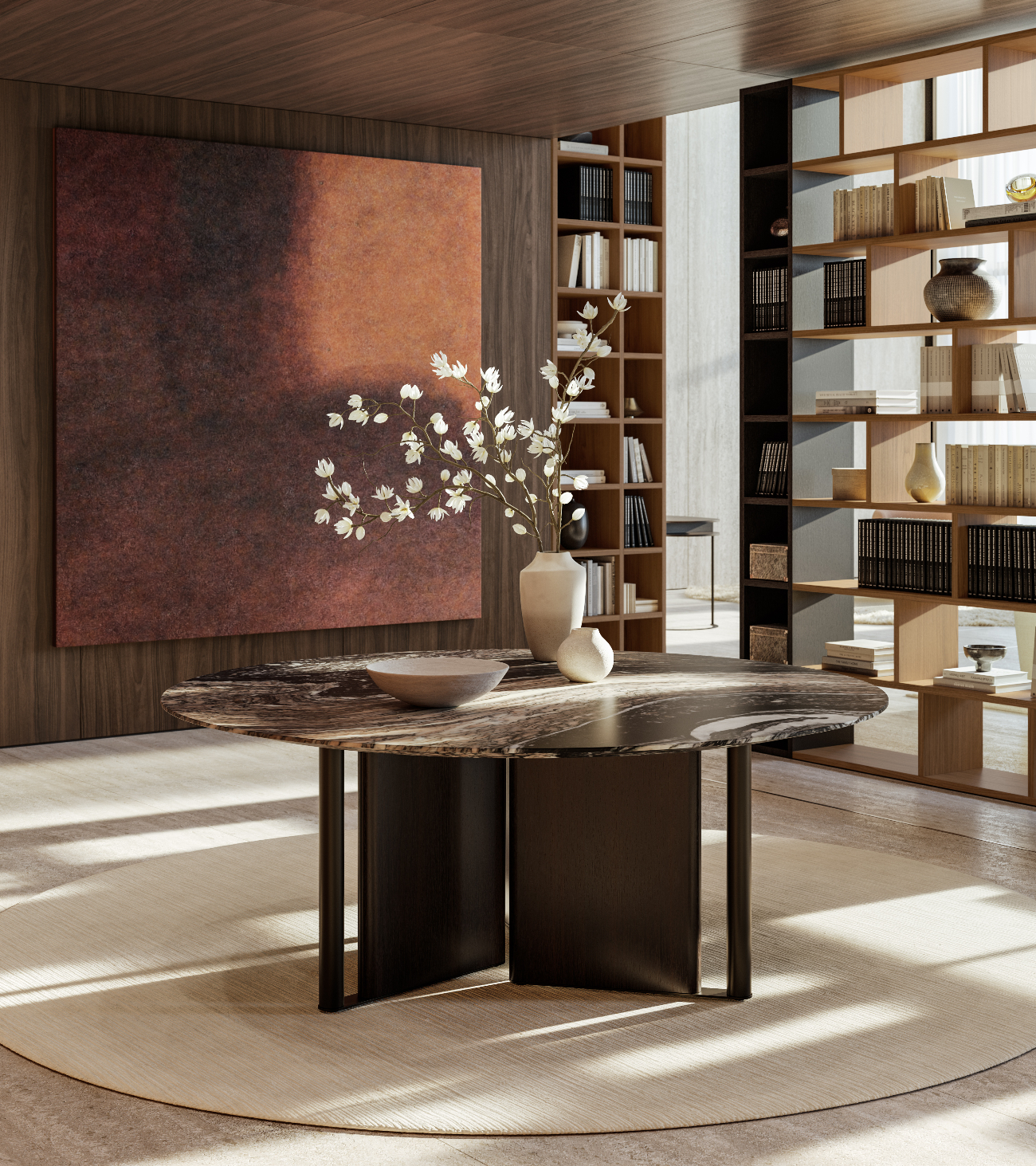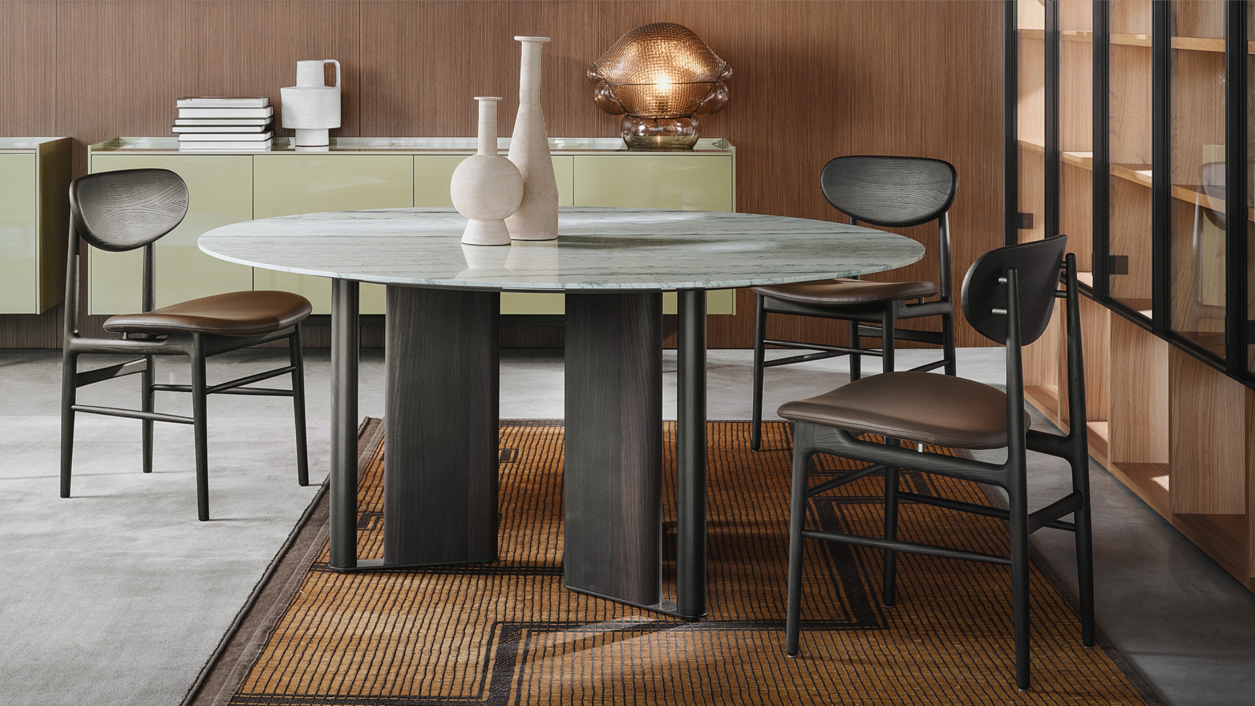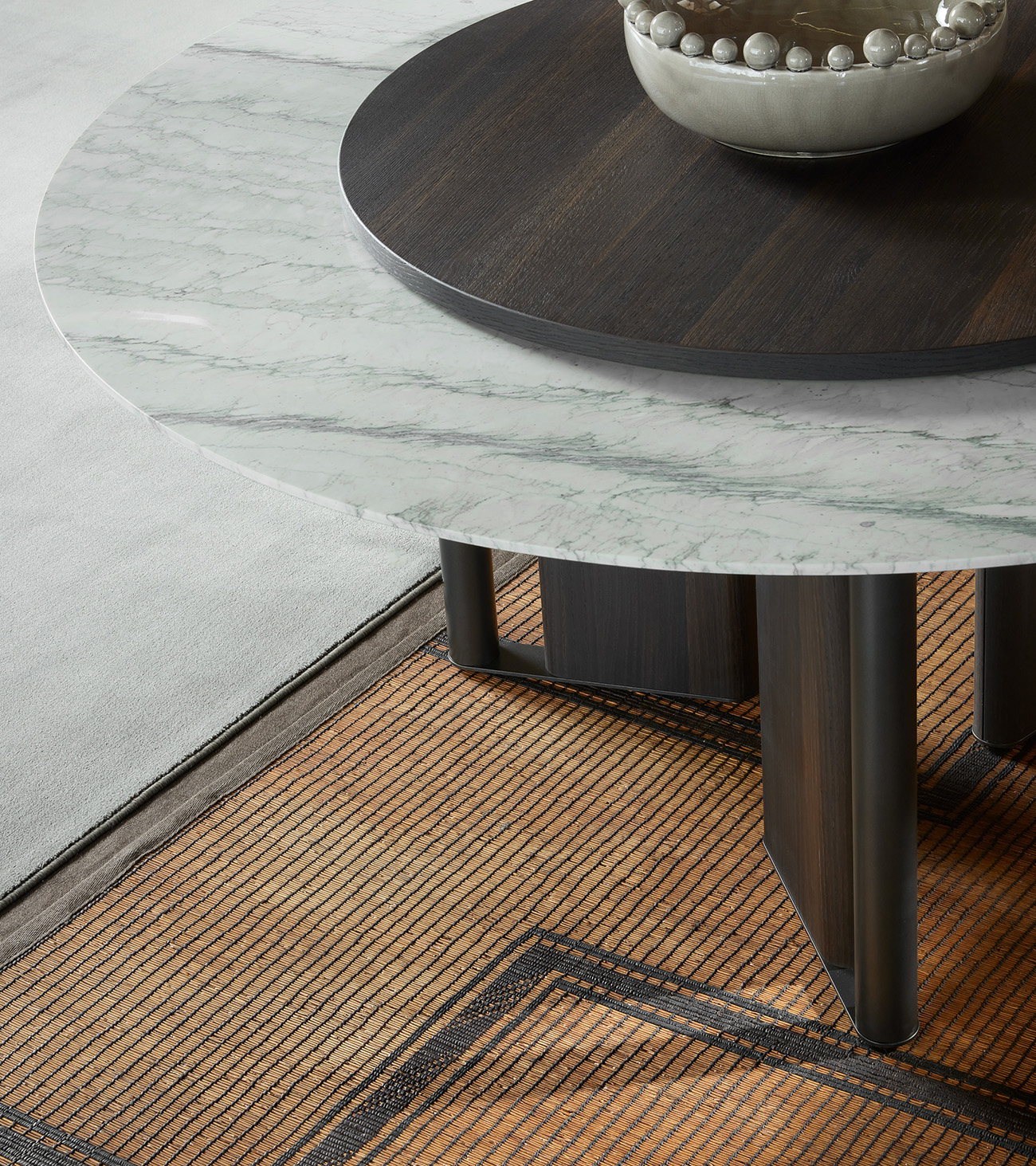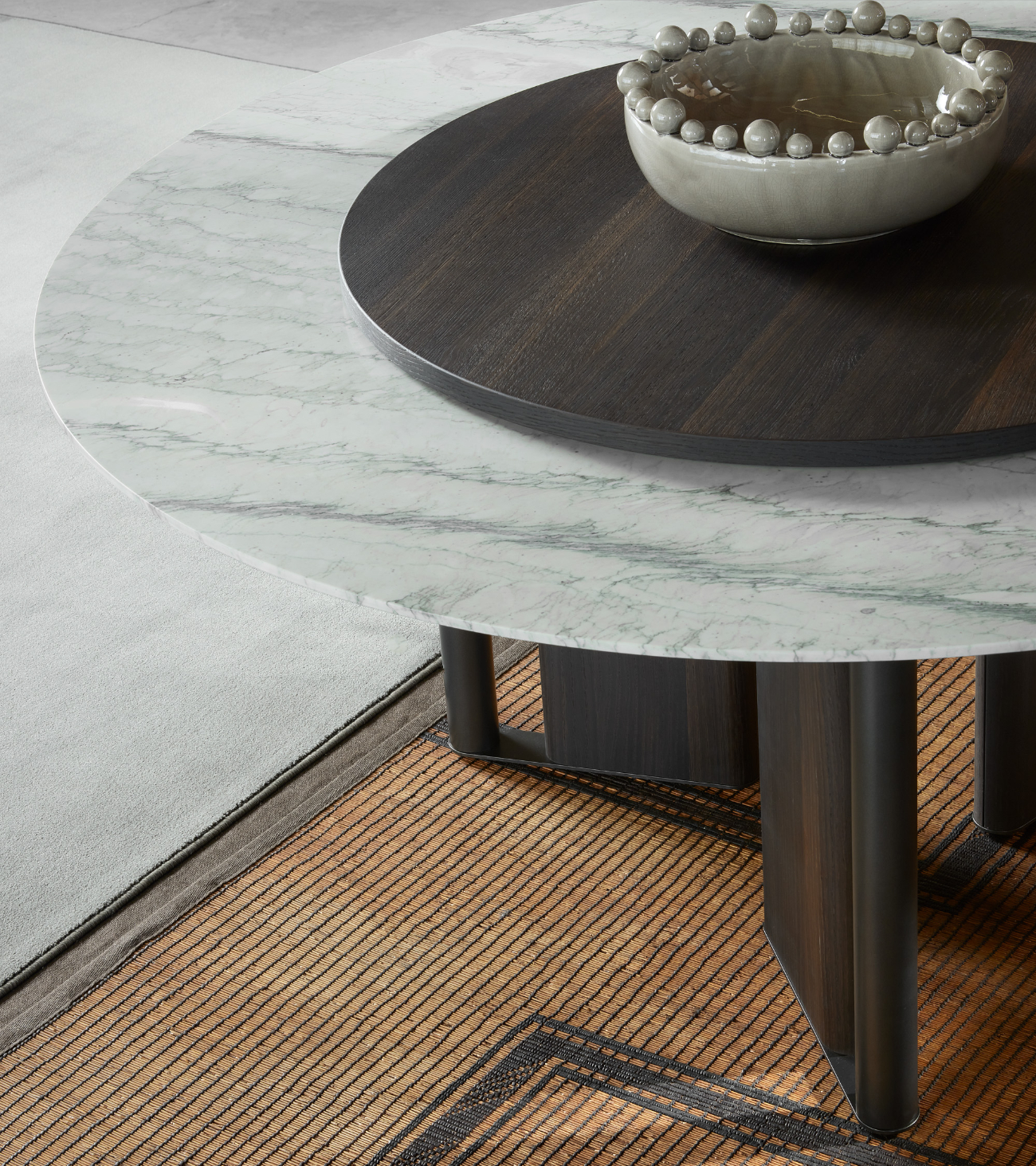 In-Between by LEMA, design Ximi Li, is a sculptural table characterized by a base formed from alternating elements that give lightness and two-dimensionality to the living space. The tabletop is available in different variants—wood, reconstructed marble, natural marble, stoneware, or clay—with artisanal finishes that make each piece unique. The surfaces, protected by specific paints, ensure resistance and durability. Main dimensions: Ø 1400-1585-1800 mm, H 730 mm. In-between combines certified materials, innovative processes, and Lema’s Made in Italy tradition.