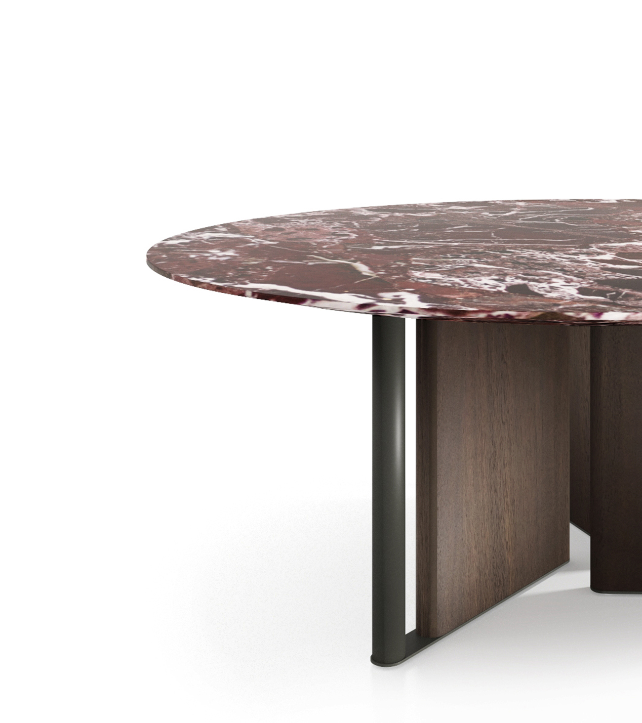 In-Between is a sculptural table that becomes the focal point of the living area thanks to the design of its base. Consisting of alternating individual elements crossed by space, the base of In-Between gives a two-dimensional feel to the room. The round top skims the base, lending even more lightness to the entire piece.