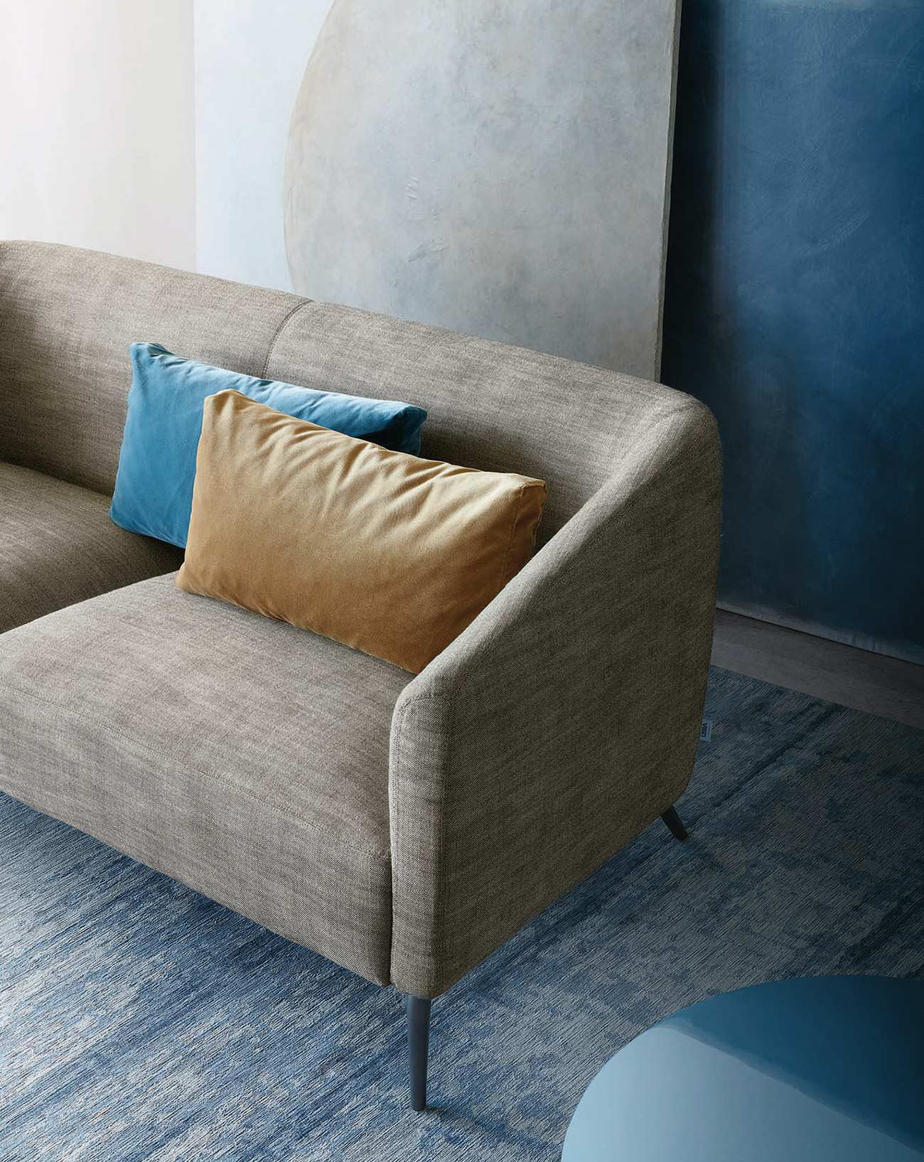 Kaiwa is a two-seater sofa of refined elegance, distinguished by a suspended base in bronze-painted steel that imparts visual lightness. The supporting frame in Polimex and poplar plywood with webbed seat platform is combined with high-density, multi-layered polyurethane foam cushions to ensure ergonomic comfort. The black polyethylene feet provide stability and protect surfaces. Versatile, Kaiwa adapts perfectly to both residential interiors and contract spaces. The upholstery in fabric, leather, or eco-leather is fully removable. Designed by Matteo Nunziati, the name is derived from the Japanese word for “conversation,” evoking the social essence of Made in Italy furnishings.