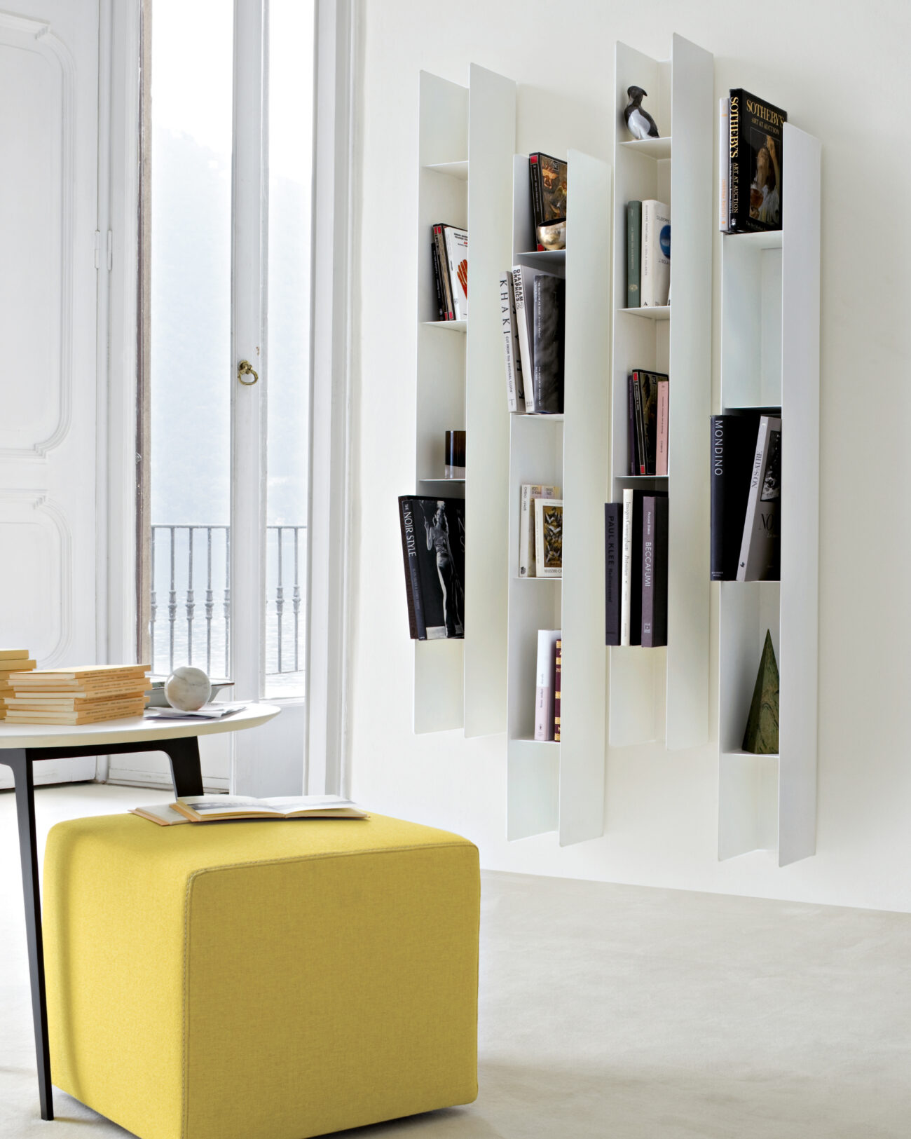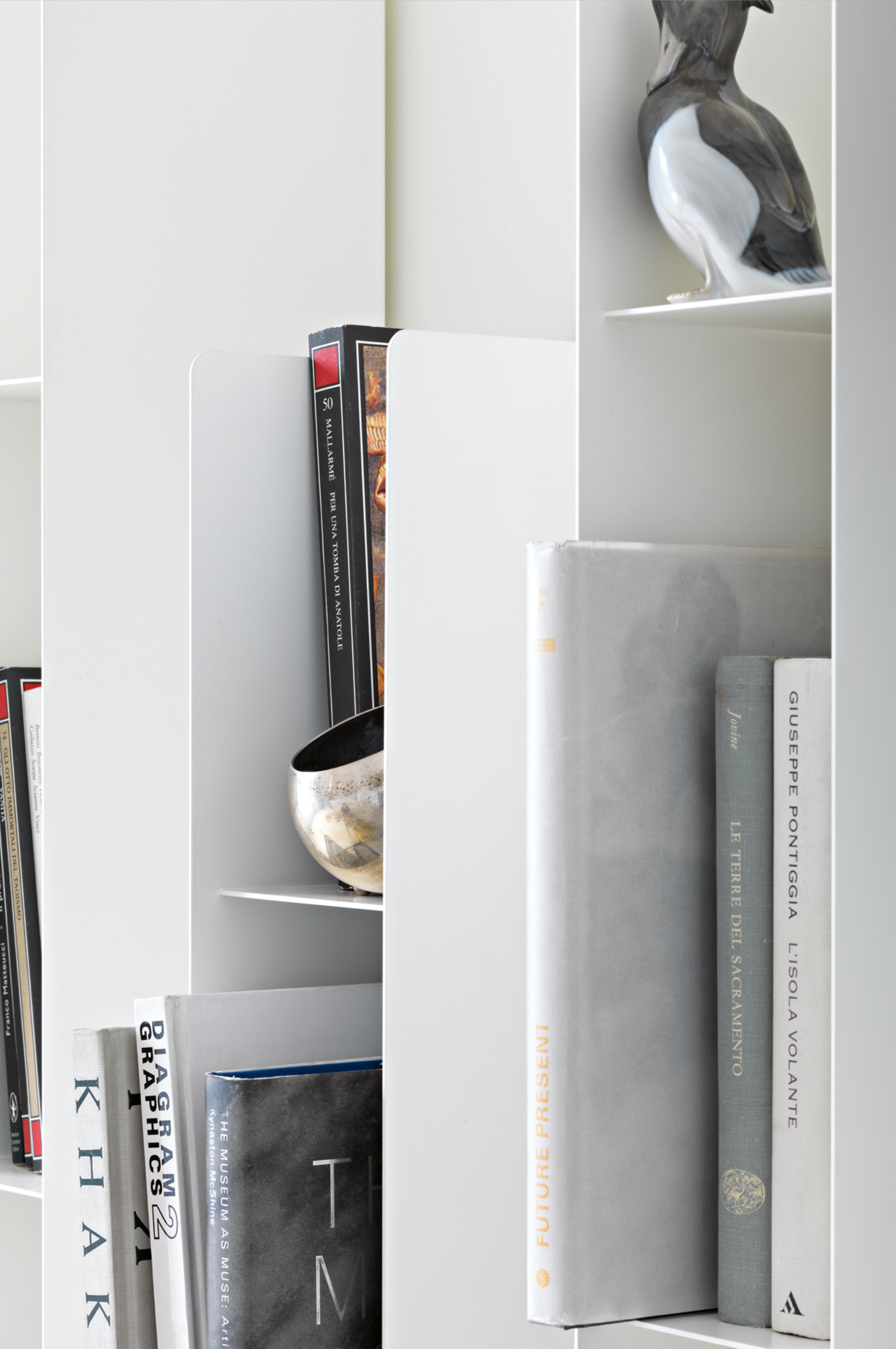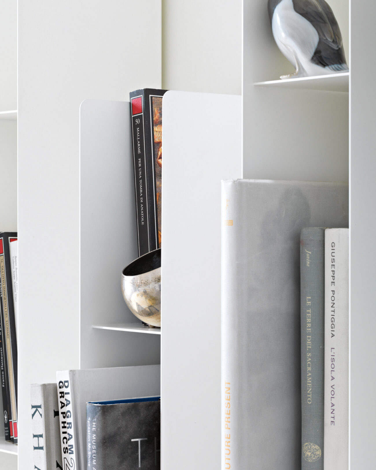 A decorative and functional element at the same time, made of lacquered metal, with a rigorous and essential spirit. A container with plastic expressiveness that is defined by its light, almost graphic structure, to be placed vertically or horizontally, with open compartments designed to organize books, magazines, and accommodate small objects to leave on display.
