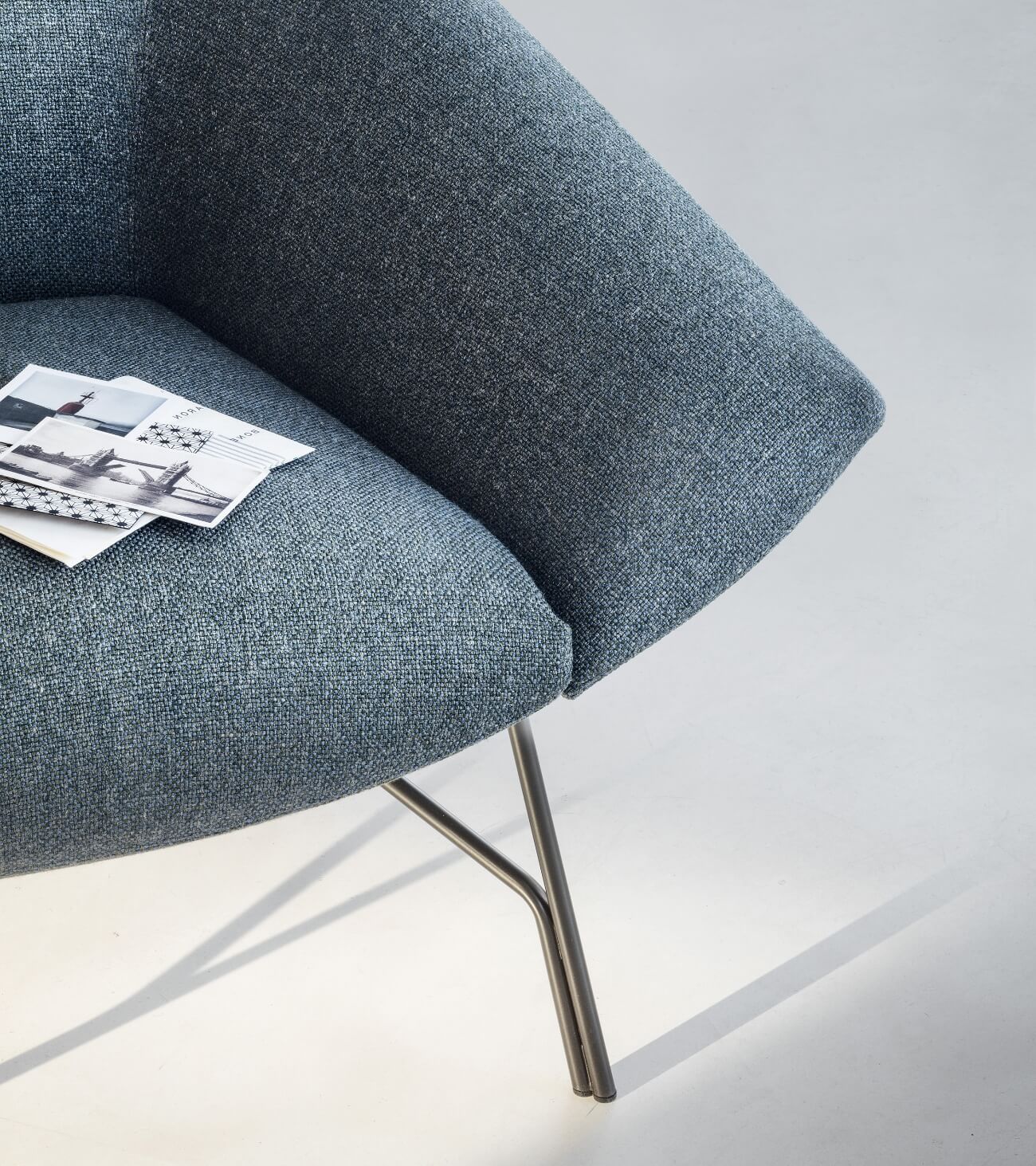 Balanced retro references define the Lennox armchair designed by Gordon Guillaumier. The inspiration behind this refined project is that of an open corolla, suspended in mid-air, on the light bronze-colored metal frame that becomes the starting point for an elegant and discreet conversation armchair characterized by armrests that widen to the sides.