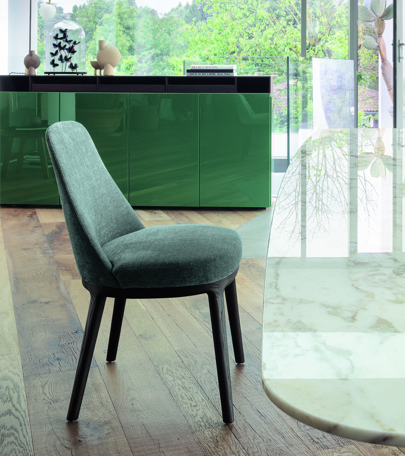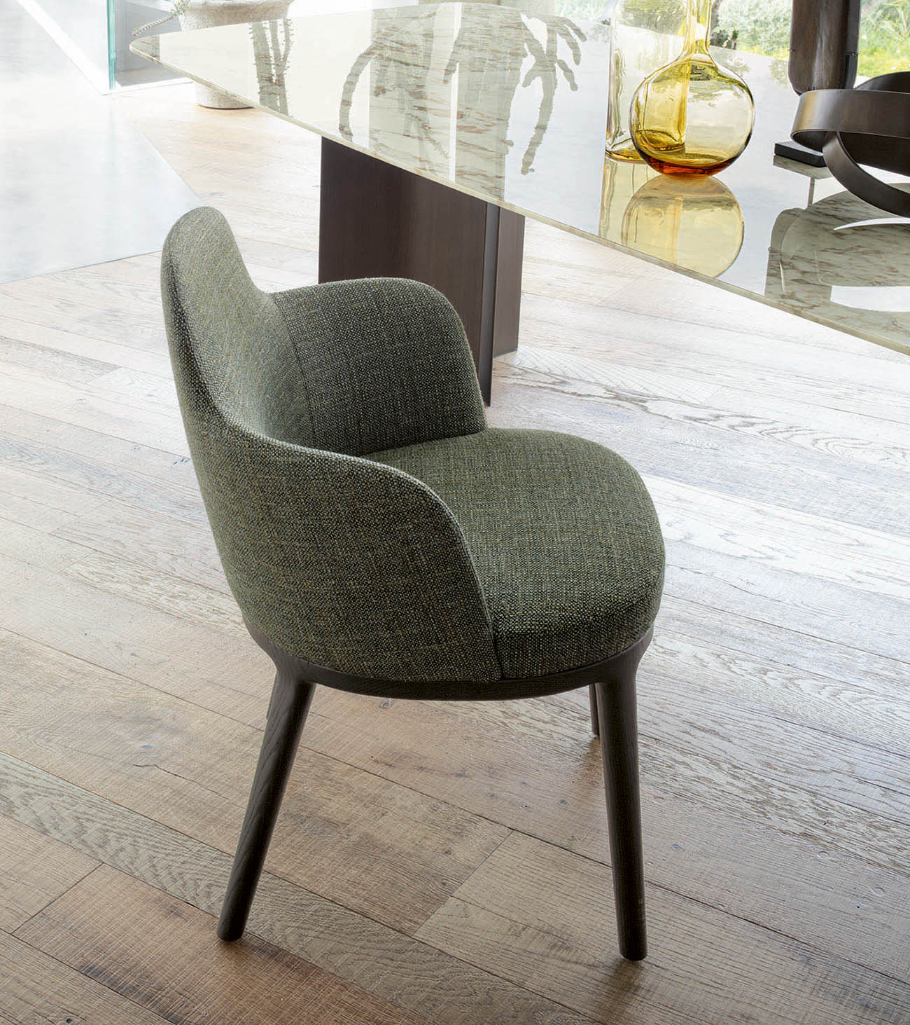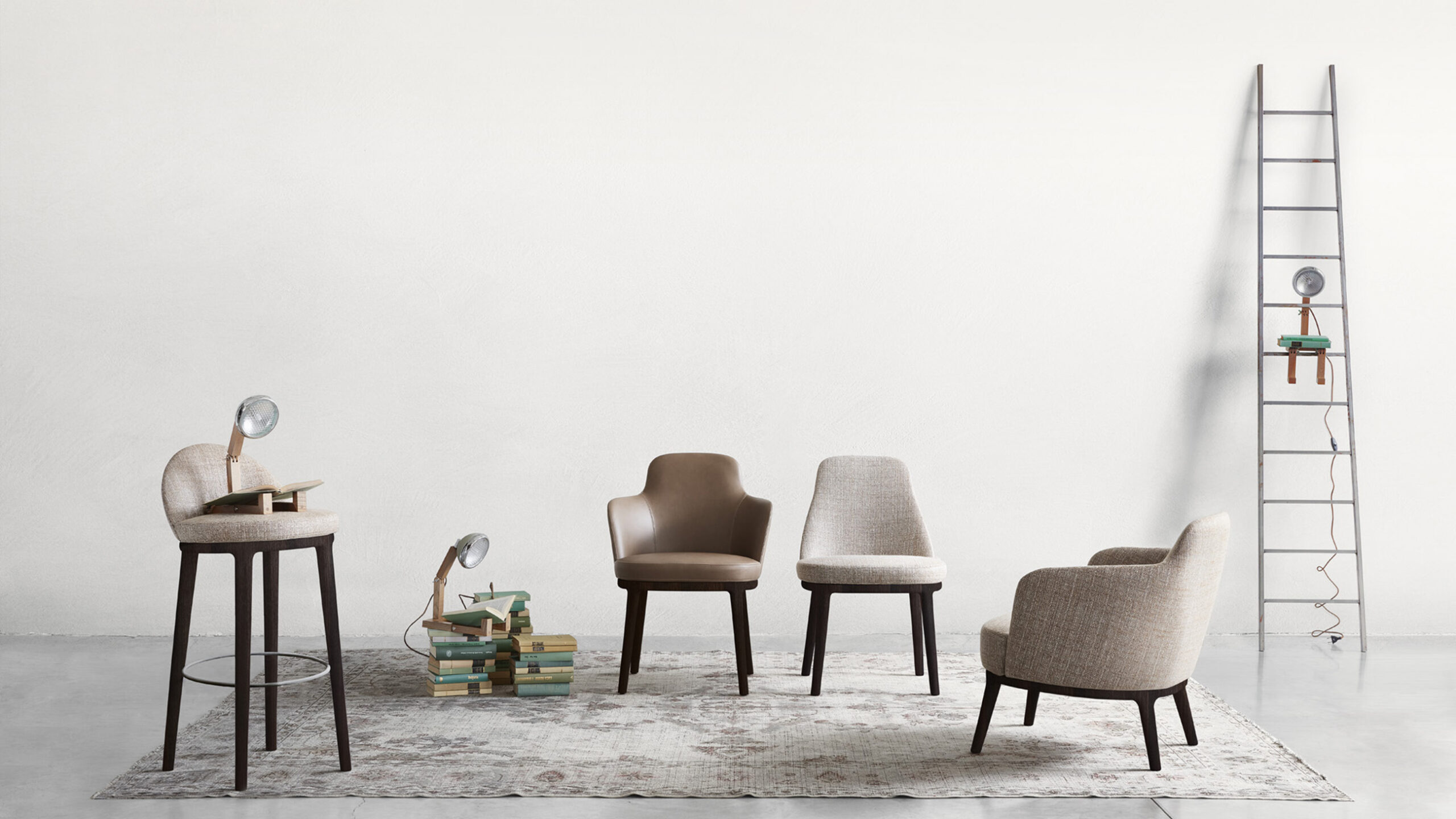 Delicate like its name, the Lucylle chair and dining armchair is refined in its classic and welcoming proportions. With a solid wood frame, it features soft padding and upholstery in fabric, leather, or eco-leather enhanced by top-stitched seams that highlight Lema’s more tailored spirit. The same family also includes a lounge chair, high and low stool.