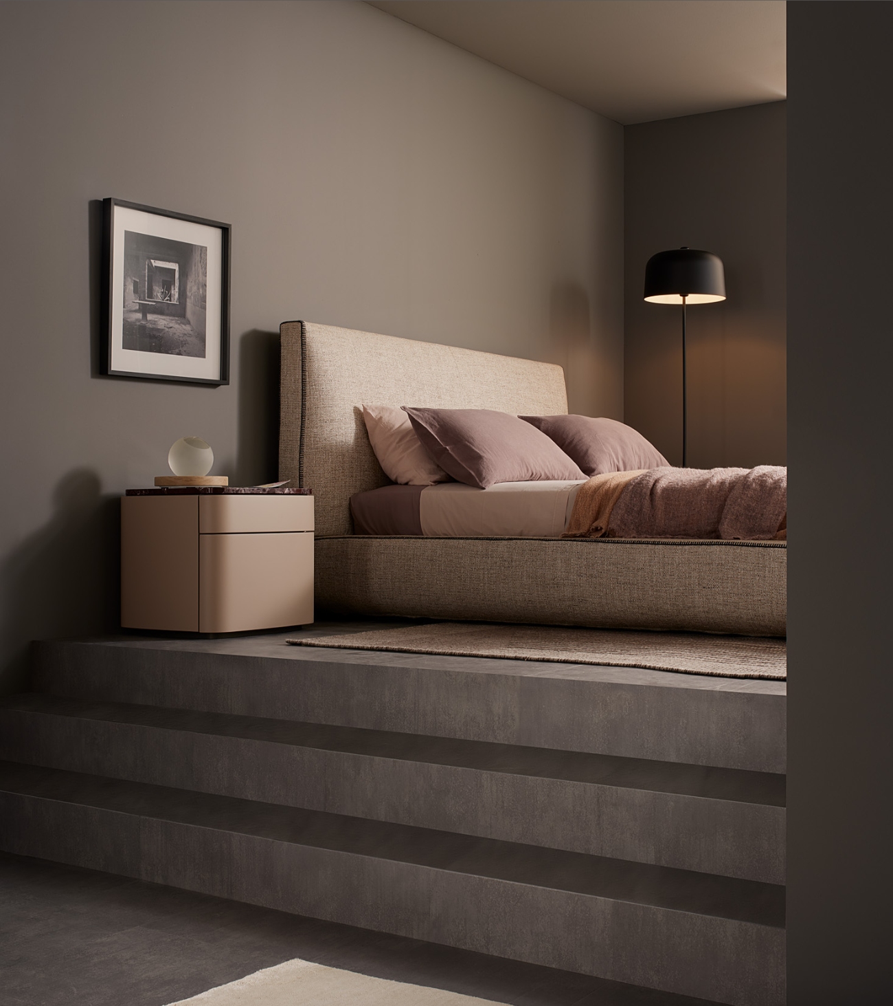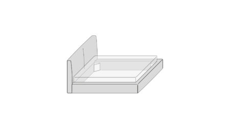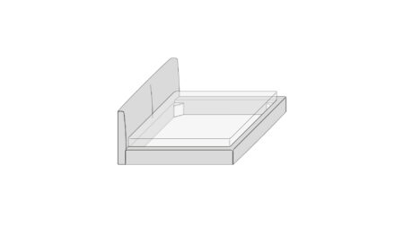 The bed from the Lullaby collection features clean and essential lines, with a tall and imposing headboard that gives the piece a strong geometric character and a soft, enveloping effect, enhanced by the padding. The real innovation of this project concerns the design of the bed frame, whose geometry outlines a light and deliberately airy shape, with a discreet visual impact. The decorative stitching, in continuity with the headboard, completes the harmony of the design.