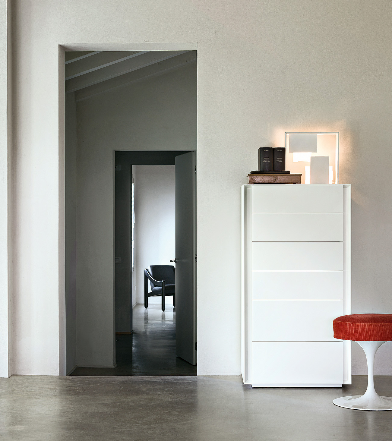 Luna by LEMA, designed by Marelli and Molteni, is a collection of night storage units distinguished by an essential aesthetic and refined sartorial details. Nightstands and chests of drawers with four or six drawers feature geometric volumes softened by side engravings and 45° joints, with matte or glossy lacquered finishes that enhance their personality. Made with low-emission certified wood panels and high-quality finishes, Luna combines functionality and design in a sustainable, durable product that is authentically Made in Italy by LEMA.