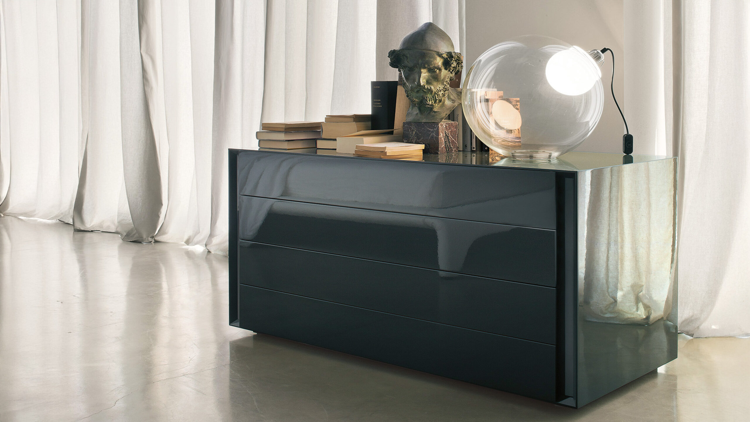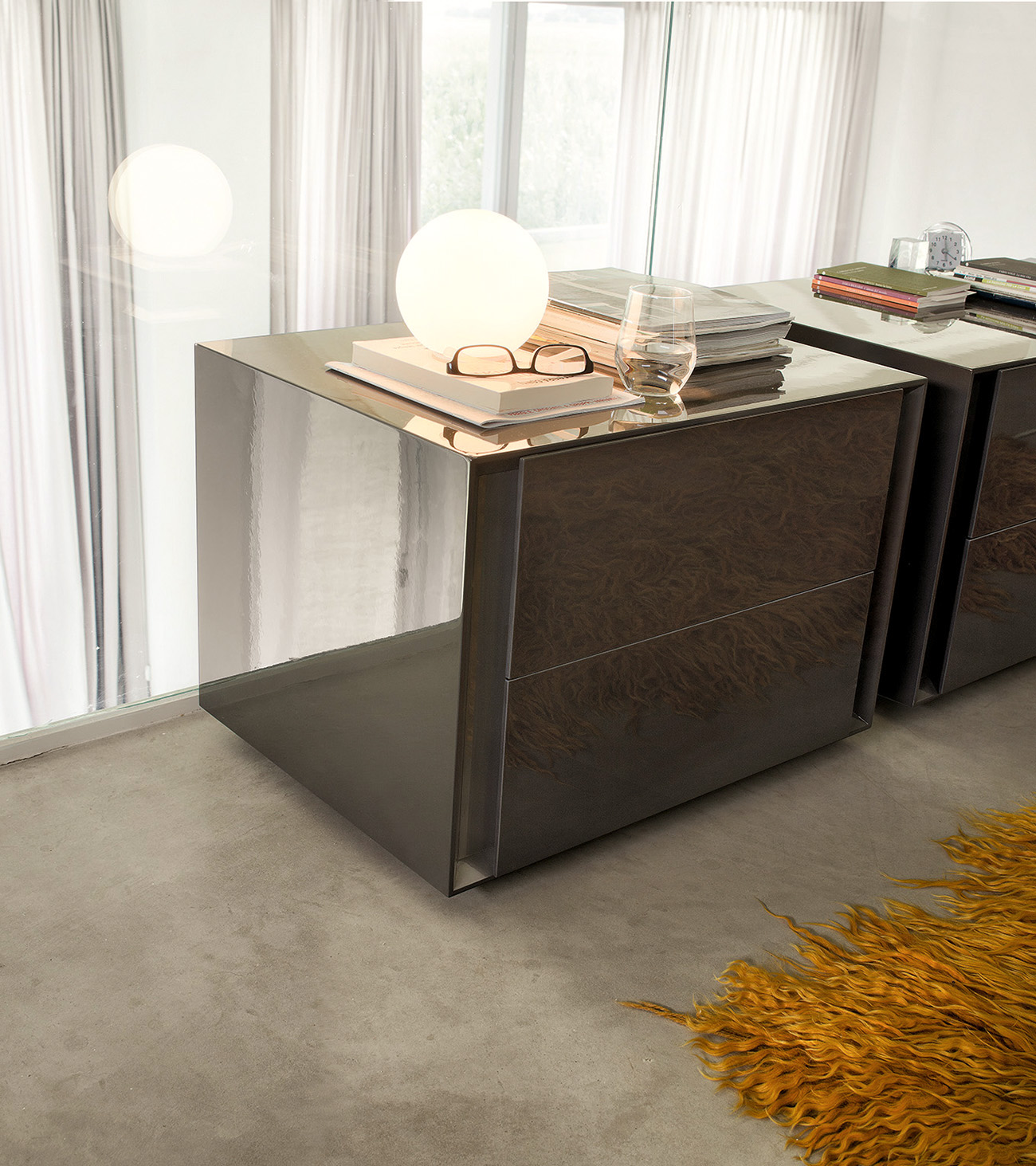 The delicate and understated lines of the geometric volumes are softened by side engravings that break up the strict volumetry, giving the design a strong personality. The refined 45° joints are emphasized by the lacquered finish, available in glossy or matte versions.