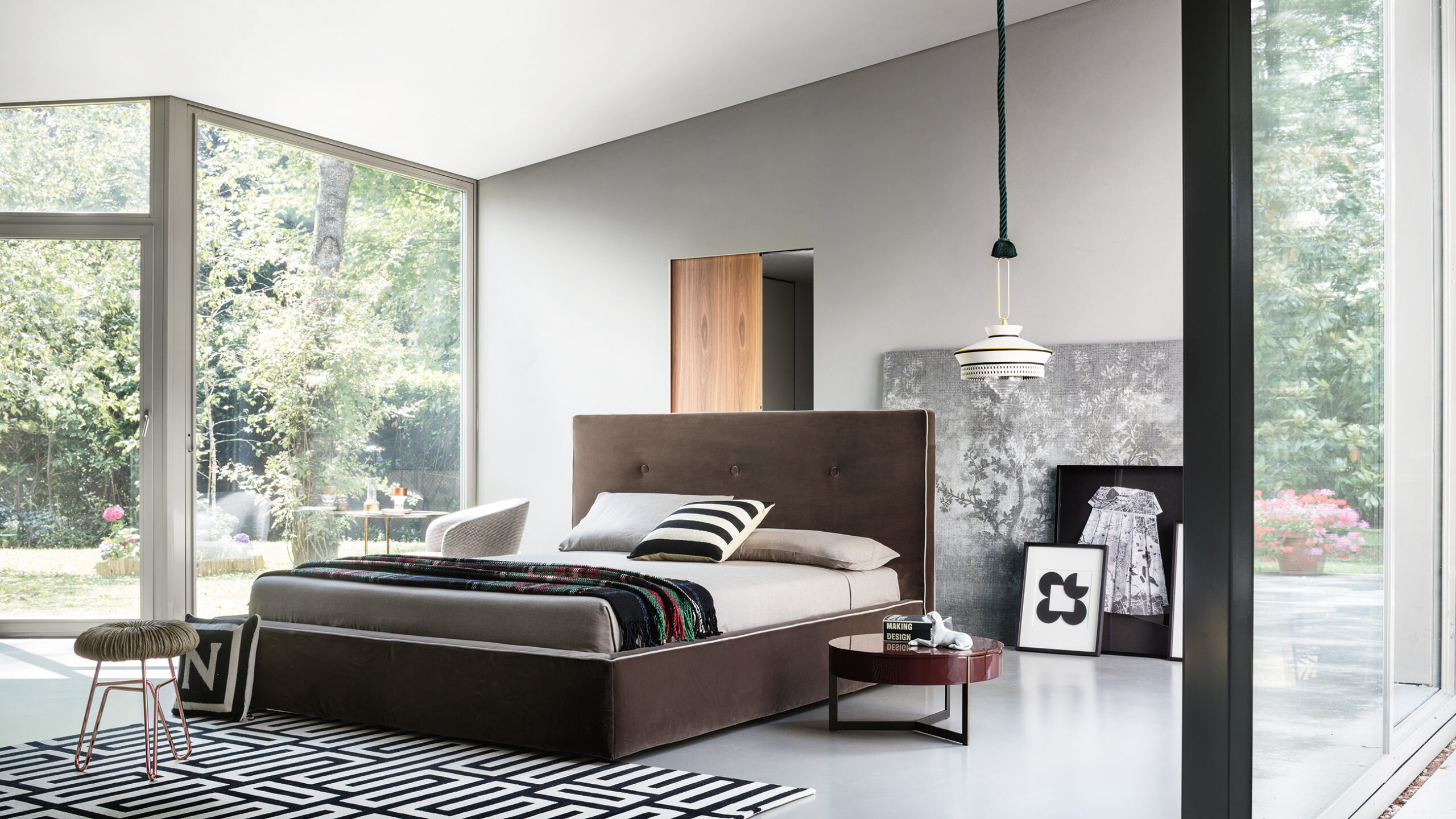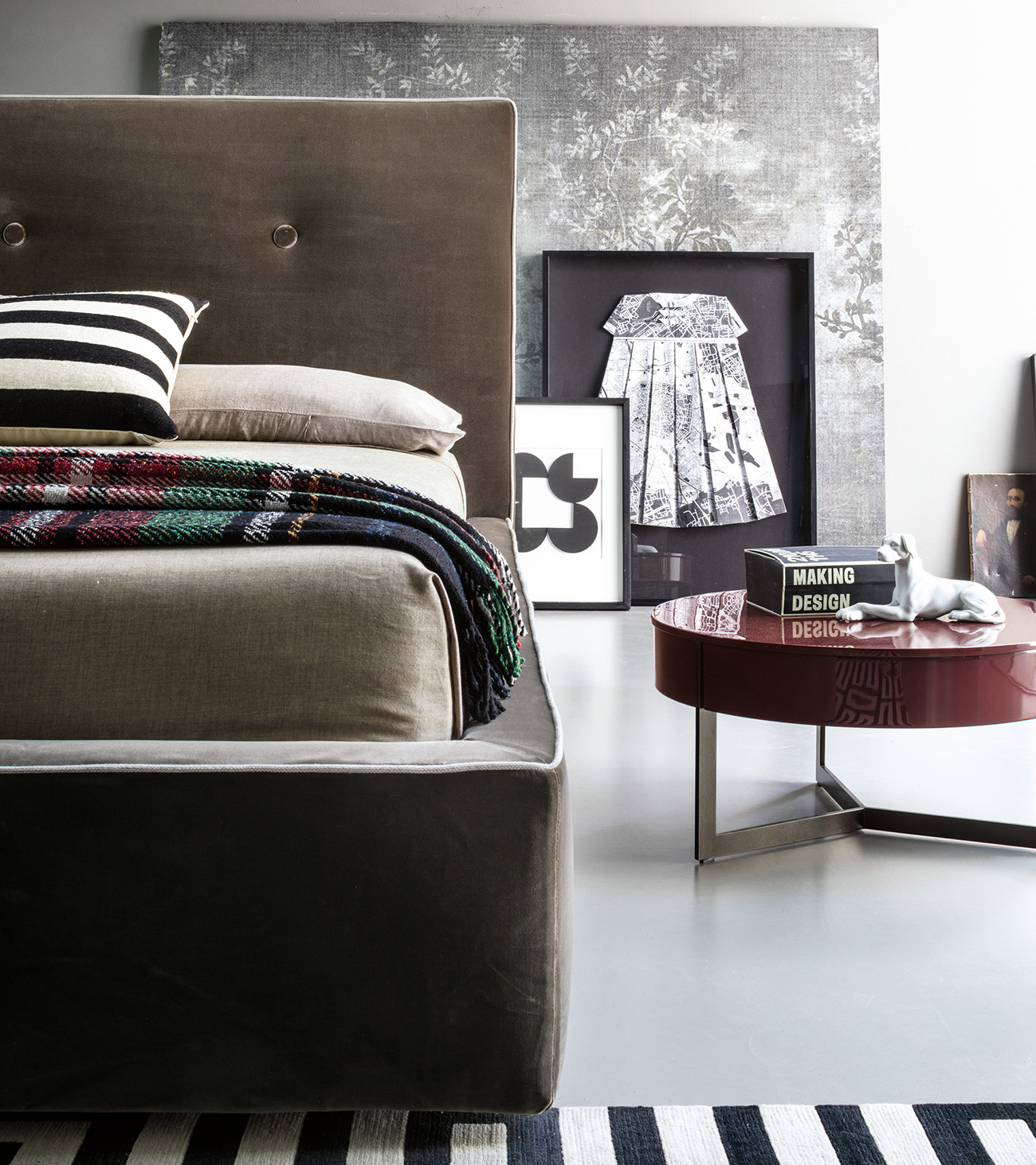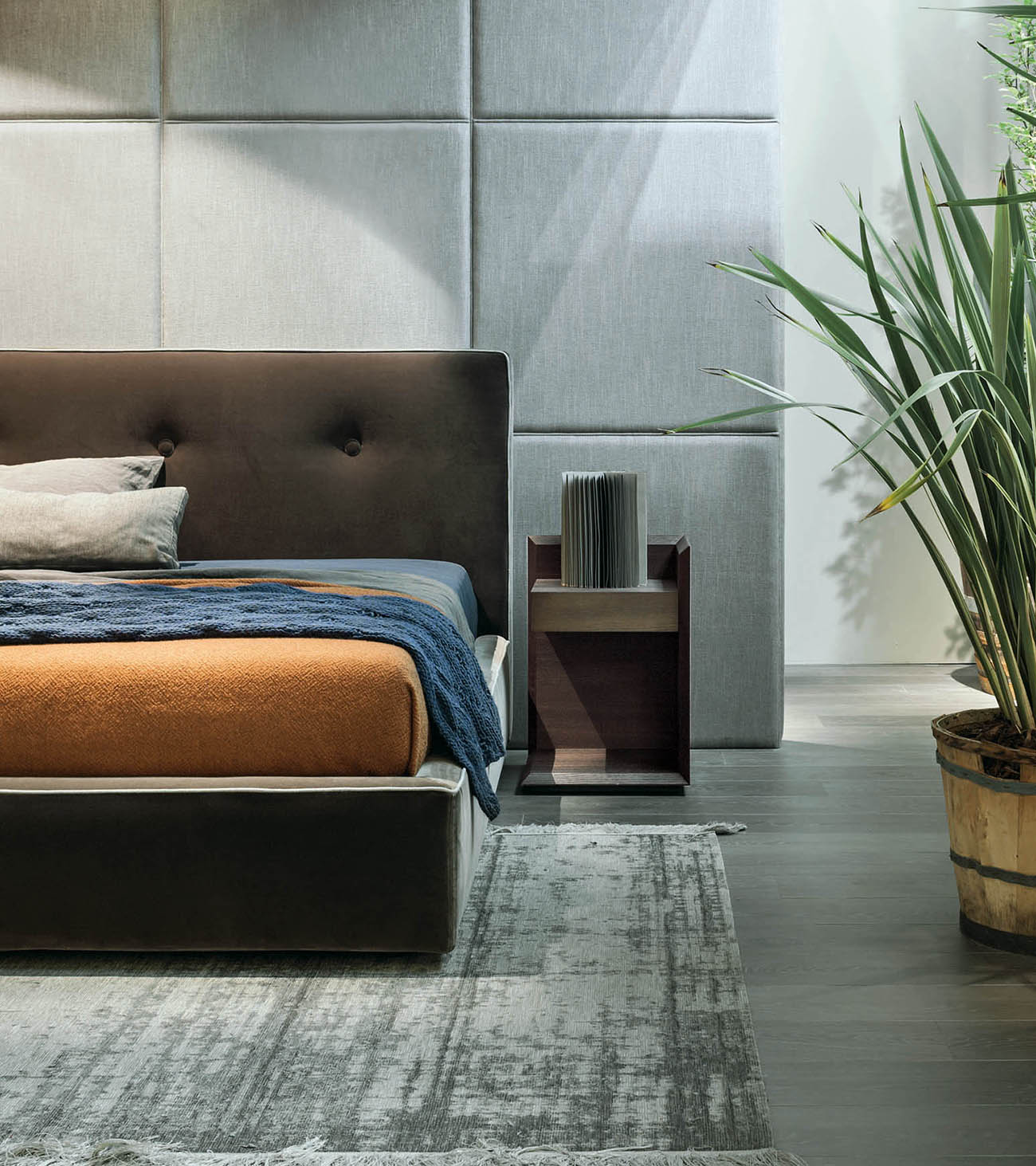 An elegant proposal that stands out for its attention to detail: from the important padded headboard with soft stitching that recalls capitonné workmanship, to the thin tone-on-tone or contrasting piping with the upholstery that refines the lines of the bed. Also available with a practical storage compartment underneath.