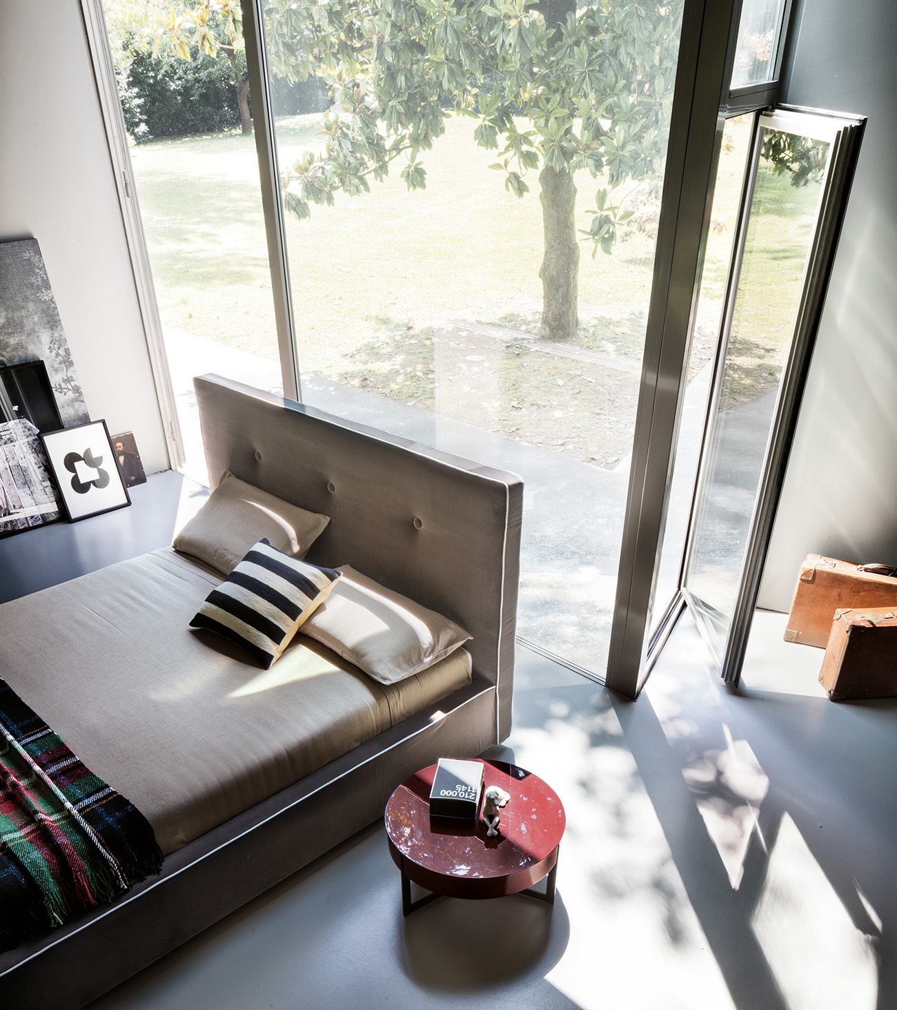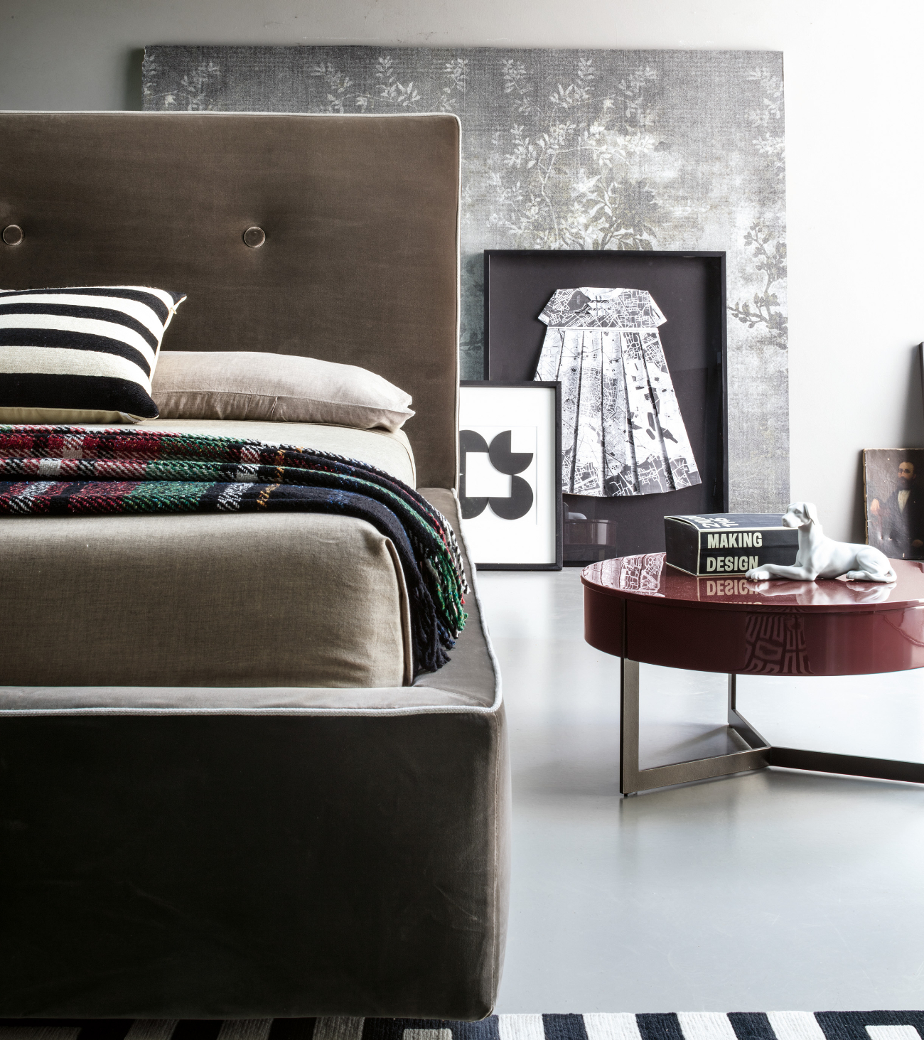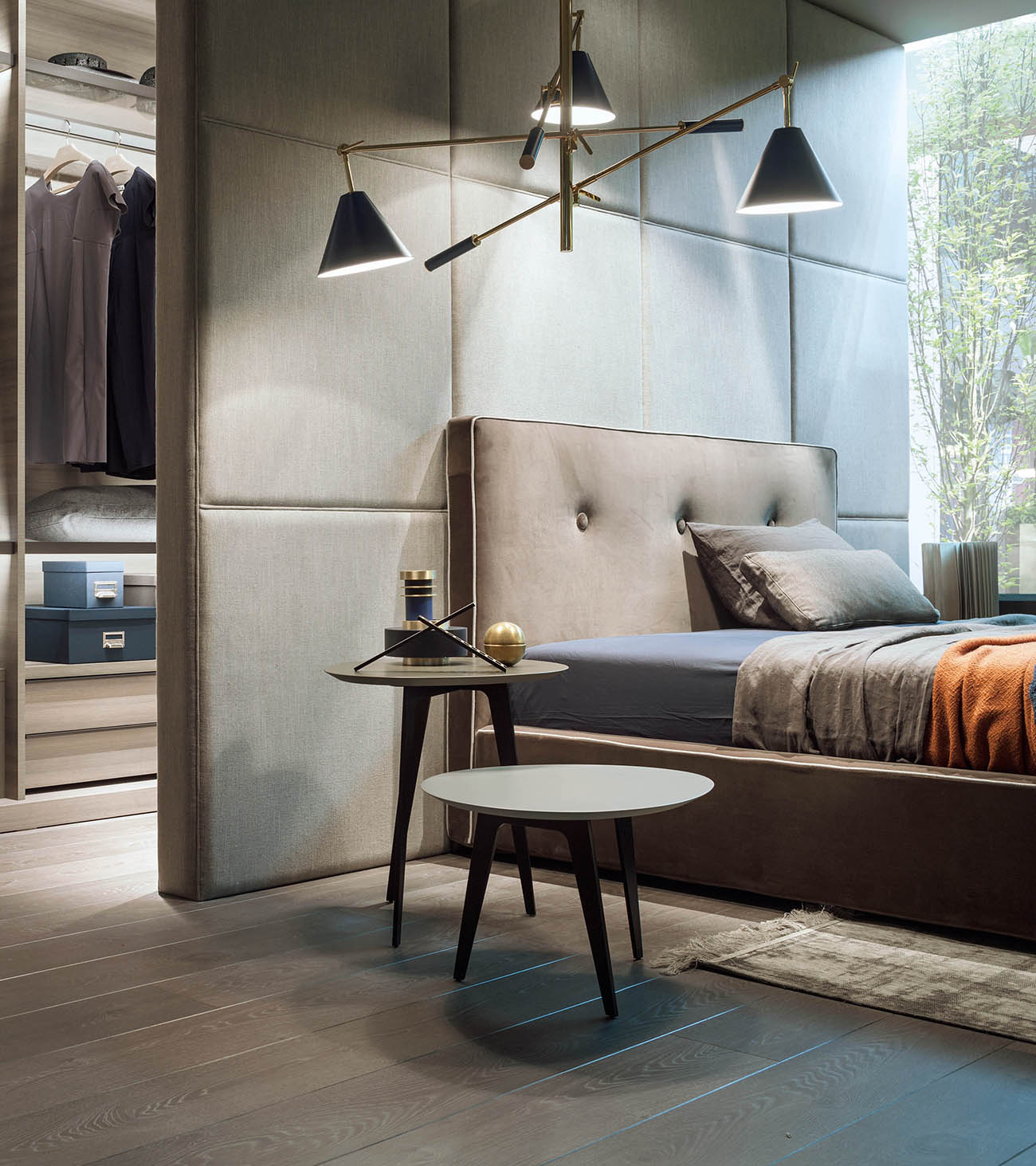 An elegant proposal that stands out for its attention to detail: from the important padded headboard with soft stitching that recalls capitonné workmanship, to the thin tone-on-tone or contrasting piping with the upholstery that refines the lines of the bed. Also available with a practical storage compartment underneath.