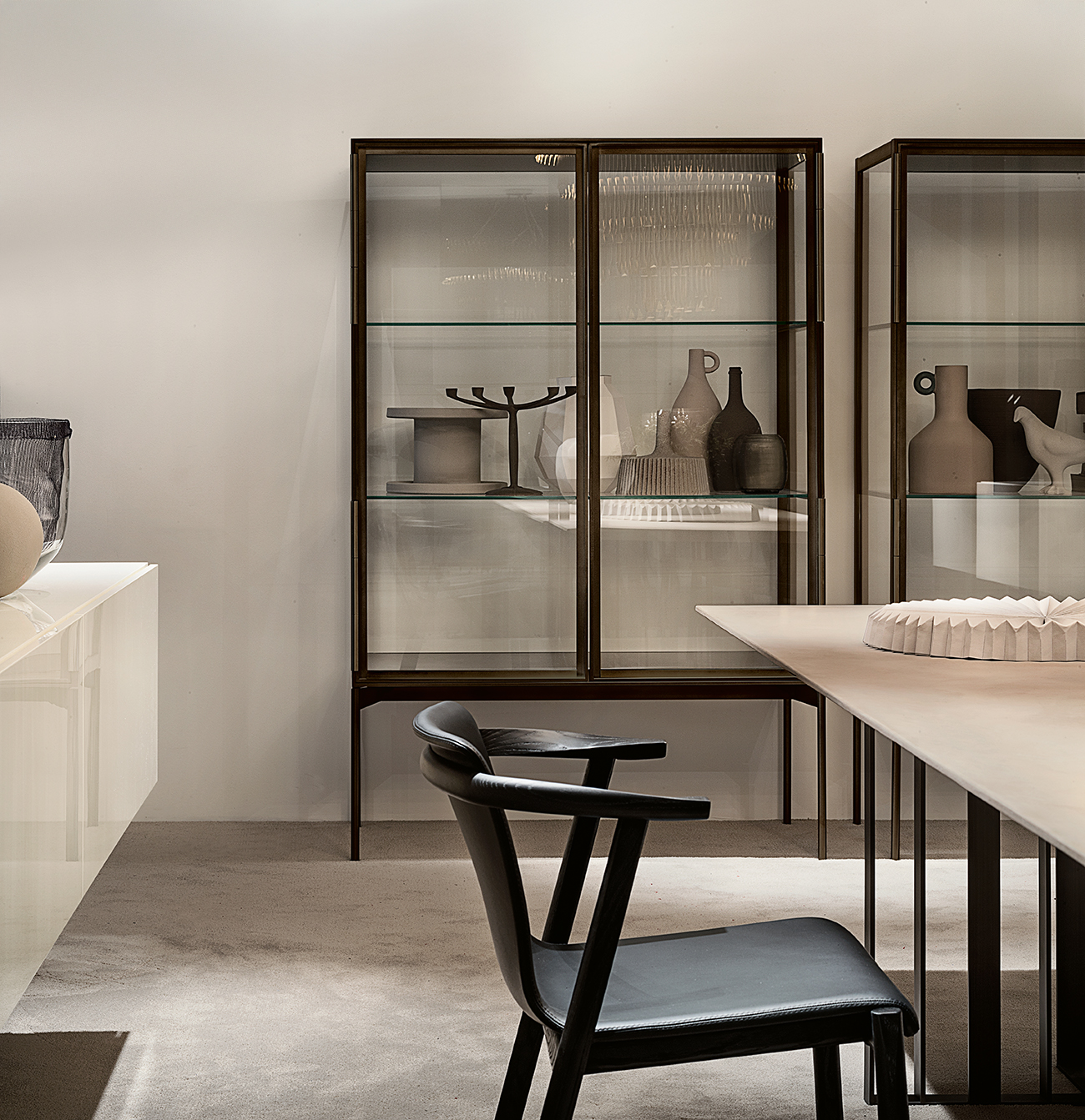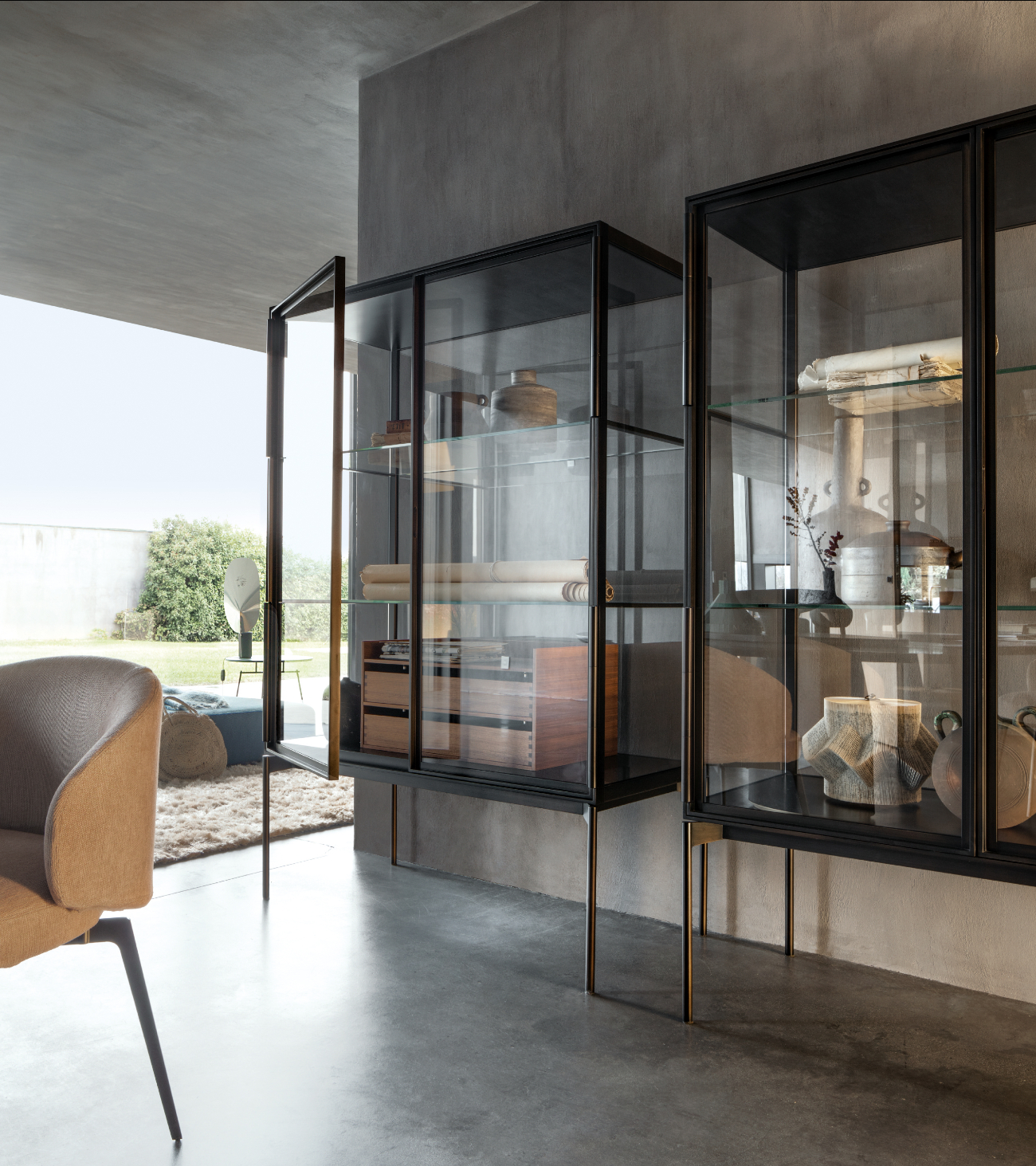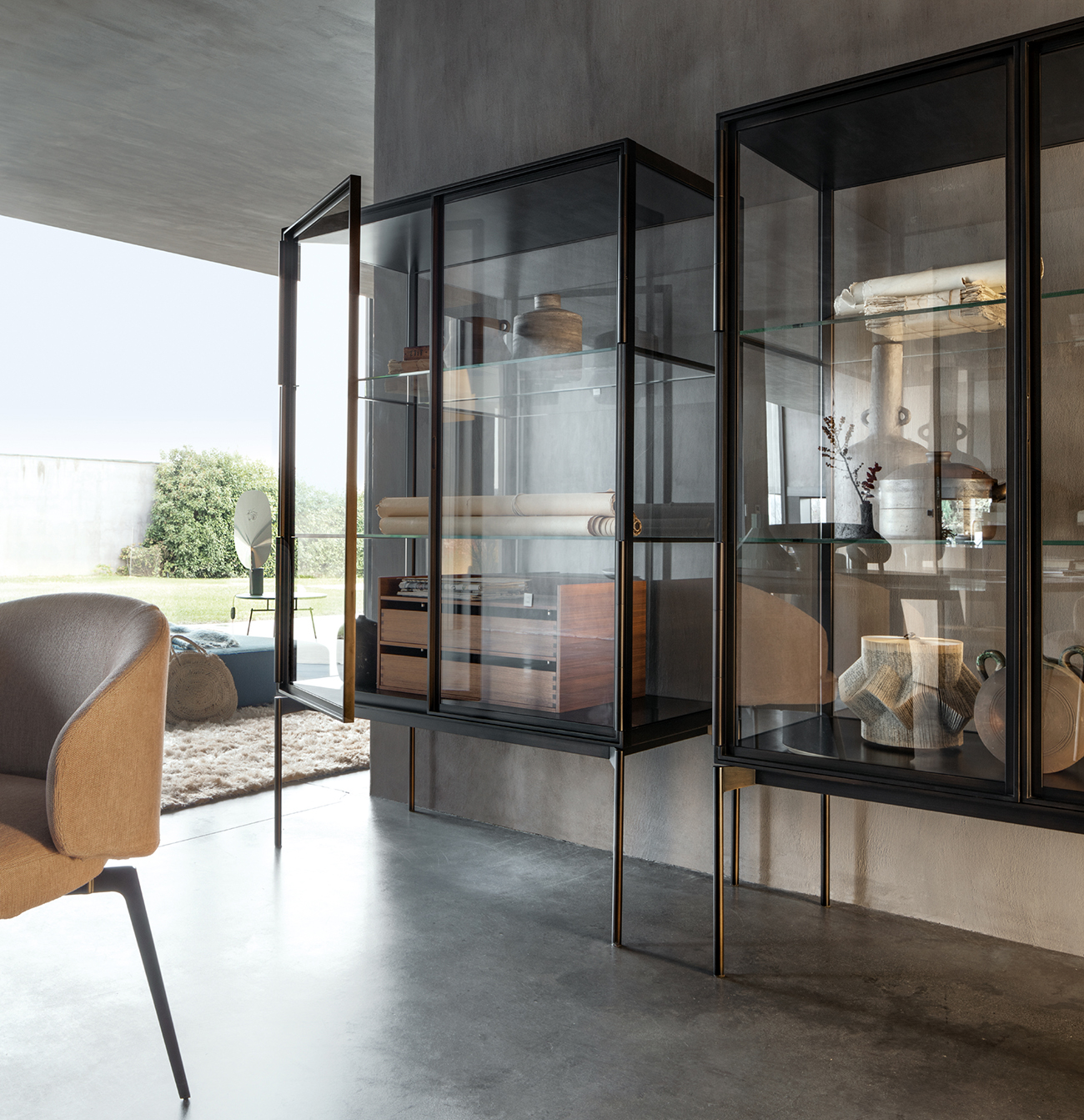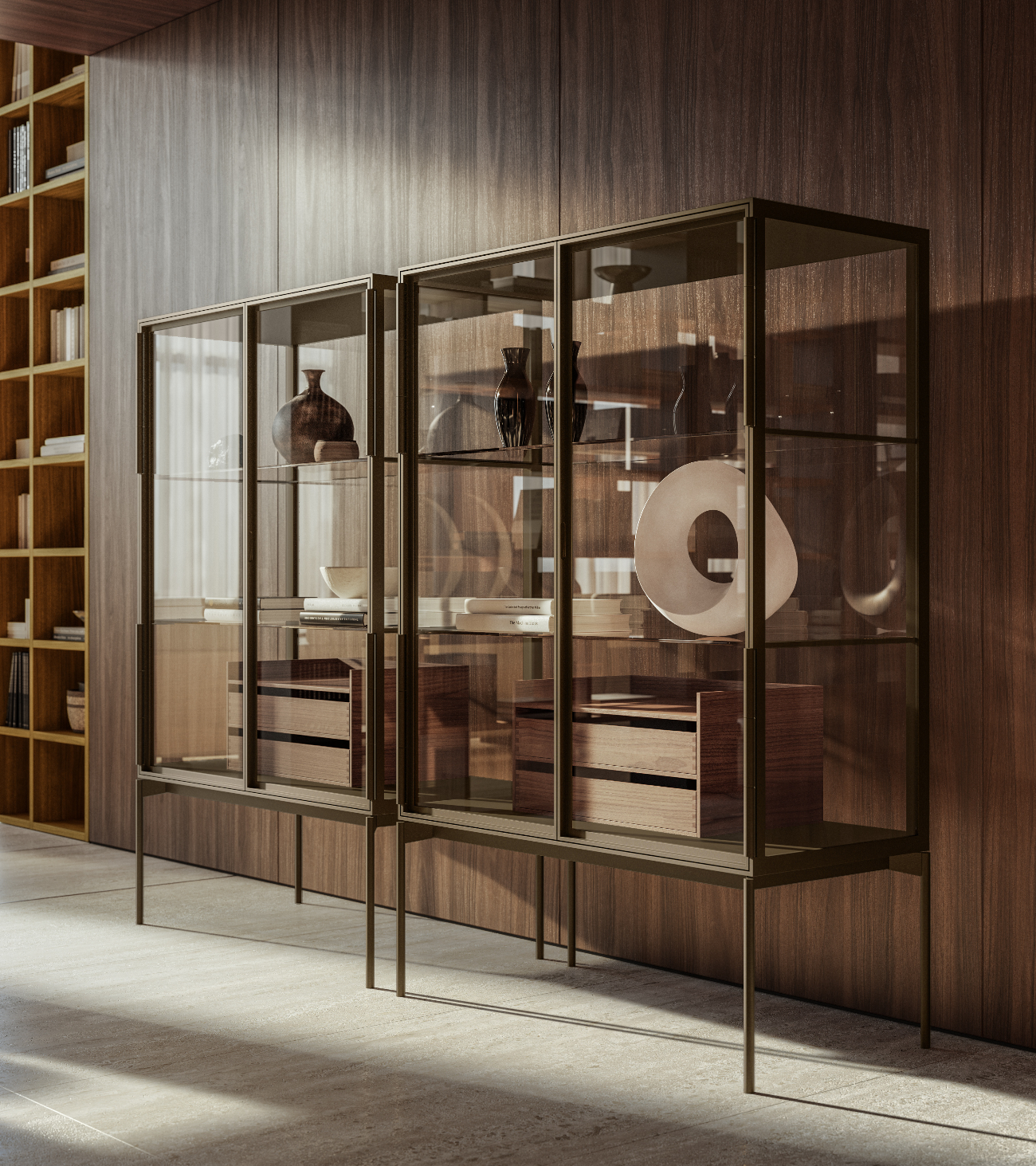 Galerist by LEMA, designed by Christophe Pillet, is a chest of drawers with a contemporary character that stands out for its structure in burnished patinated bronze lacquered metal and extra-clear glass walls, offering a 360° view of the contents. The door hinges, made of treated AISI 303 stainless steel, combine functionality and elegance, while the drawers with Canaletto walnut veneer finish enhance the refined design.Galerist combines tempered glass and MDF with fine wood, subjected to high-performance acrylic paints without heavy metals, to ensure long-lasting durability and color stability. The main dimensions are L 1300 mm, H 1720 mm, D 420 mm, with rigorous workmanship and painting made in Italy, guaranteeing quality, sustainability, and authentic Made in Italy by Lema.