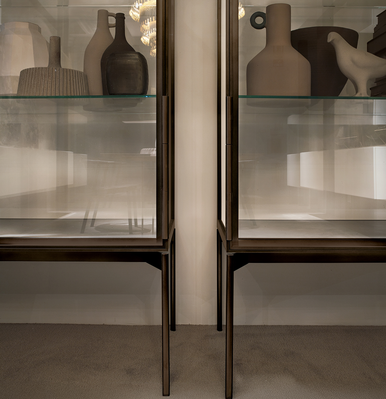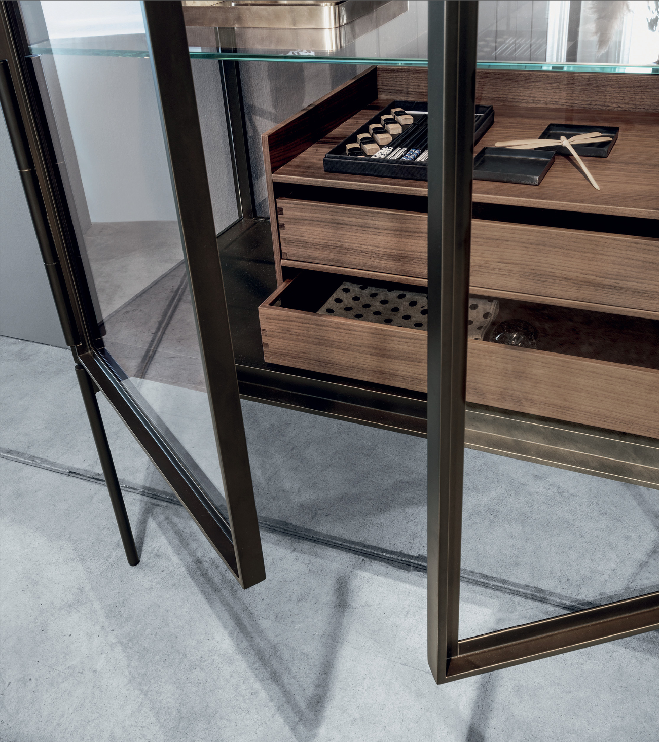 The four extra-clear glass walls allow for a 360-degree view. The door hinges are both a functional and aesthetic detail, made in metal treated to achieve a deep, rich color. The entire structure of the showcase is metal, created with welds specifically designed for this unique project, perfect also as a centerpiece in a room. Available as an accessory is a refined Canaletto walnut chest of drawers to rest inside.