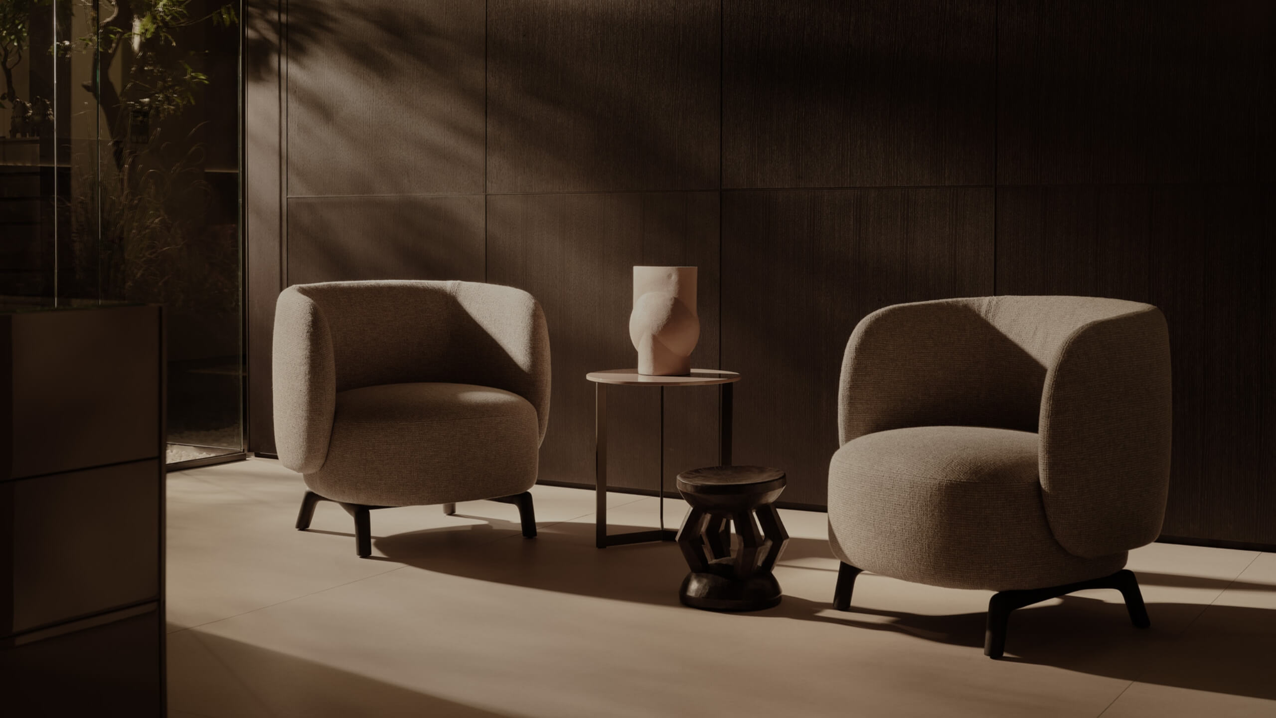 A generous seat cushion is enclosed by a padded shell that extends to form the backrest and armrests, creating a continuous and welcoming structure. The curved profile embraces the body, transforming the armchair into an intimate and comfortable retreat. Compact in size yet slender thanks to its high backrest, Miki is available in two versions: with a central pedestal in die-cast aluminum or with four supporting legs.