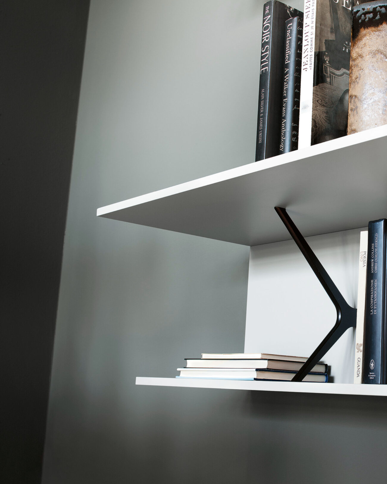 The supporting metal structure is paired with shelves in wood veneer or matte lacquered finish. Its geometric precision makes it ideal for any area of the home, from the living room to the bedroom, from service spaces to the entryway.