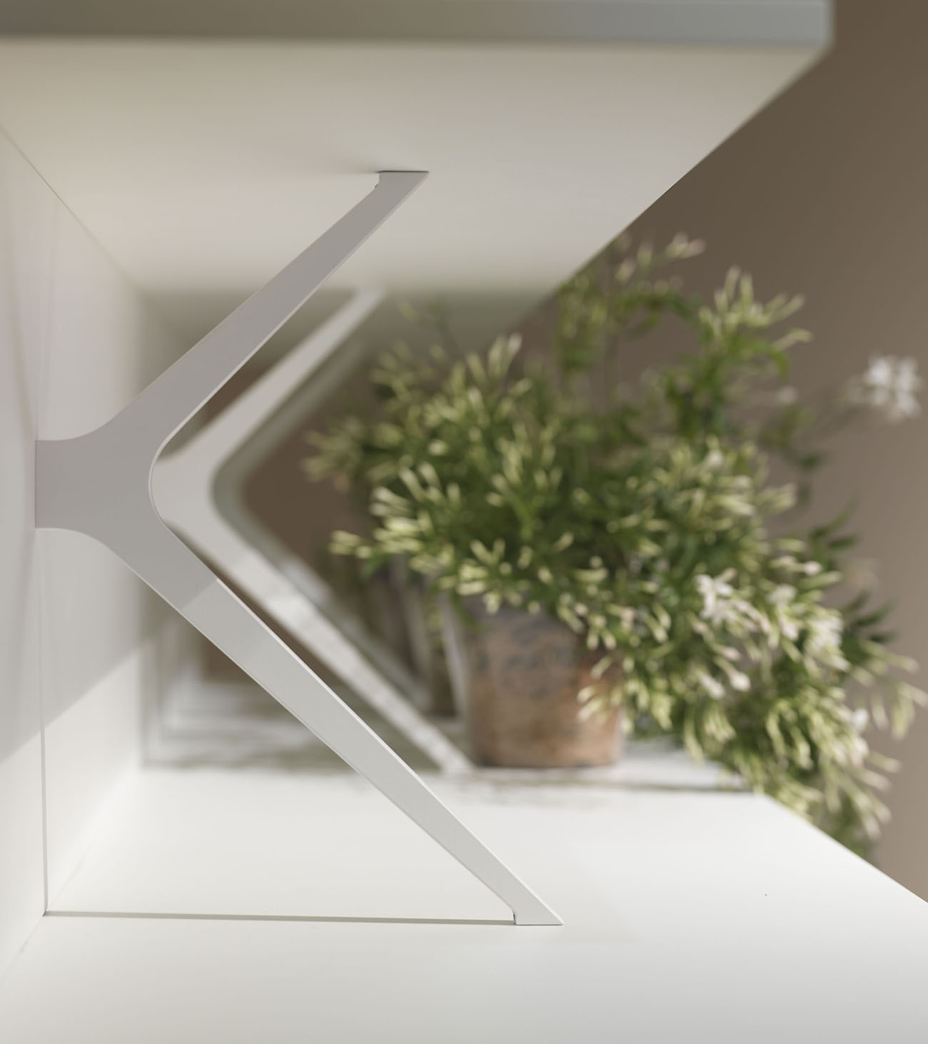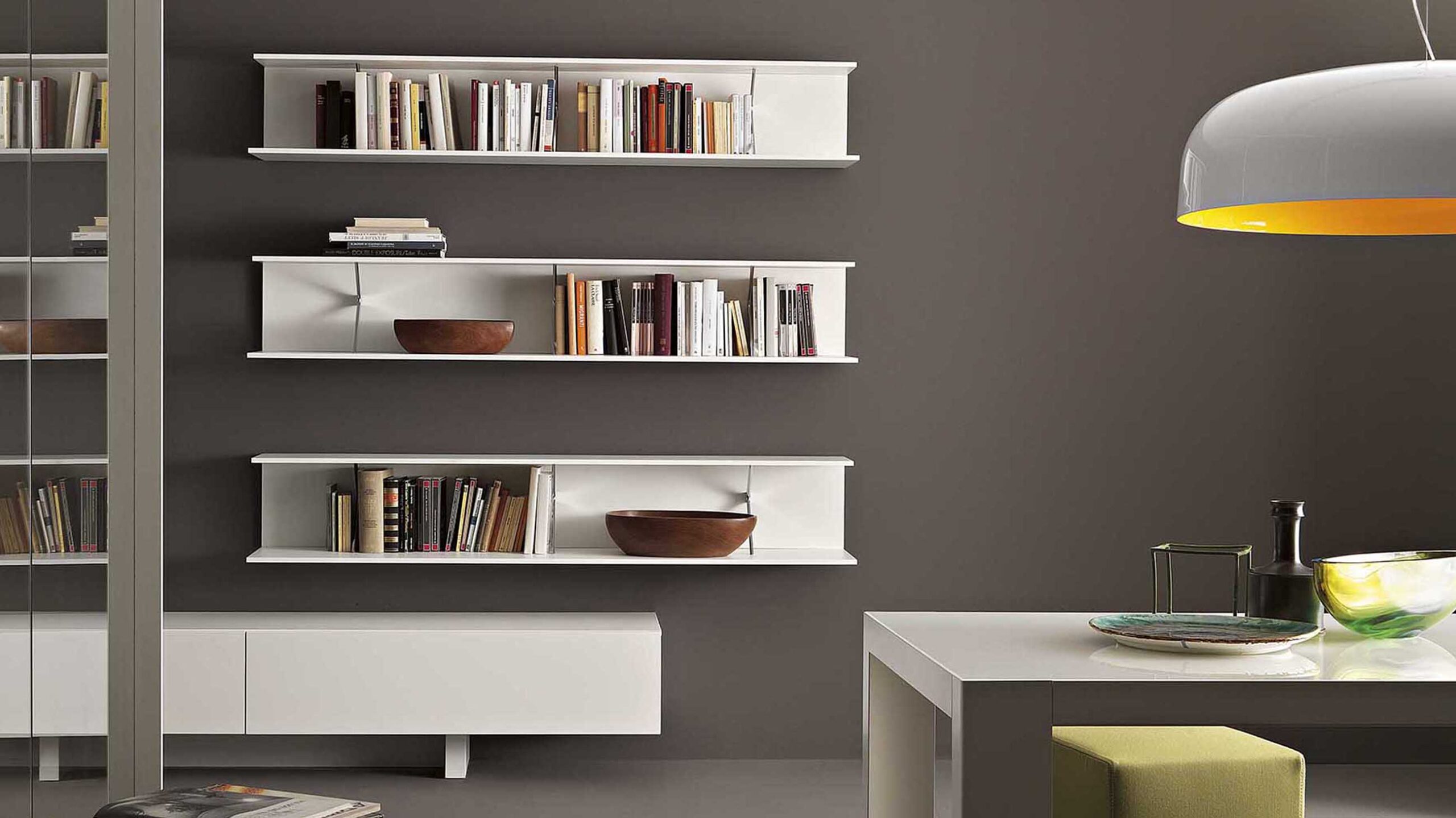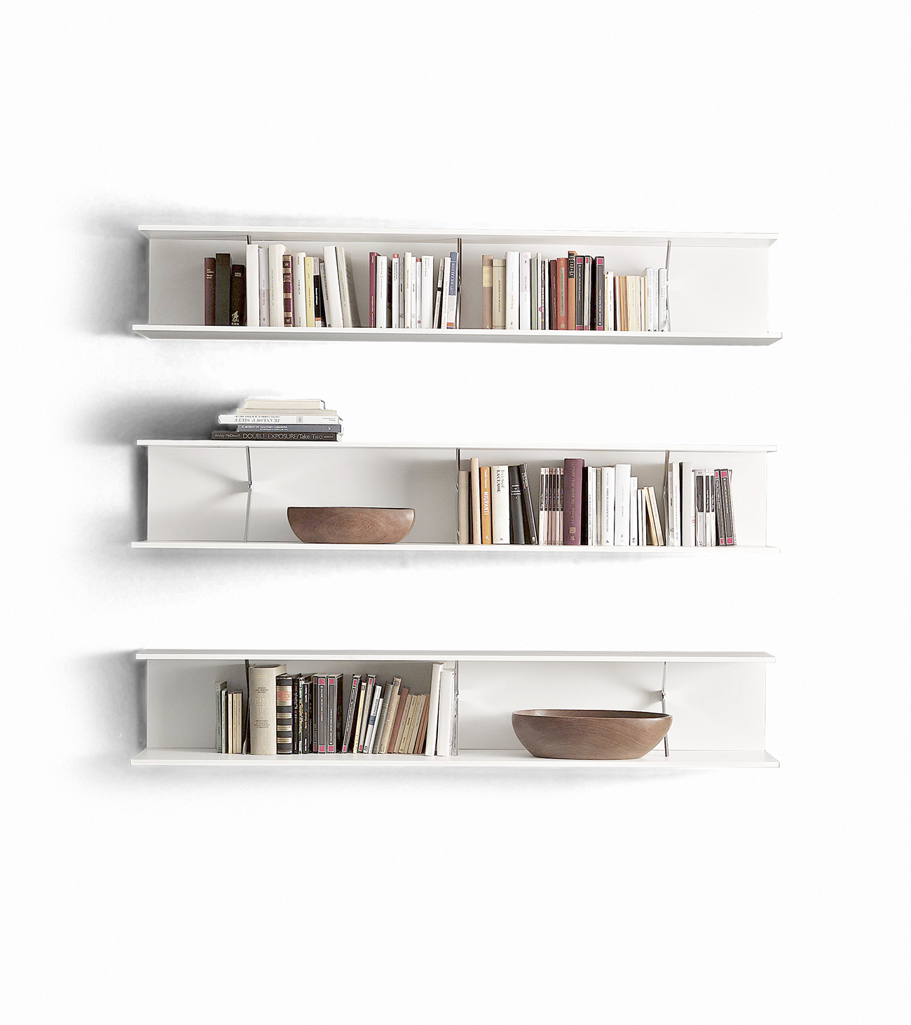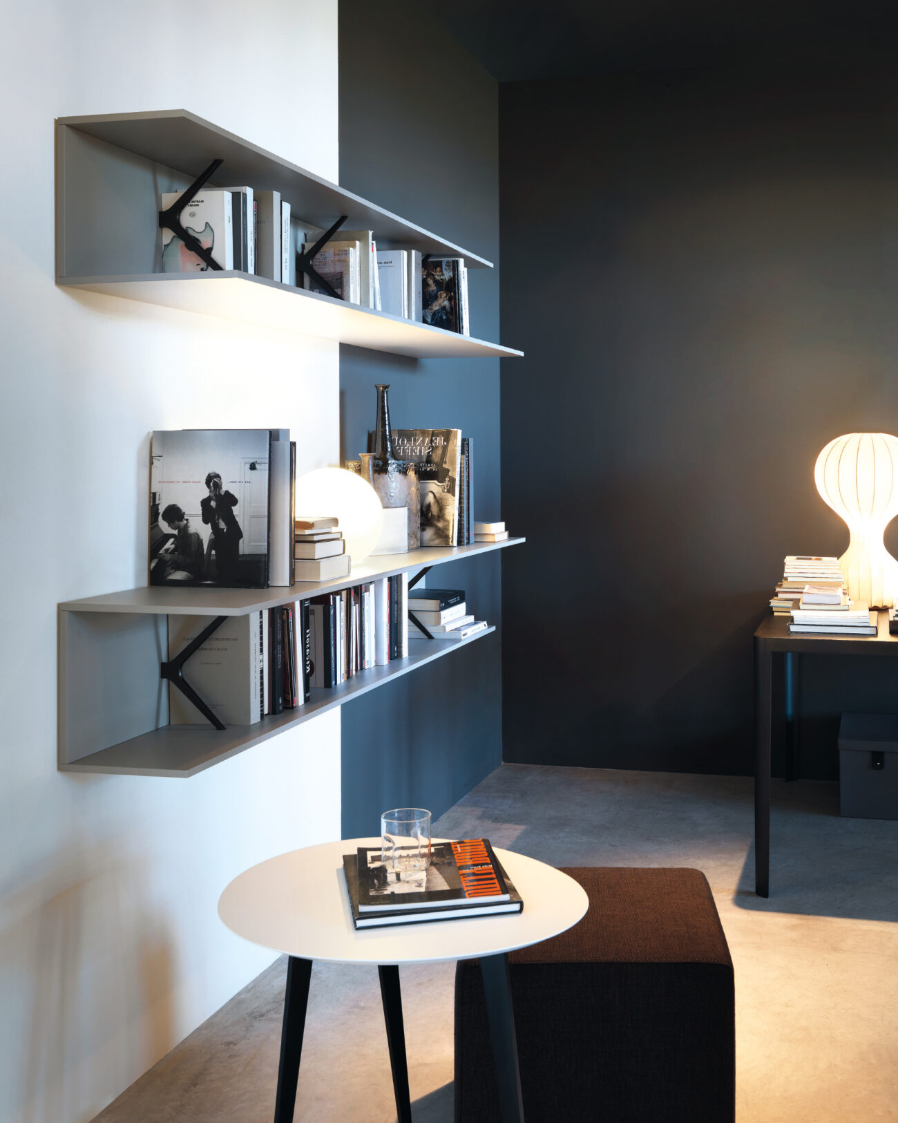 A graphic feature on the wall that catches the eye, the Mimì wall-mounted bookcase evolves from a linear C-shaped section to create an open storage unit with two shelves, supported by an original and stylized K-shaped metal frame, which also serves as a divider element. Thanks to the various size options and the possibility of using a single unit or combining multiple pieces along the walls, Mimì is perfect for meeting any furnishing need.