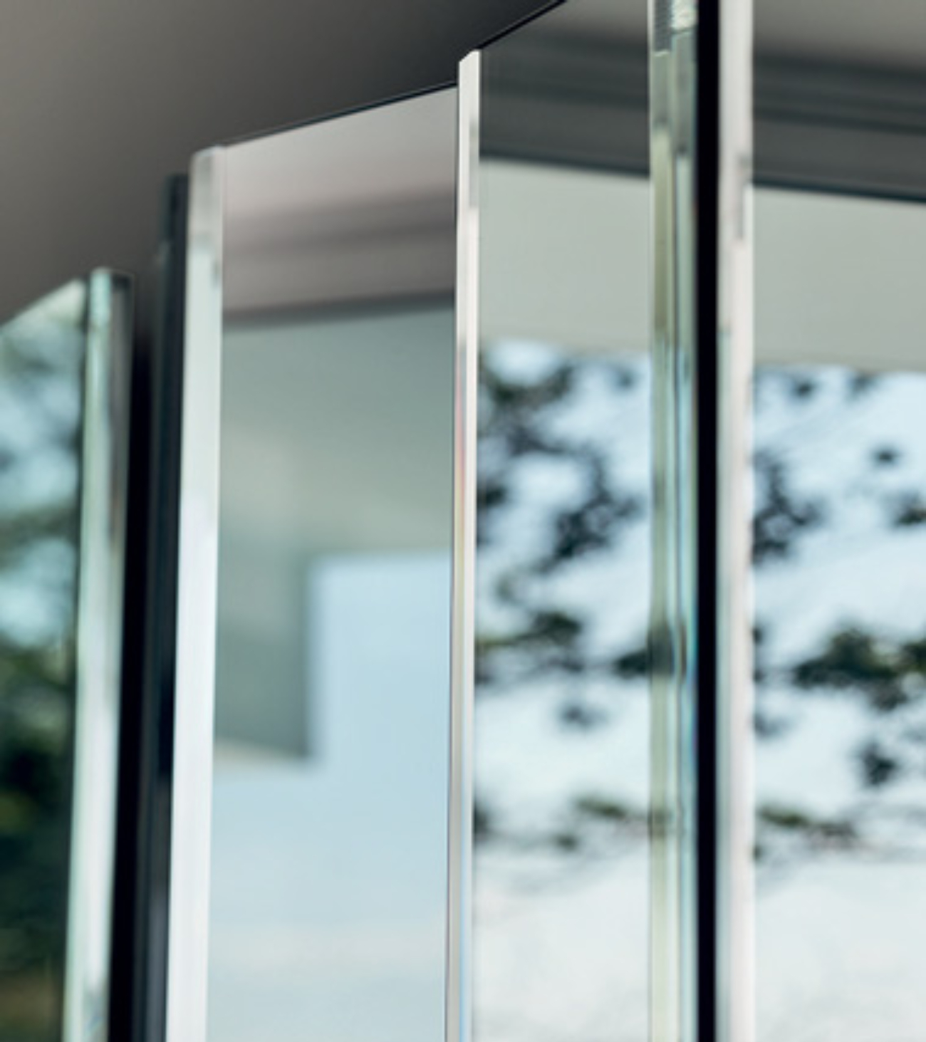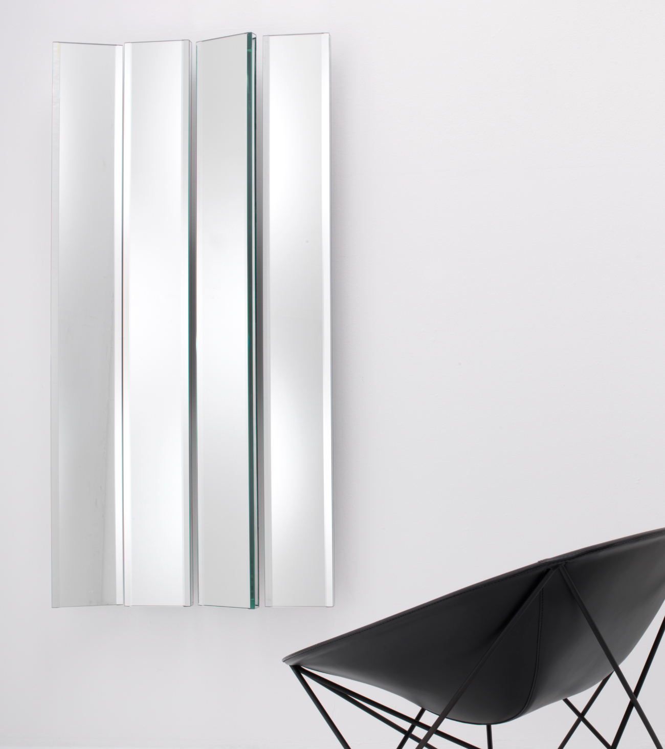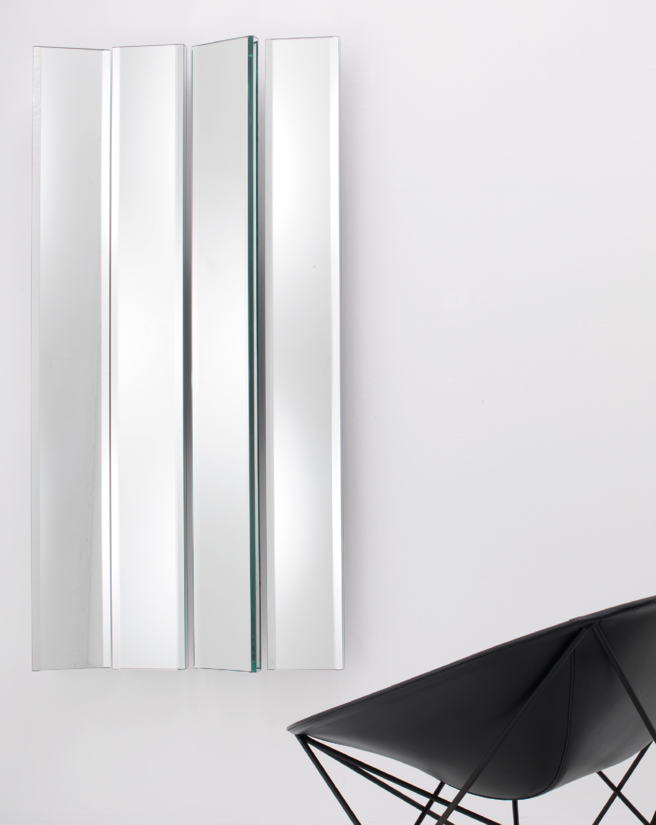 Maximum compositional freedom for the modular wall mirror Mirage, made up of several reflective surfaces that can be mounted at different angles. Thanks to the special wall mounting system that firmly supports the structure, the modules can be freely arranged to create customized compositions.