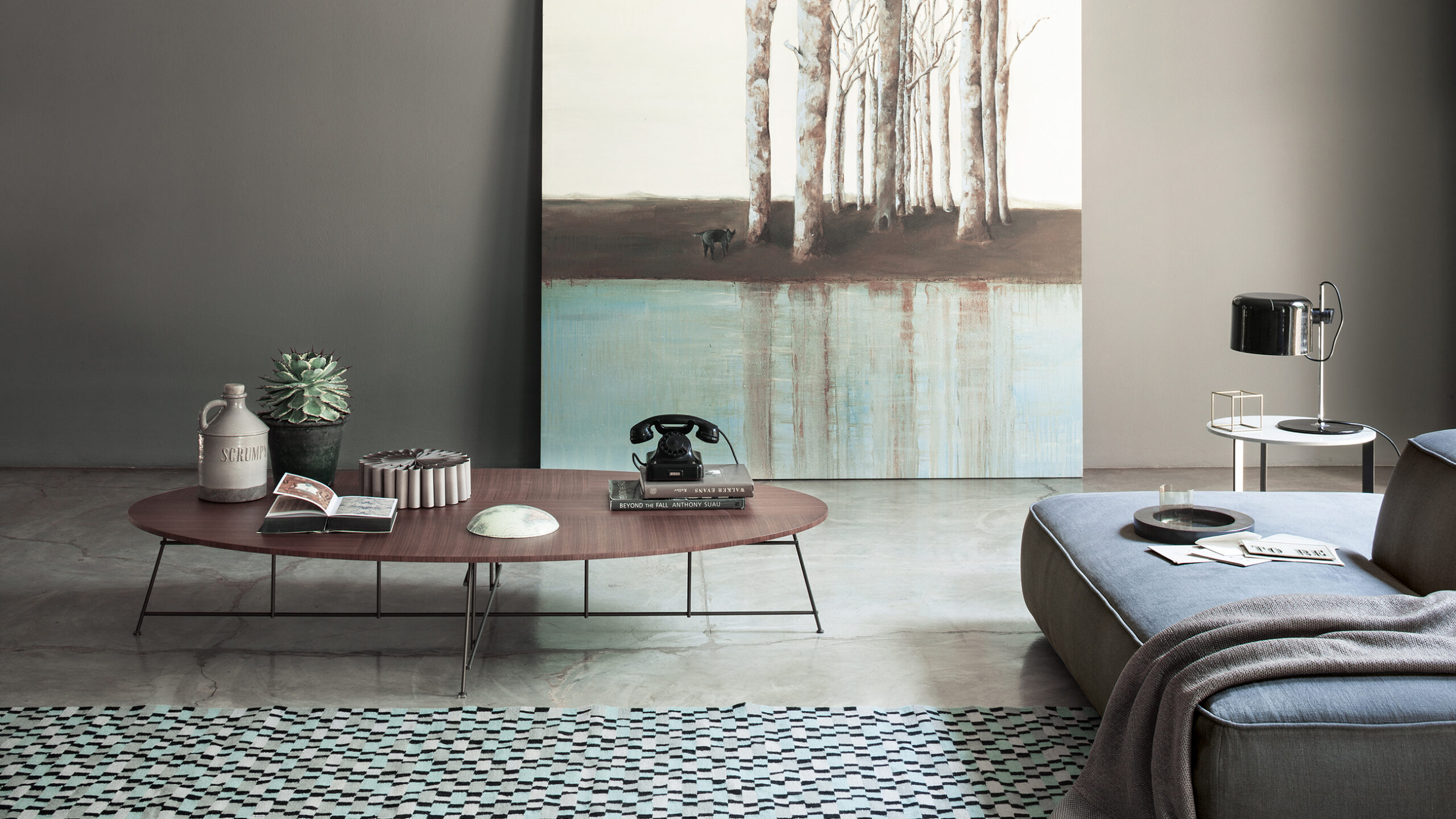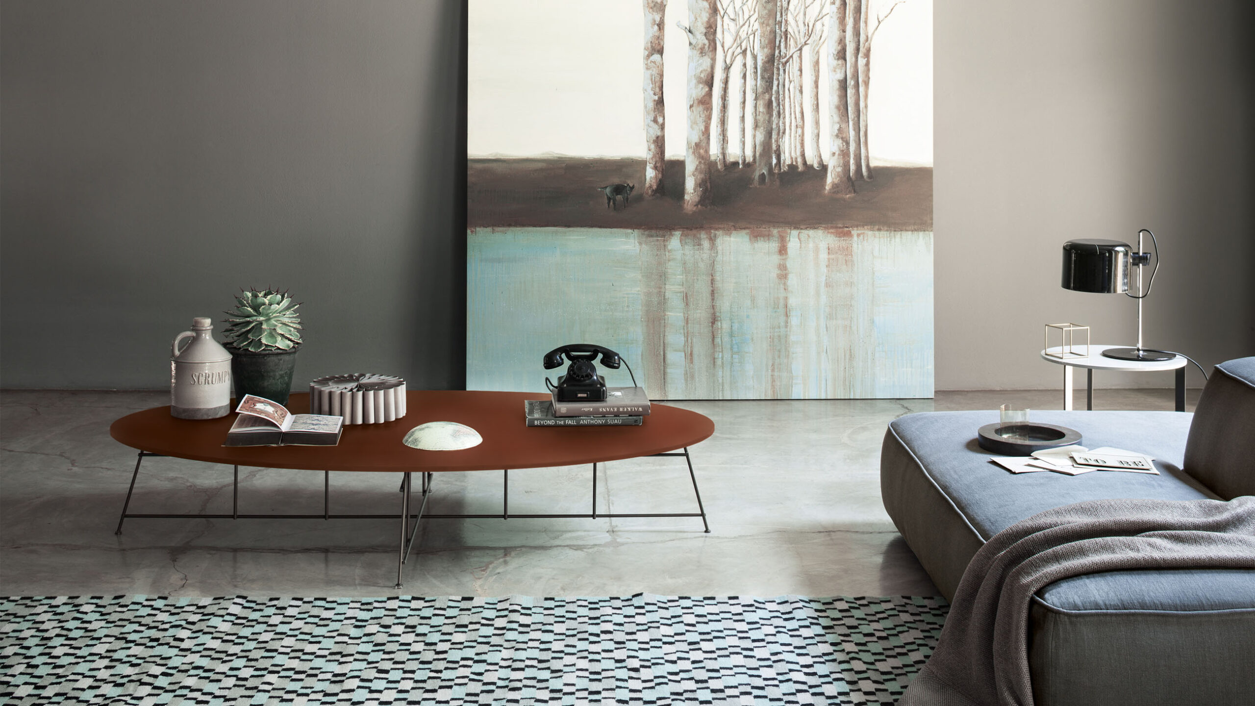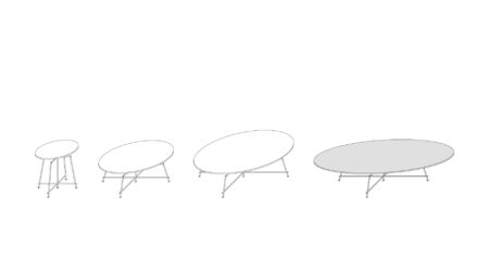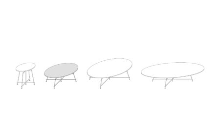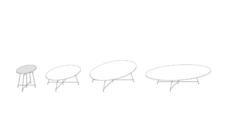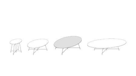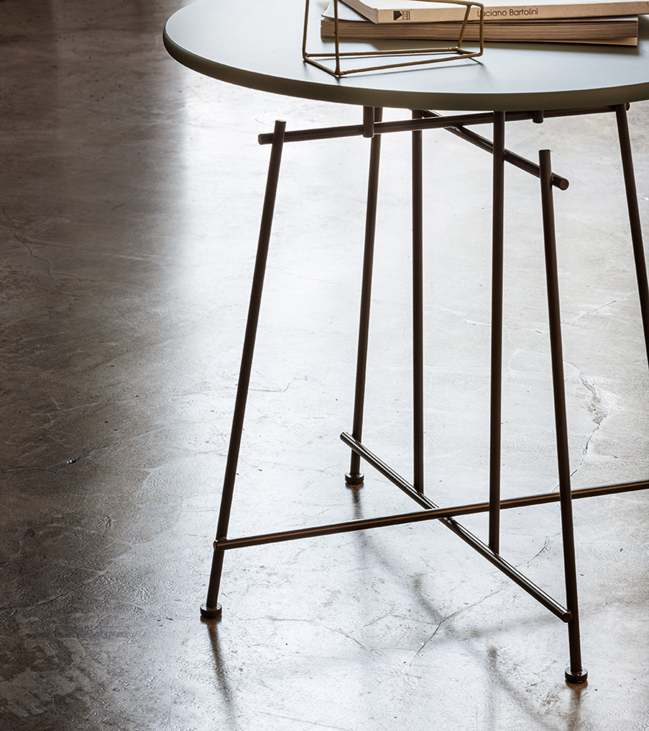 The materiality of the lacquered wood top, available in glossy and matte colors, contrasts with the lightness of the metal. There are four versions in the catalog: three coffee tables with round tops, one tall and two low, and a low oval table.