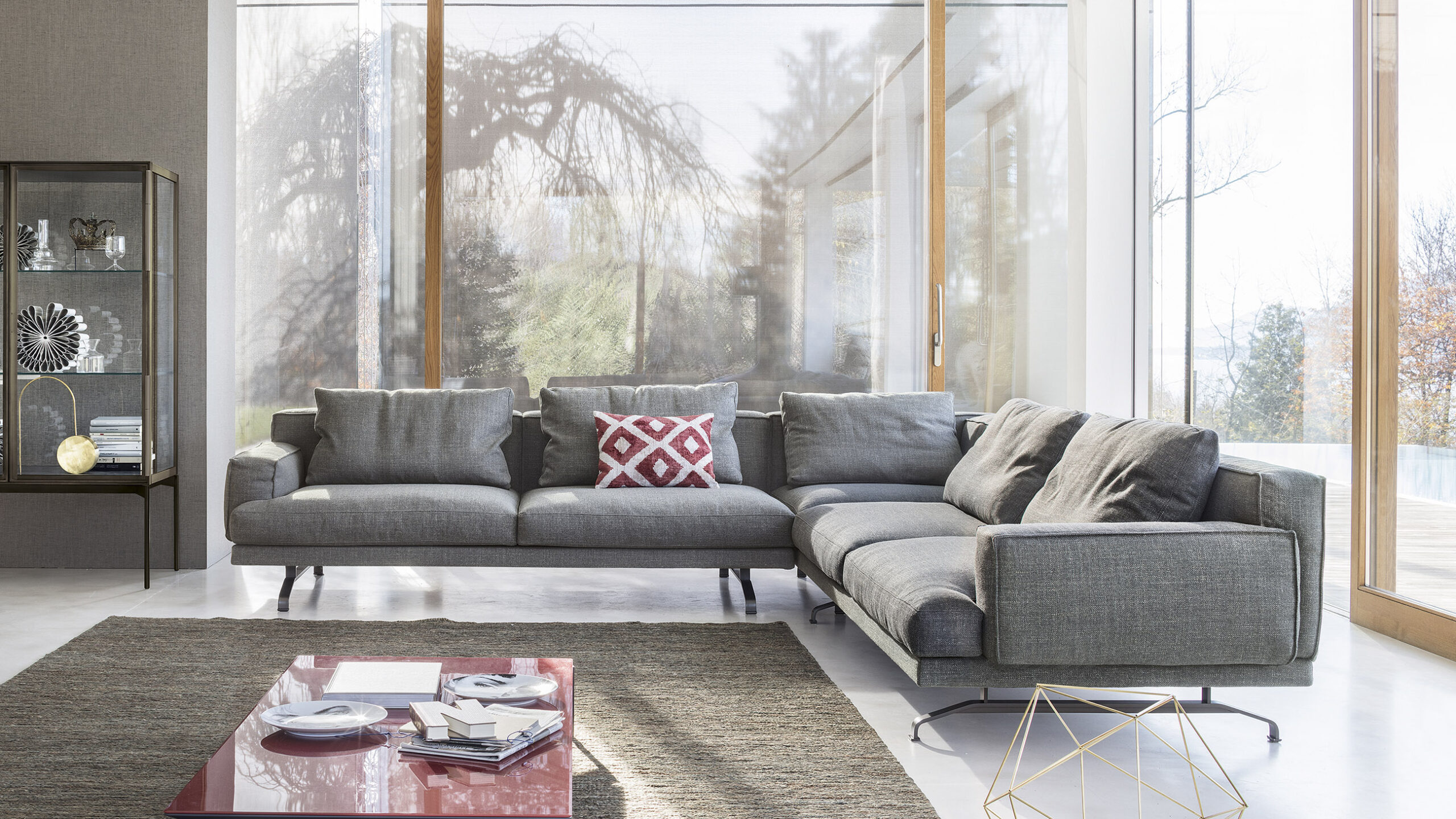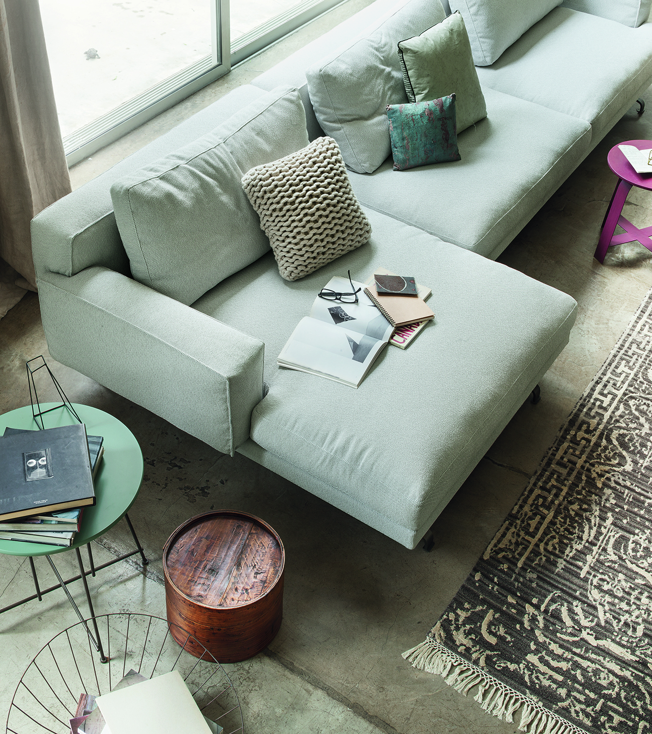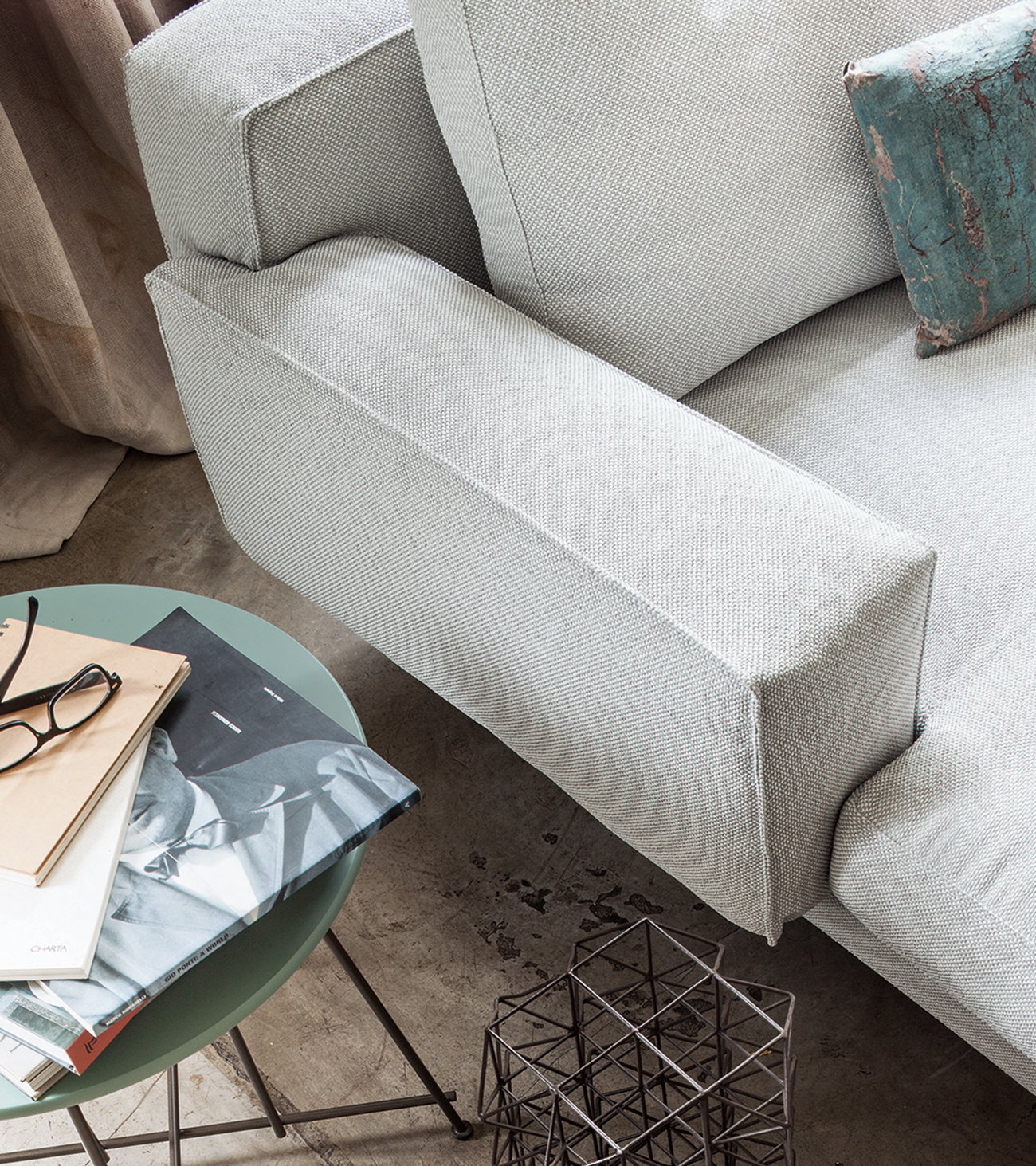 The cushions adopt the regular parallelepiped shape, offered in a range of different sizes according to function, and the upholstery is enhanced by distinctive pinched stitching that accentuates the forms. The carefully balanced interplay of joints gives rise to a proportioned and perfectly harmonious design, a composition with an industrial edge in which every element finds its proper place and fulfills its precise role. Softer surfaces and more rounded corners instead characterize the taller, additional cushions, which are angled to support the natural posture of the back.