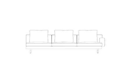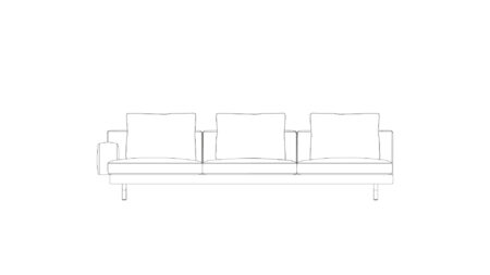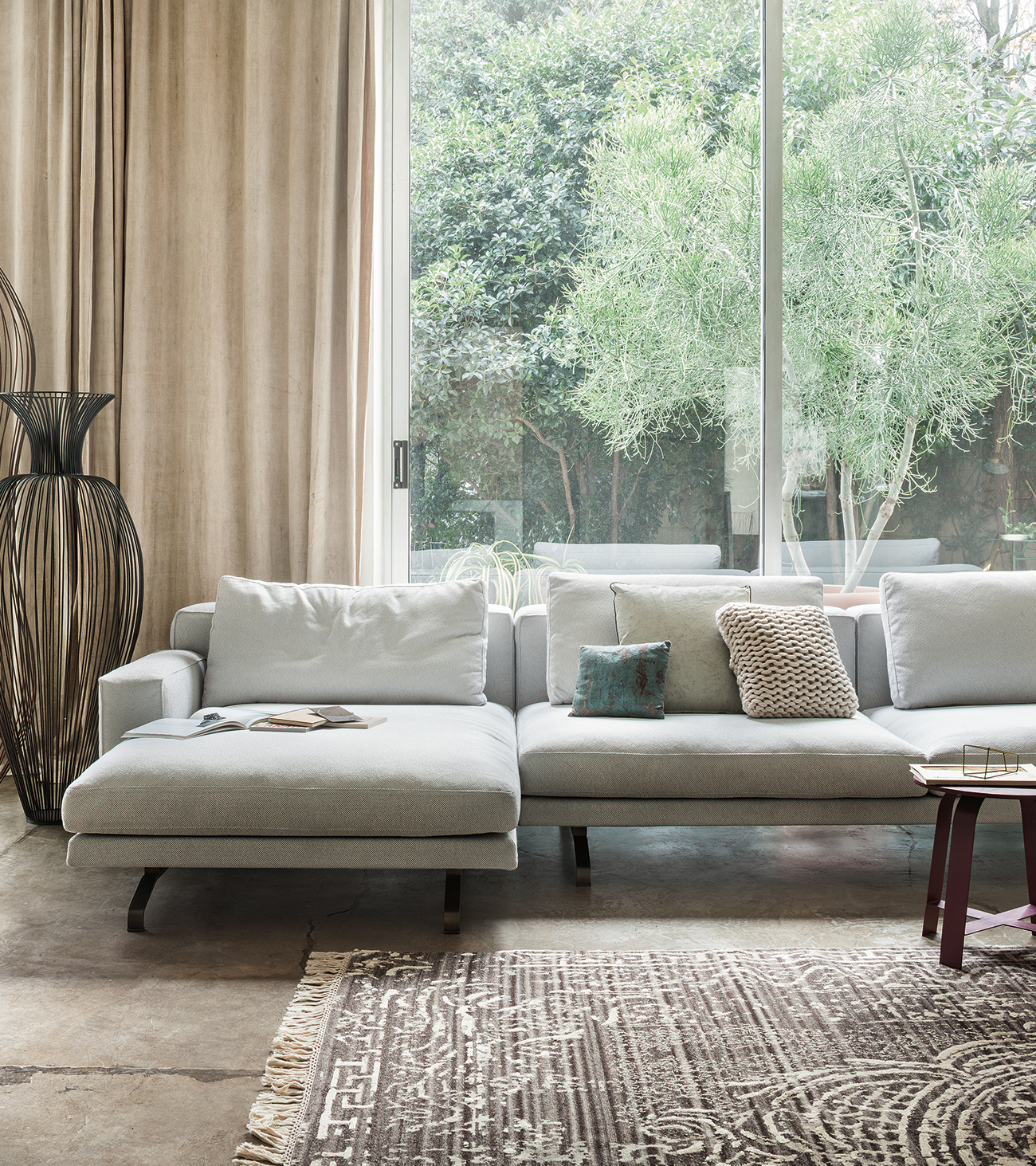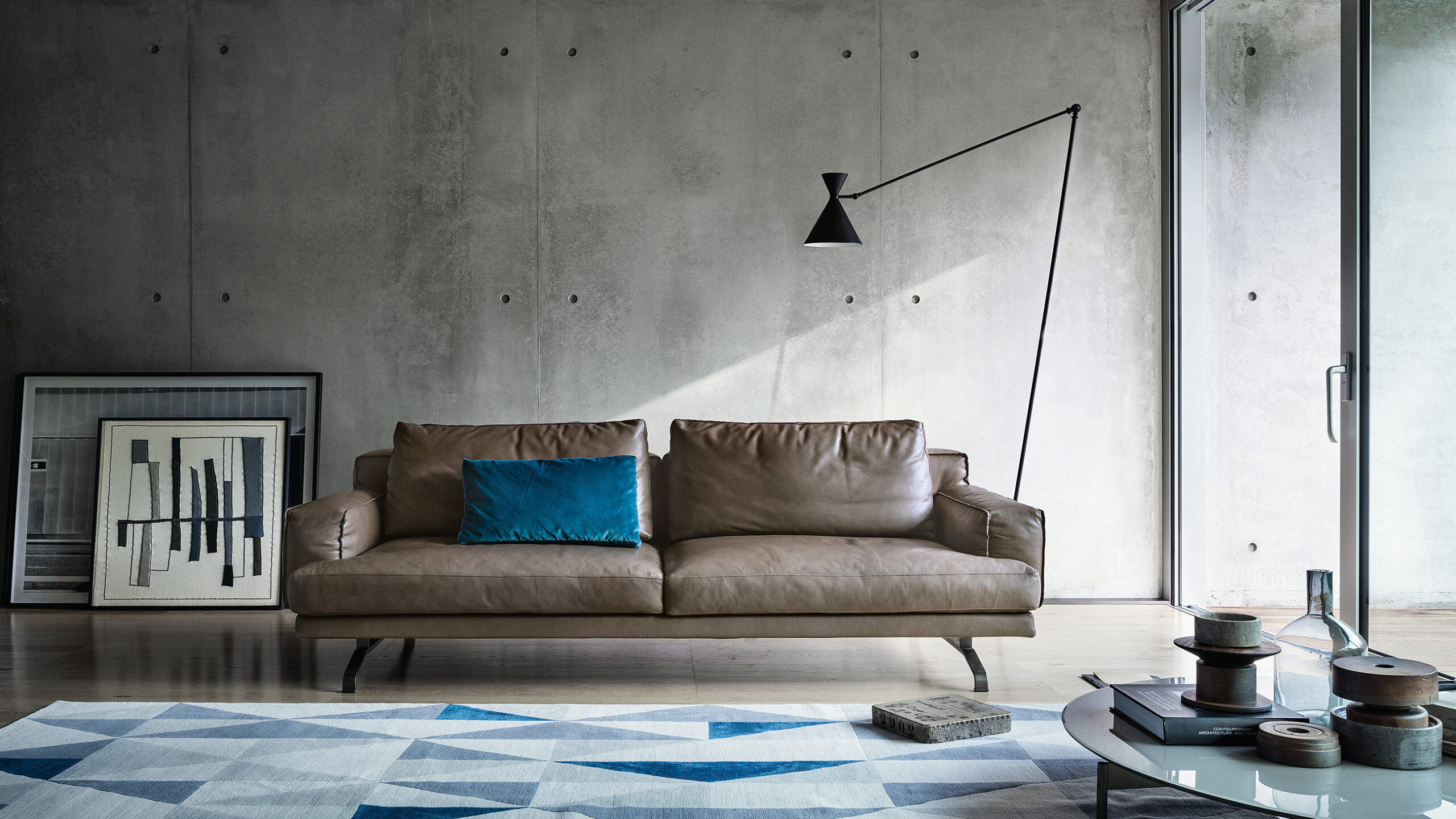 The cushions adopt the regular parallelepiped shape, offered in a range of different sizes according to function, and the upholstery is enhanced by distinctive pinched stitching that accentuates the forms. The carefully balanced interplay of joints gives rise to a proportioned and perfectly harmonious design, a composition with an industrial edge in which every element finds its proper place and fulfills its precise role. Softer surfaces and more rounded corners instead characterize the taller, additional cushions, which are angled to support the natural posture of the back.