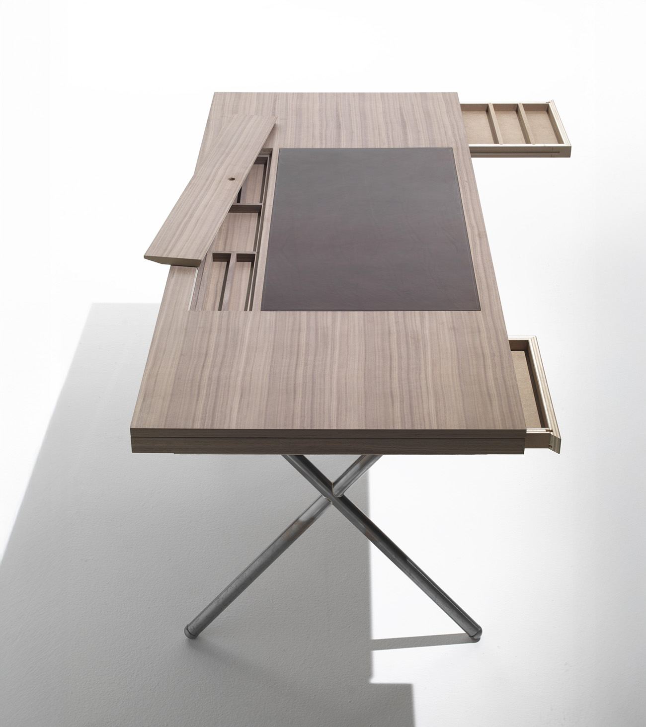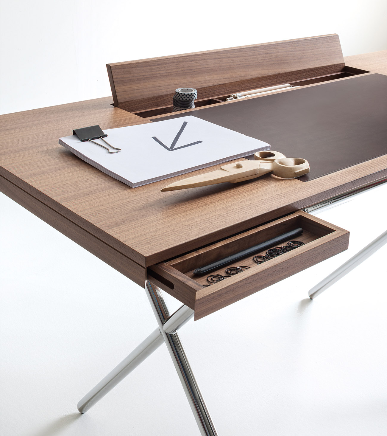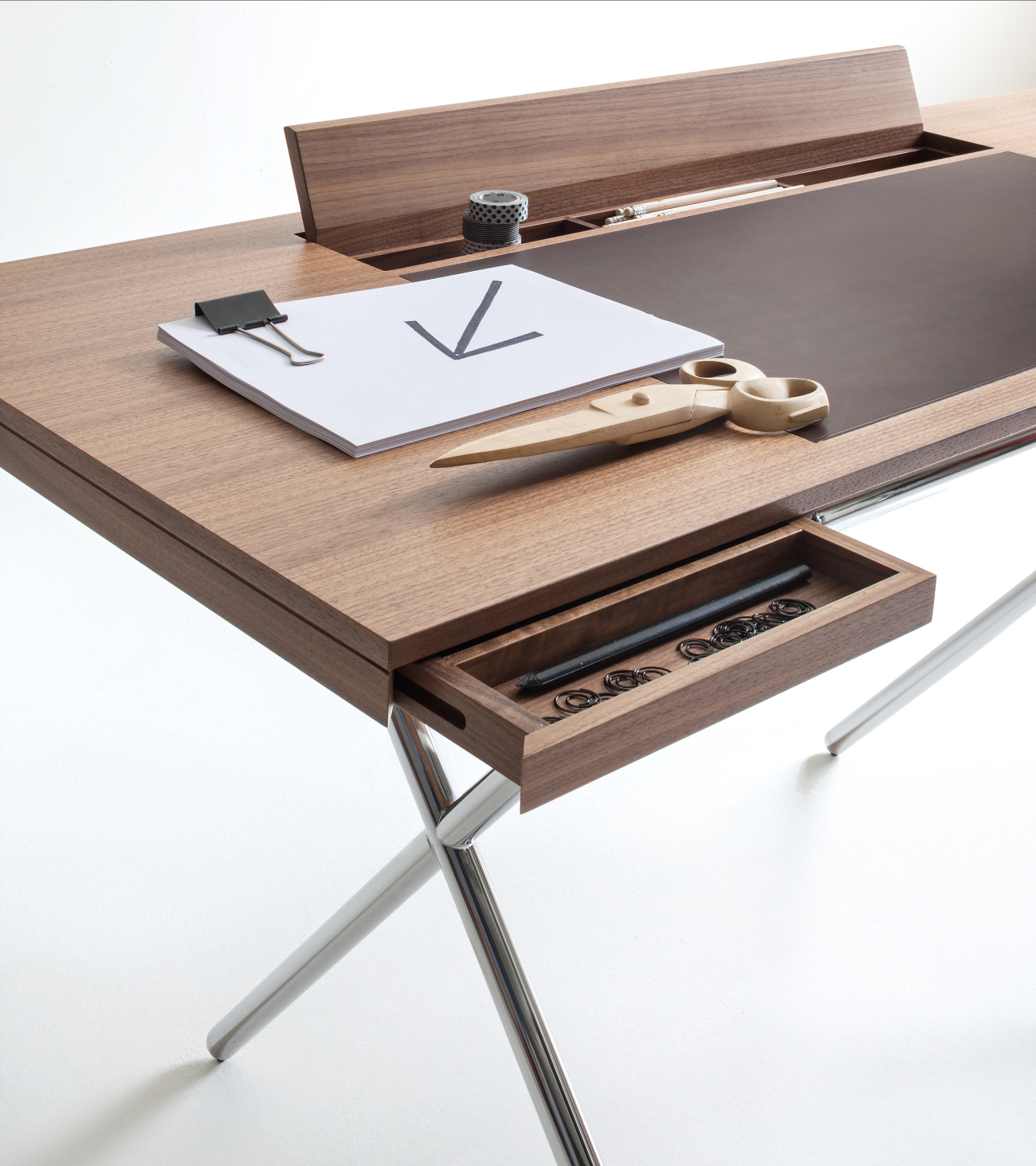 The base consists of two crossed legs in shiny chromed metal, which support the top in precious Canaletto walnut wood. In the reduced thickness are two side drawers and a pencil compartment. Emphasizing its retro flavor, the leather desk pad.