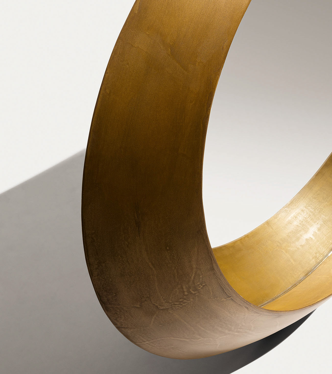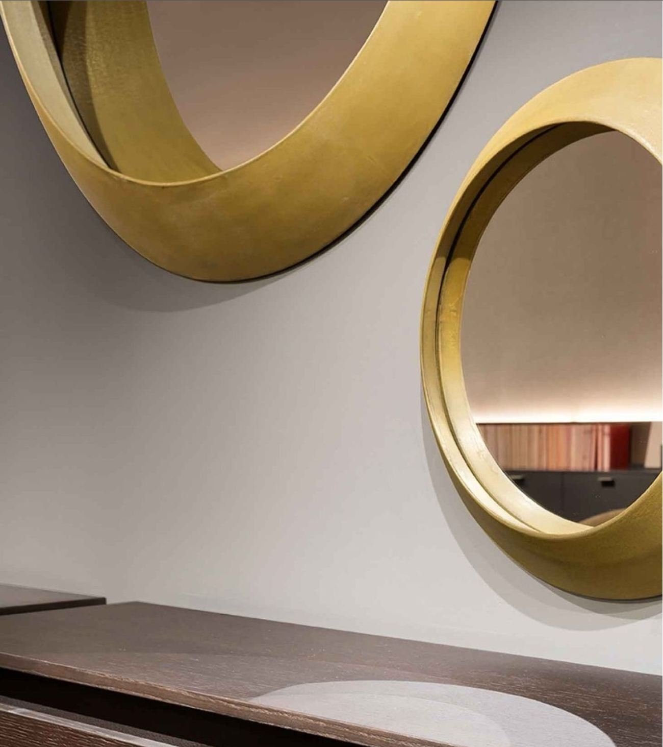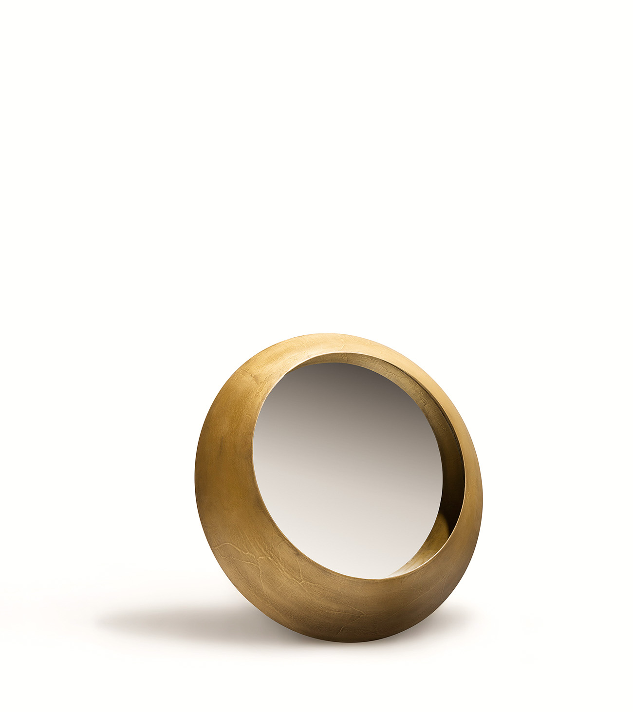 Oculus by LEMA, designed by Andrea Mancuso, is a mirror-object with an enigmatic shape: a spherical section with a circular opening that houses the mirror. The visual experience varies depending on the point of view thanks to a hypnotic play of reflections. The frame is made of MDF with variable geometry and a bronze patinated spatula finish, achieved through a manual artisanal process. The float mirror (4 mm thick) is mounted on a black lacquered MDF backing and is available in three sizes. Each piece is distinguished by the unique workmanship of its surface. Oculus expresses quality, safety, sustainability, and authentic Made in Italy design, confirmed by all the main international standards and certifications adopted by LEMA.