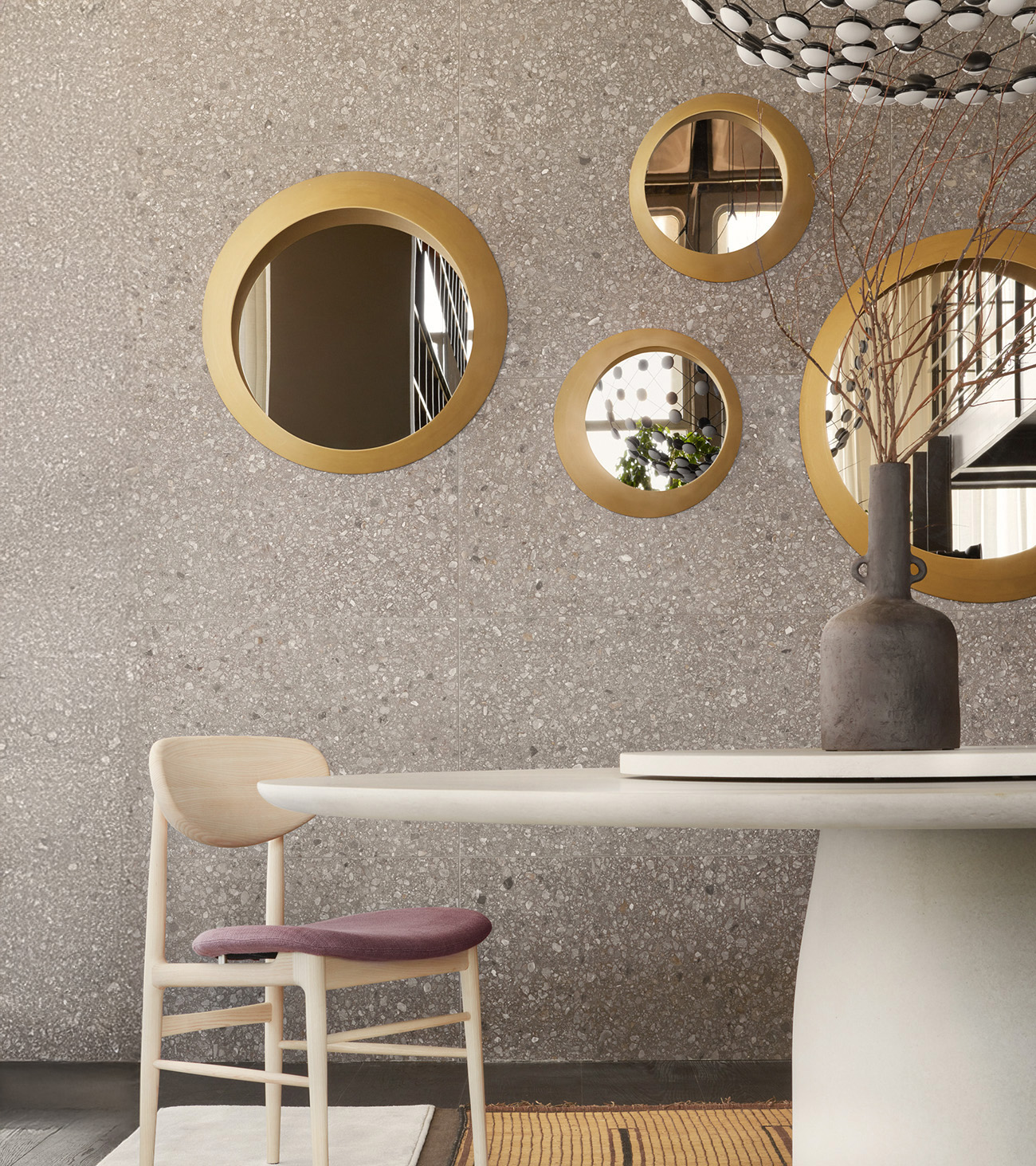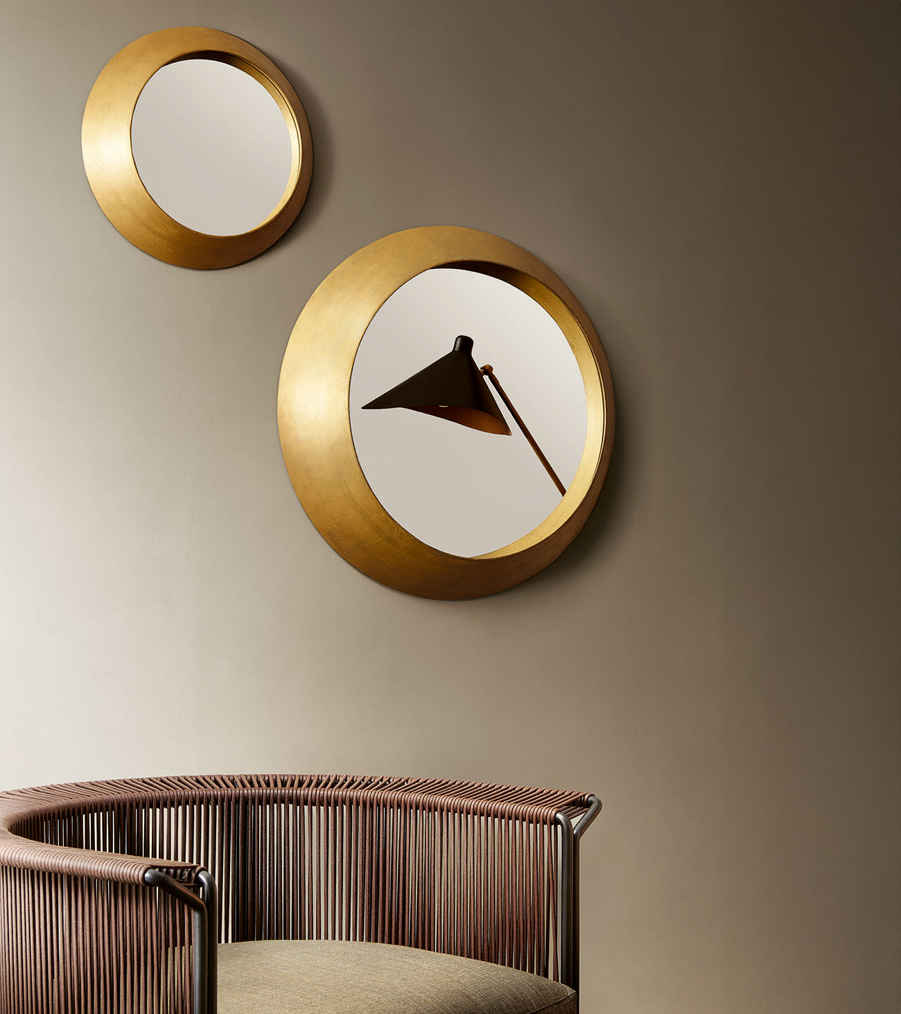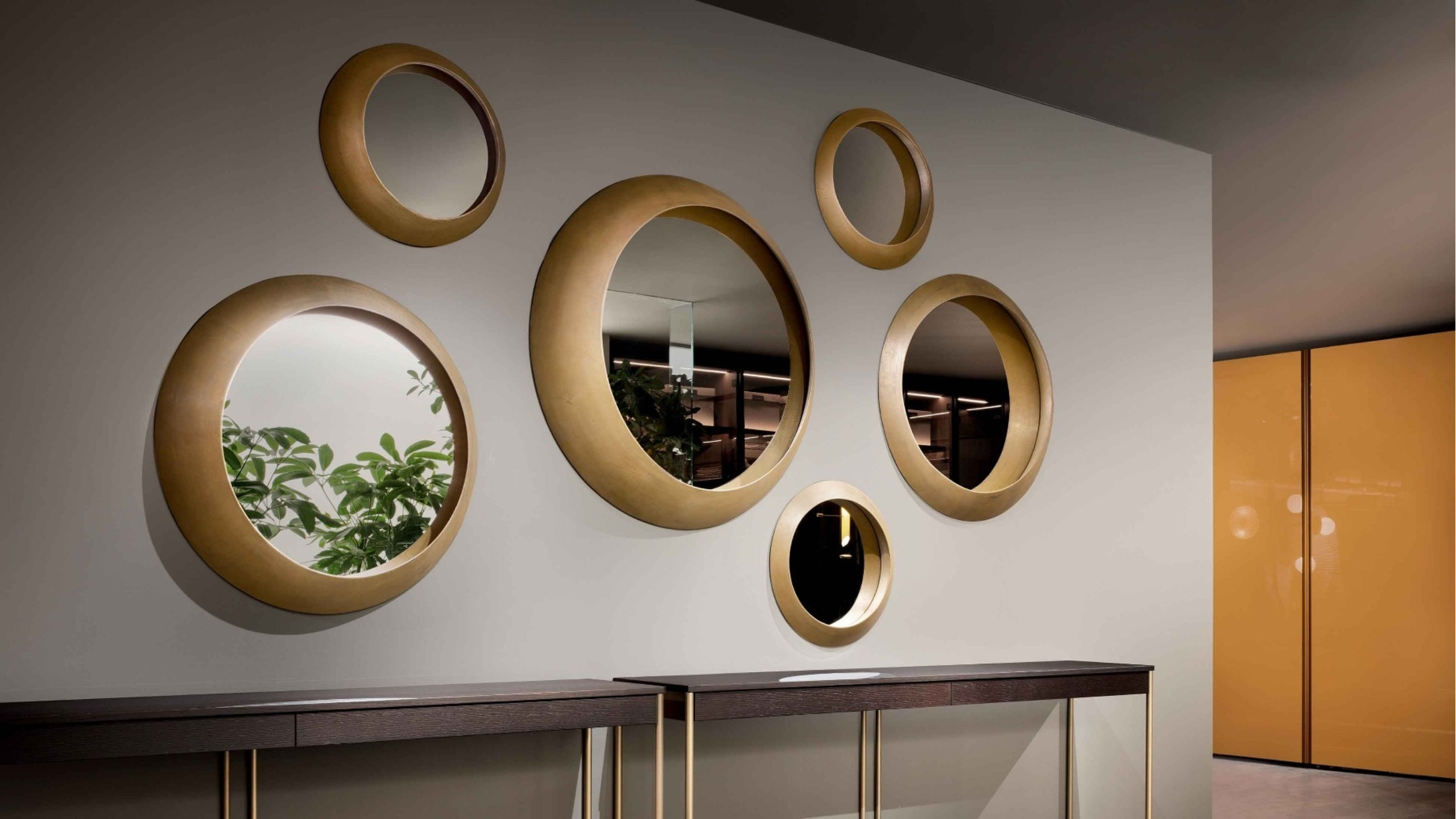 Oculus by LEMA, designed by Andrea Mancuso, is a mirror-object with an enigmatic shape: a spherical section with a circular opening that houses the mirror. The visual experience varies depending on the point of view thanks to a hypnotic play of reflections. The frame is made of MDF with variable geometry and a bronze patinated spatula finish, achieved through a manual artisanal process. The float mirror (4 mm thick) is mounted on a black lacquered MDF backing and is available in three sizes. Each piece is distinguished by the unique workmanship of its surface. Oculus expresses quality, safety, sustainability, and authentic Made in Italy design, confirmed by all the main international standards and certifications adopted by LEMA.
