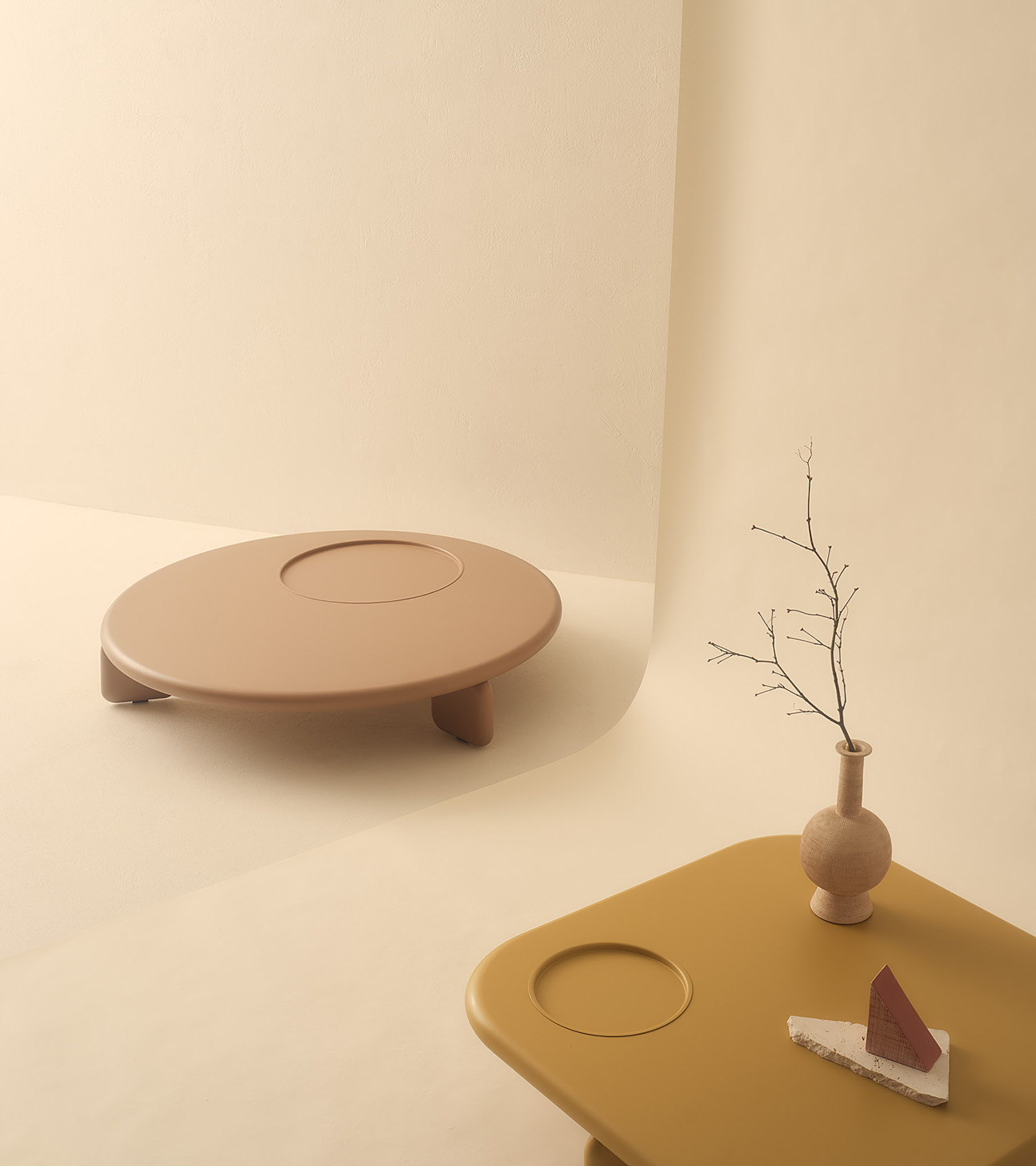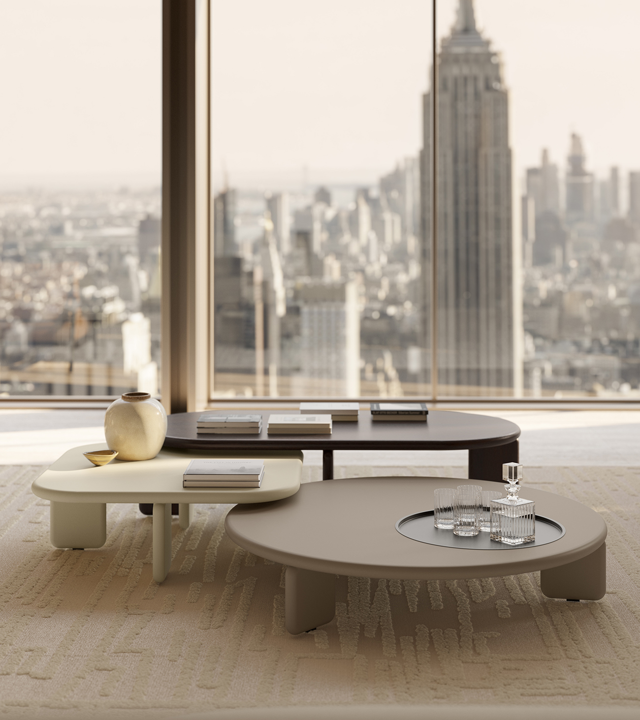 The top features a circular outline that adds an original touch, perfect for displaying decorative objects, cups, or small accessories. Distinctive elements of Orion are its sculptural, at times modernist, forms, paired with unique leg craftsmanship: unlike traditional options that are thin and minimal, the Orion coffee table legs are characterized by an important structure—a flat, rectangular section with softened corners, seemingly able to move freely to create visual dynamism from different perspectives. Whether used individually or grouped together, thanks to their striking and unconventional design, Orion coffee tables fit seamlessly into any setting.