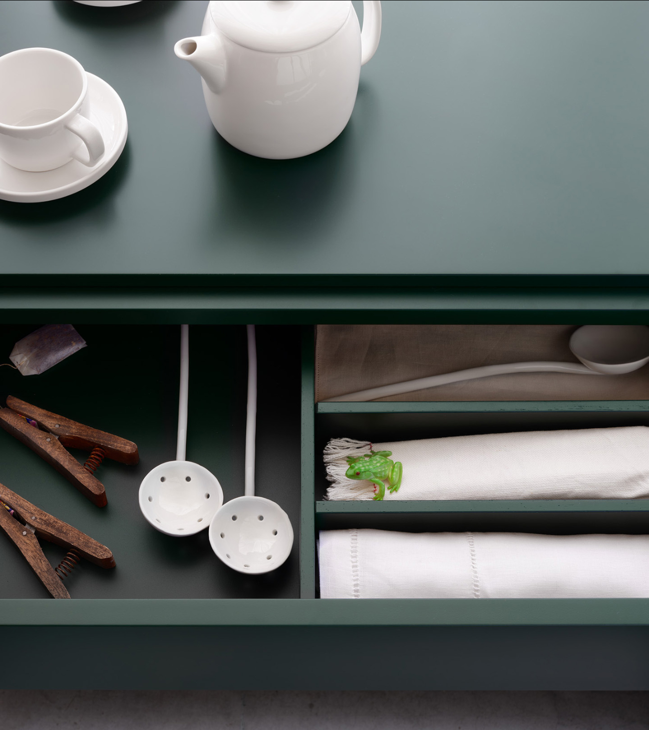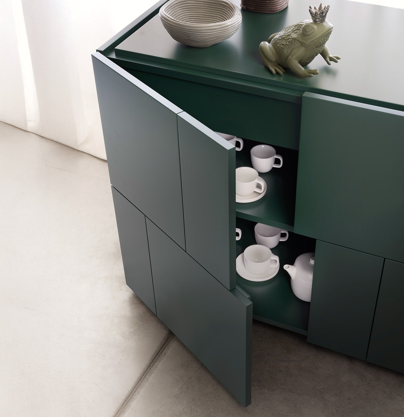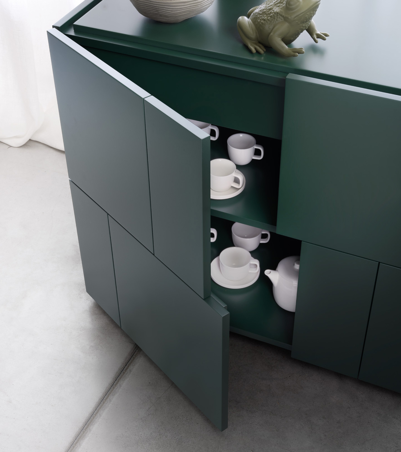 Ortelia is a sideboard distinguished by its “tile” facade, a precious graphic play that enlivens the surface, made up of squares that conceal hinged doors and drawers.