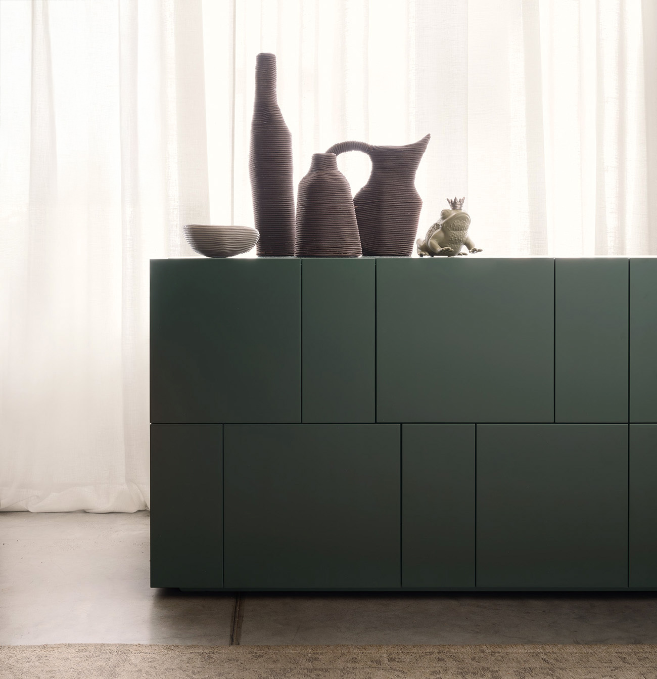 Ortelia by LEMA, design by Marelli Molteni, is a sideboard with a paneled front that creates an elegant graphic play of squares. Available in two sizes and in matte or glossy lacquered finishes, it features coordinated interior and exterior lacquering. Made of MDF and CARB ATCM PHASE II certified panels, it is finished with lacquered ABS edges and polyurethane paints. Dimensions: W 1740-2200 mm, H 790 mm, D 520 mm.