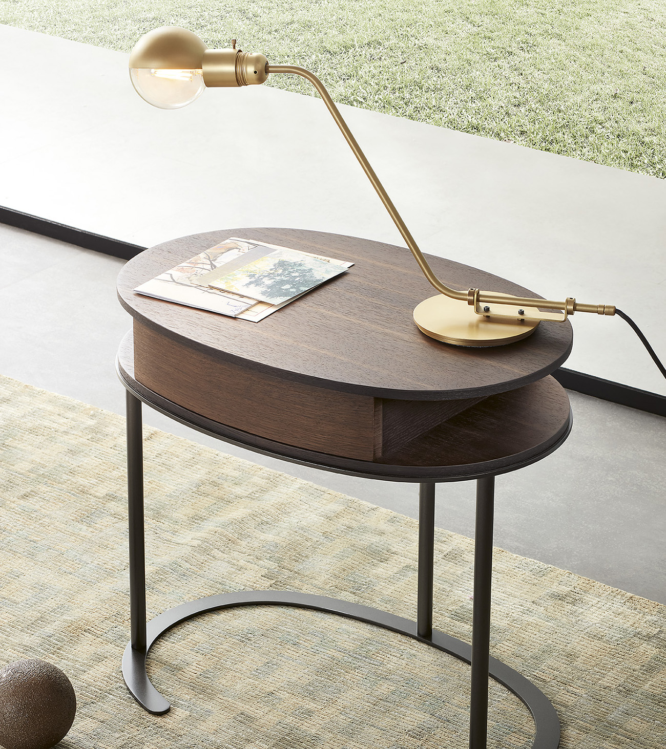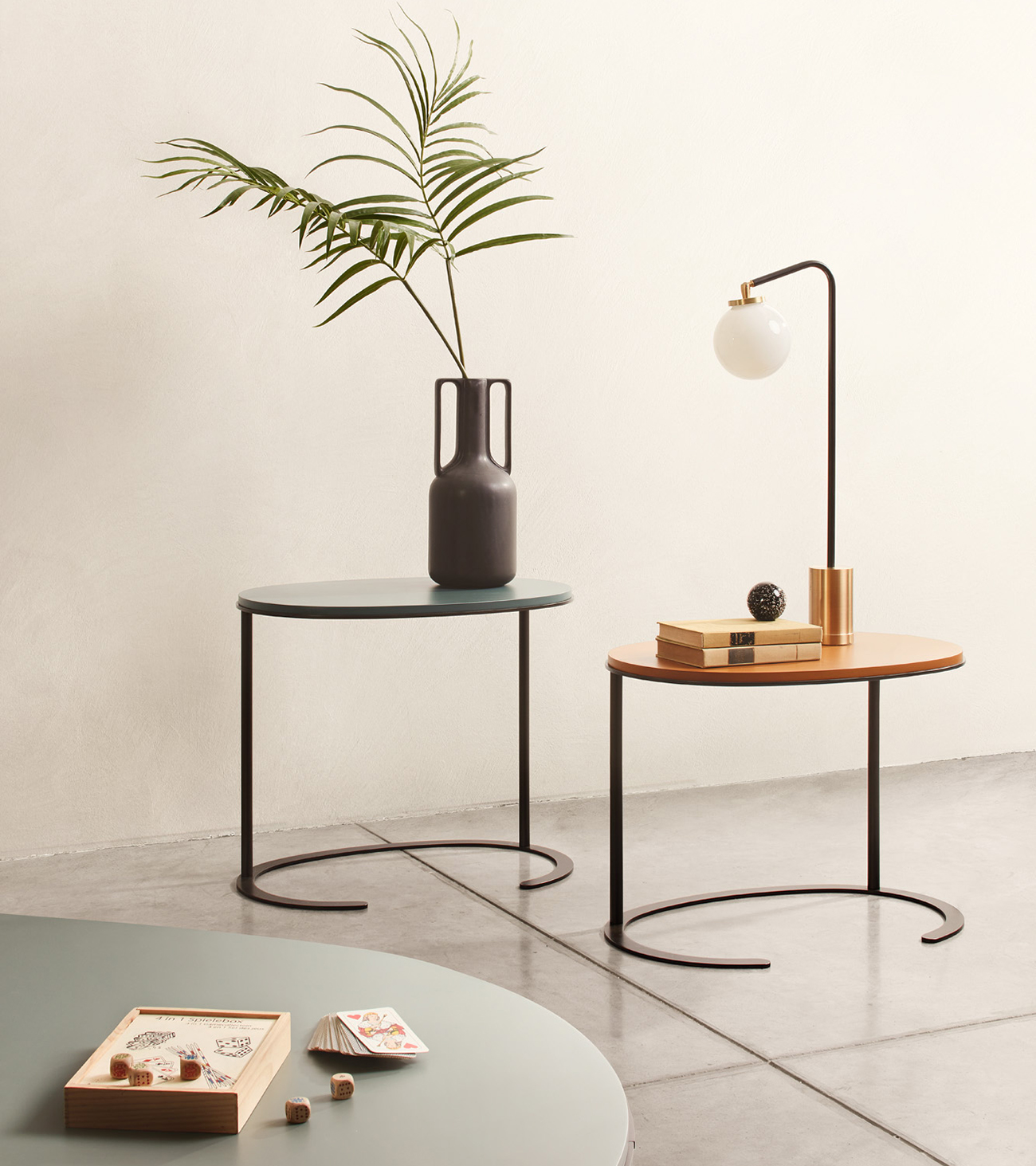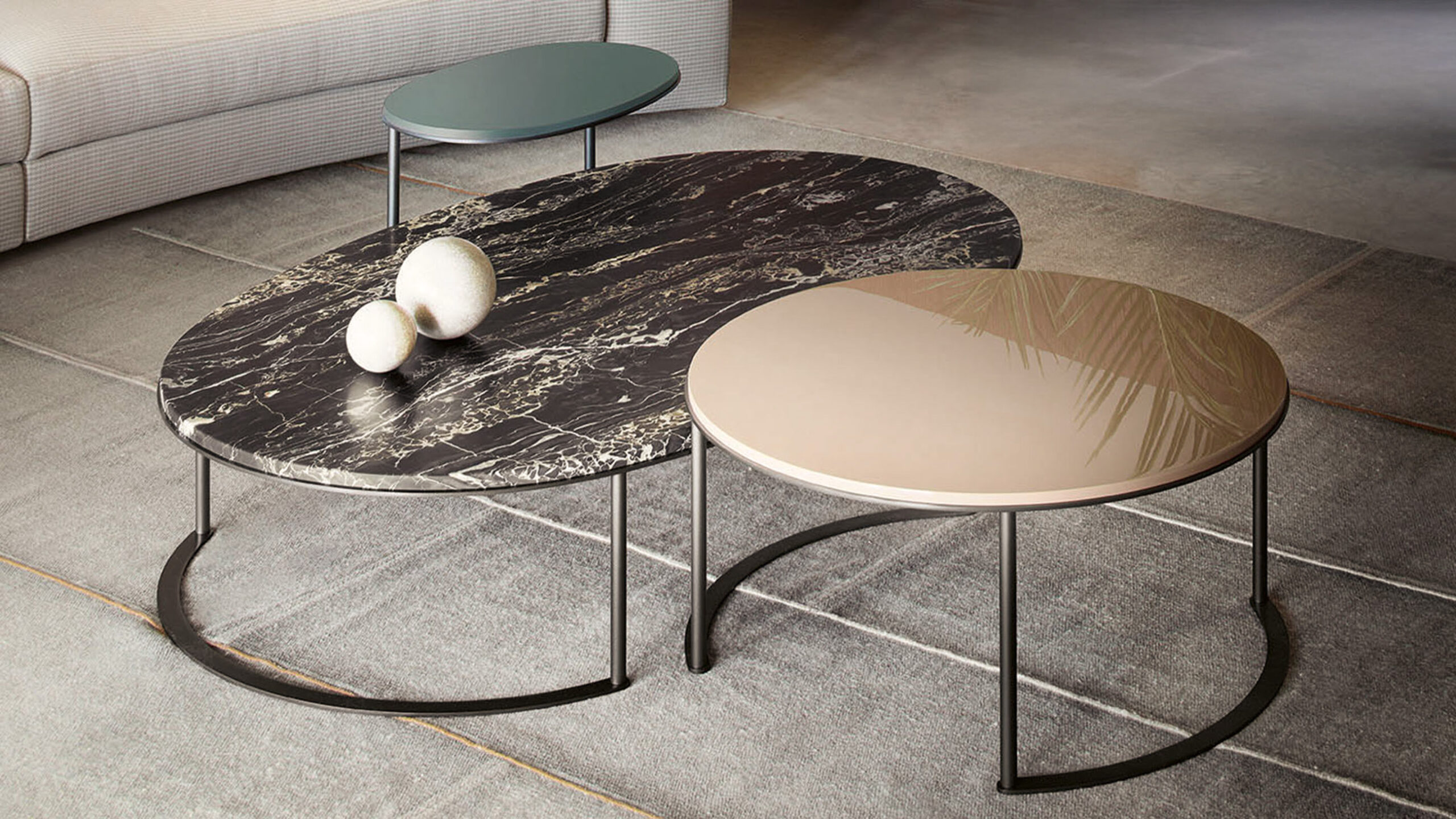 Available in various sizes and heights, they are designed for the living area to accompany sofas, either in front or to the side, and can also be arranged in multiple, interlocking compositions. A versatile piece that can be easily moved around the room as needed, it can be partially slid under the sofa base, transforming into a practical surface for glasses, books, or laptops. The structure is crafted from painted metal, while the tops are offered in glossy and matt lacquer, wood, marble, and stone.