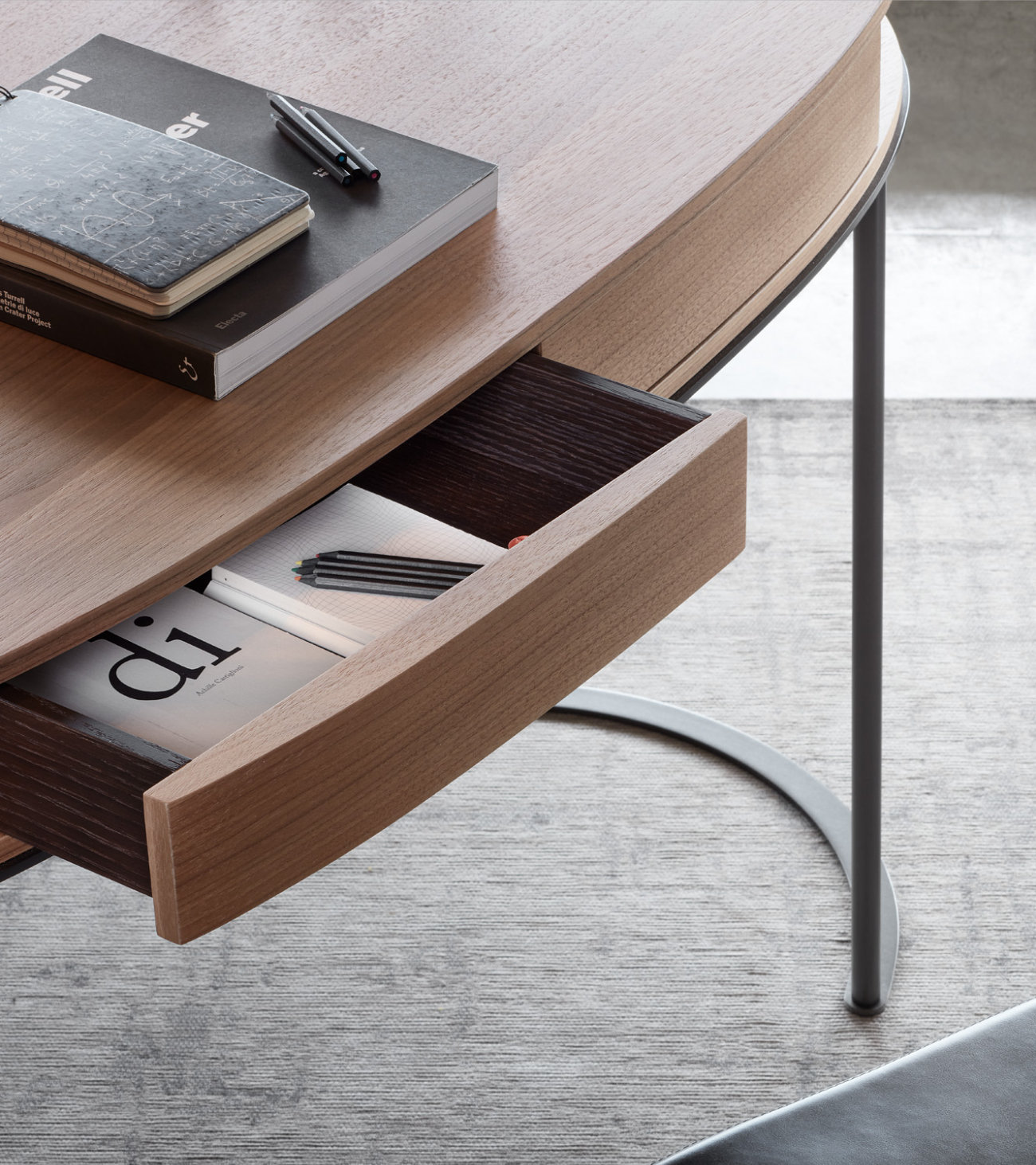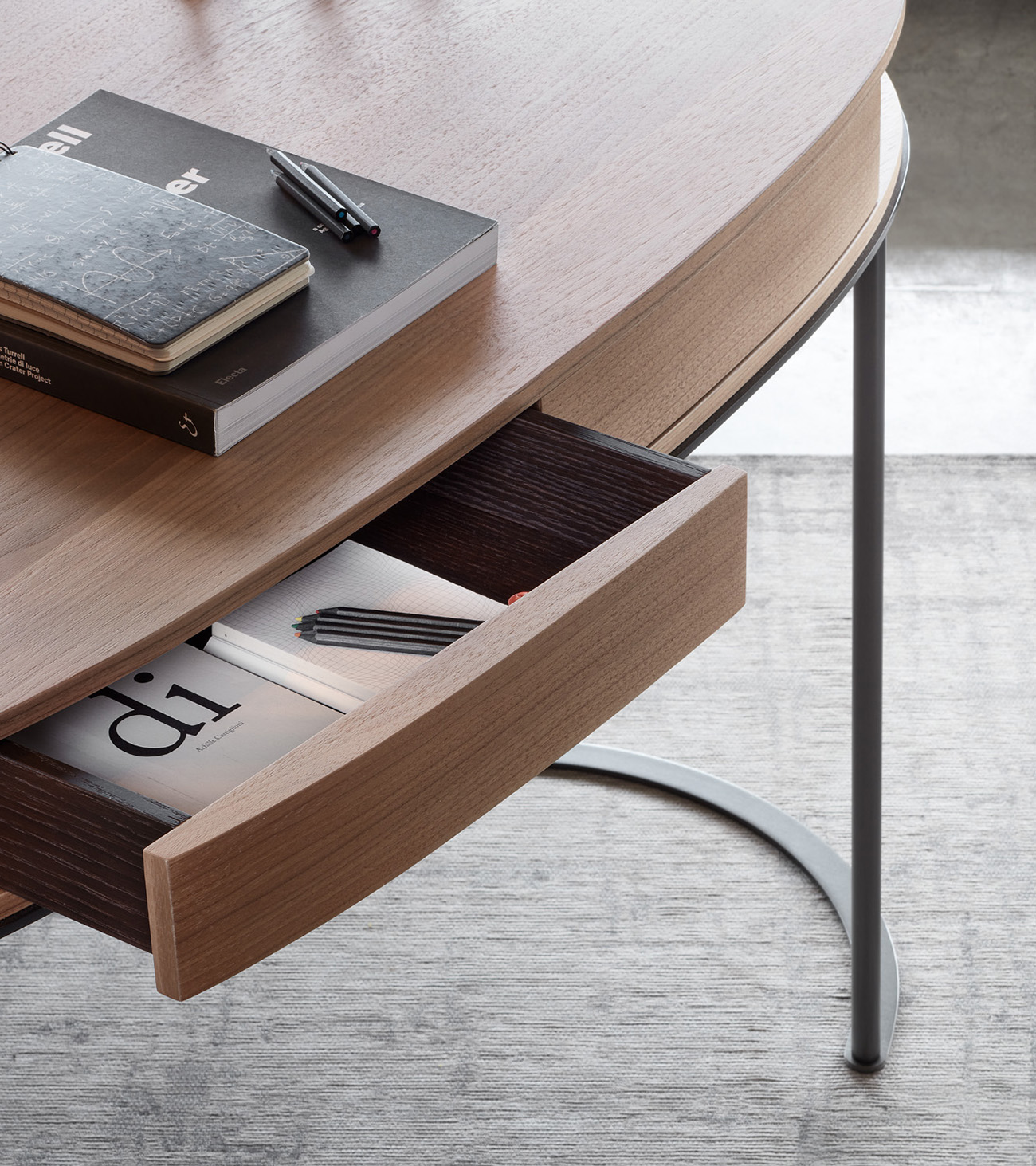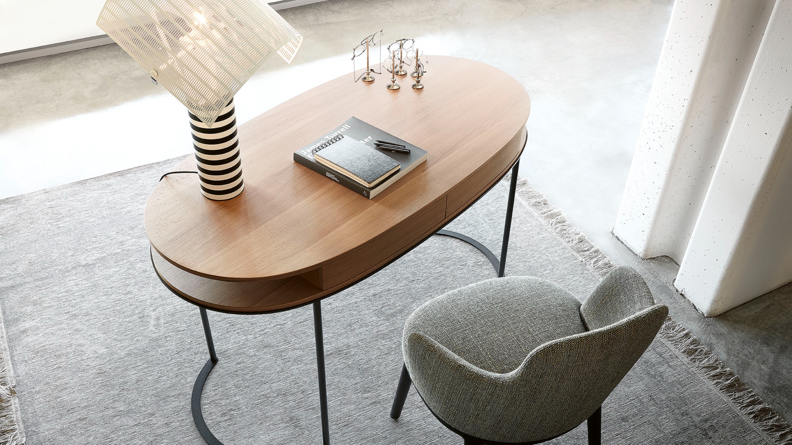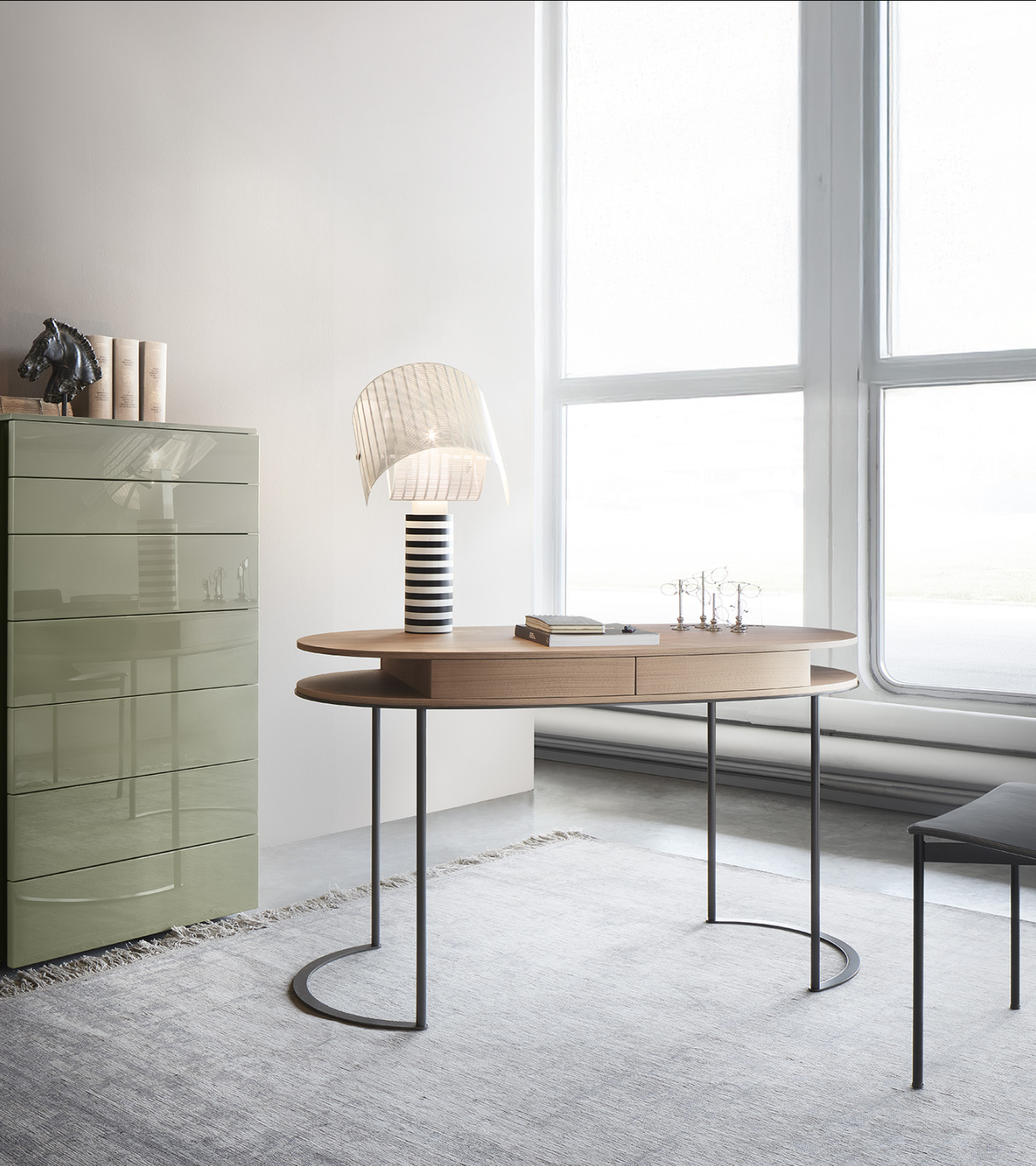 The oval top, characteristic of the Ortis project, hides two practical drawers and is supported by a light structure of metal tubes anchored to semicircular base plates. The top of the Ortis desk is available in glossy and matte lacquer or wood, while the thin legs of the desk are in bronze-painted metal.