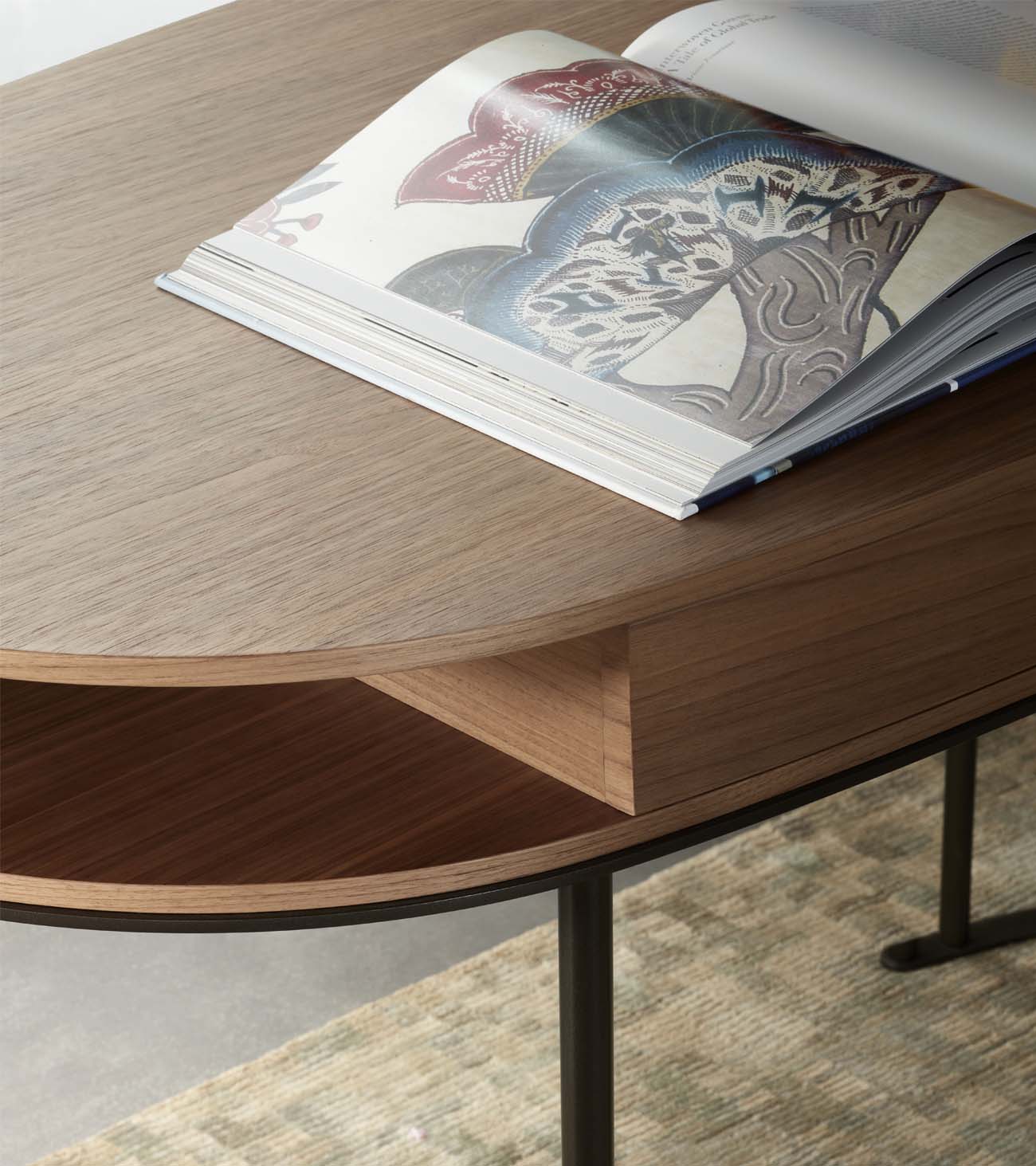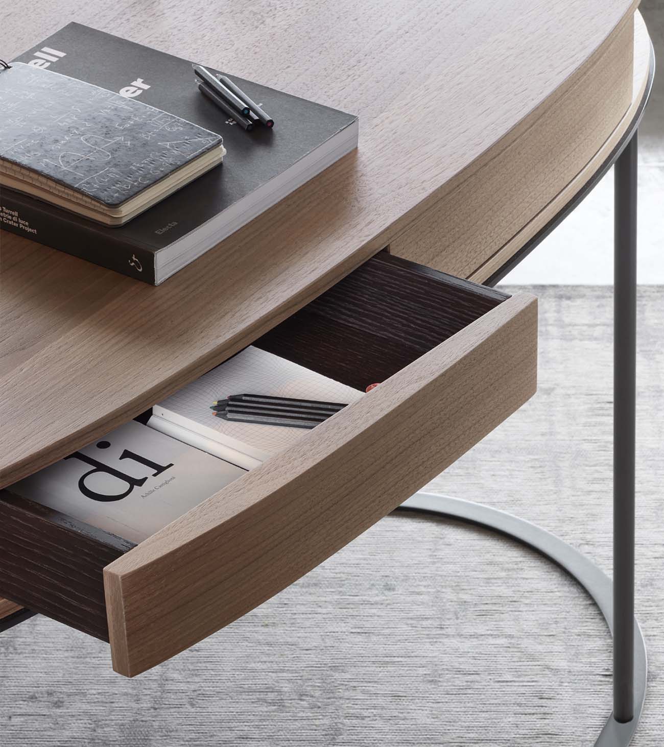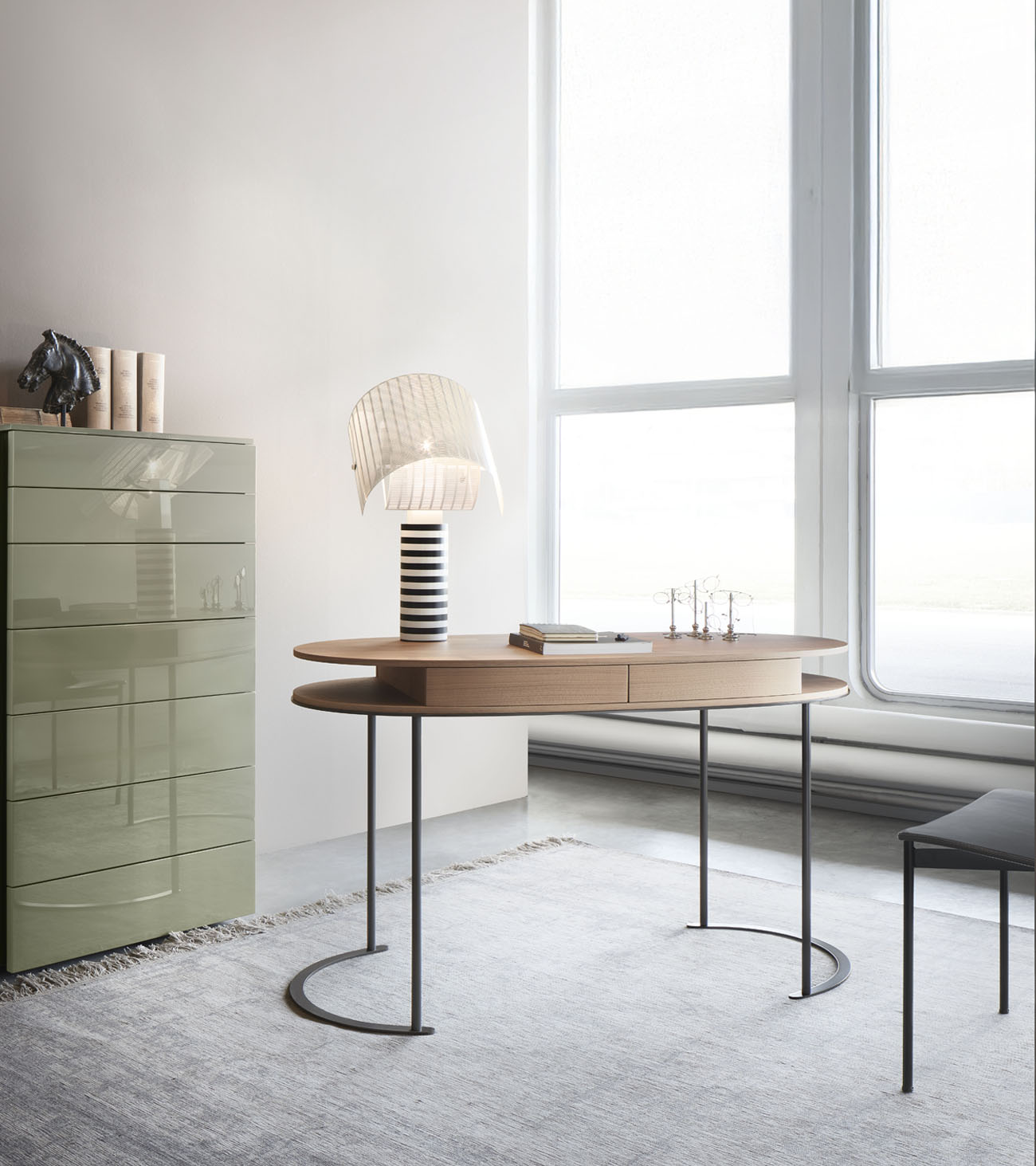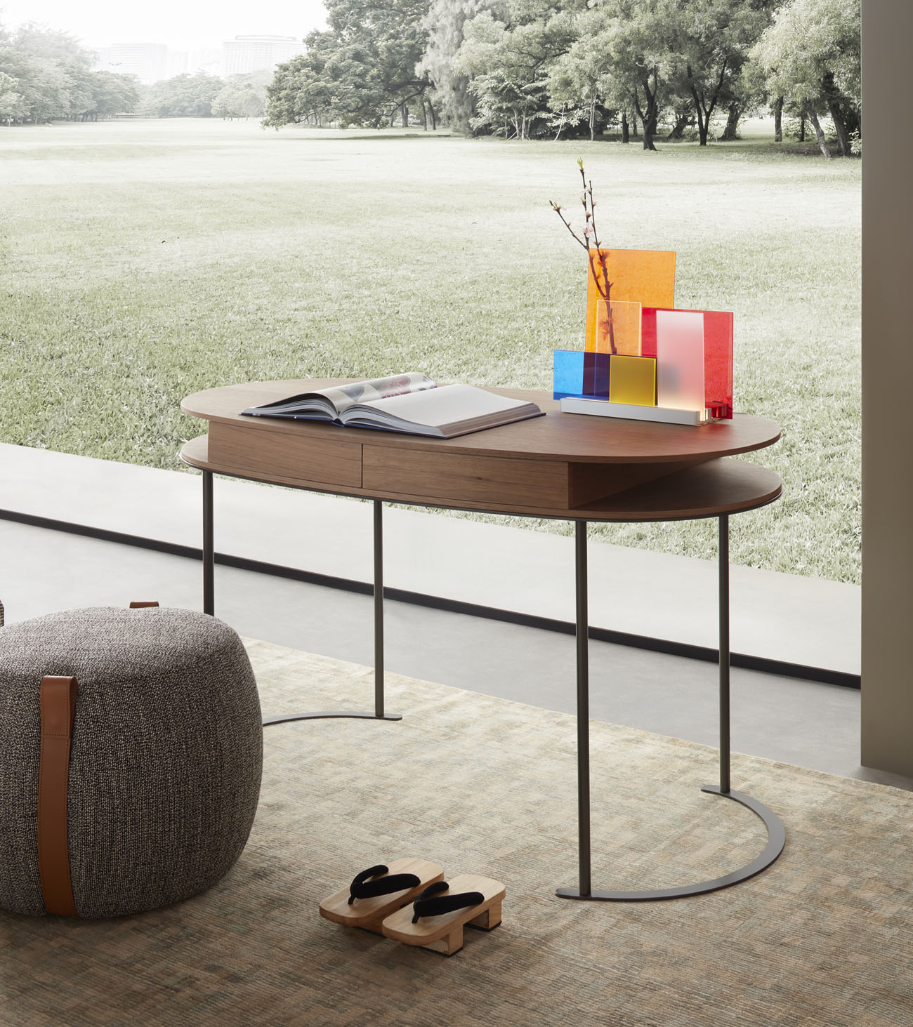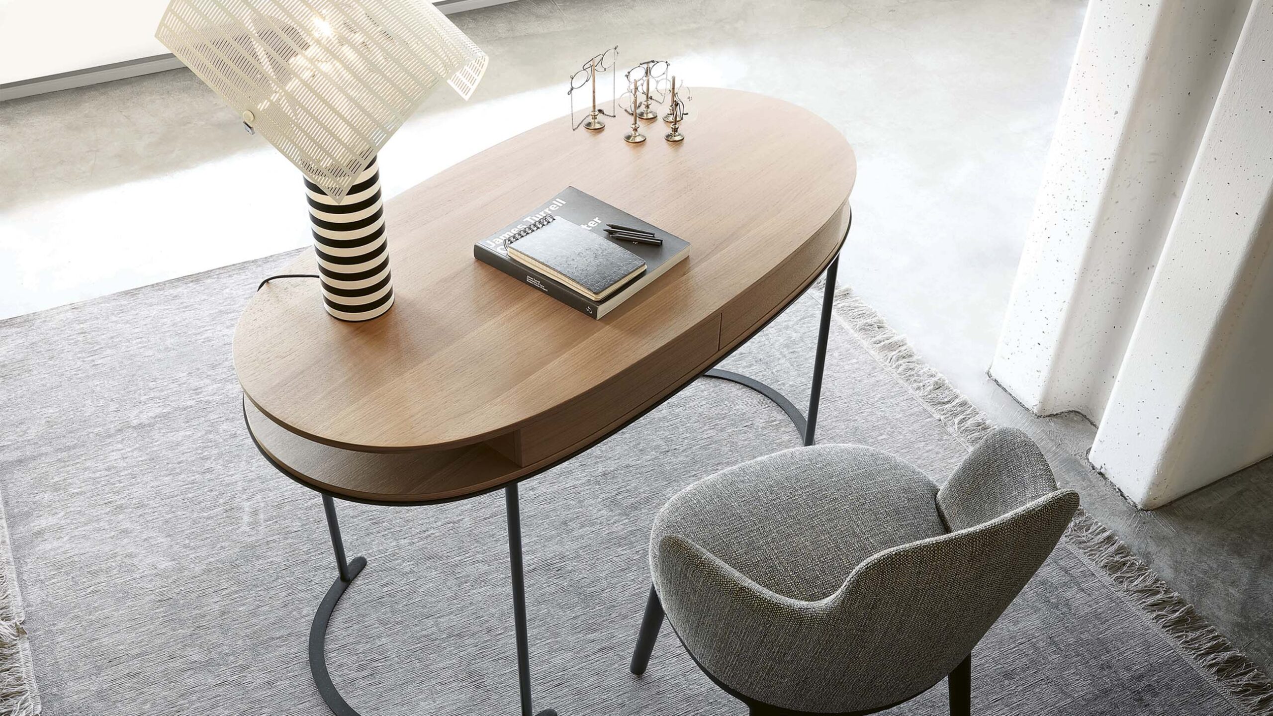 The oval top, characteristic of the Ortis project, hides two practical drawers and is supported by a light structure of metal tubes anchored to semicircular base plates. The top of the Ortis desk is available in glossy and matte lacquer or wood, while the thin legs of the desk are in bronze-painted metal.