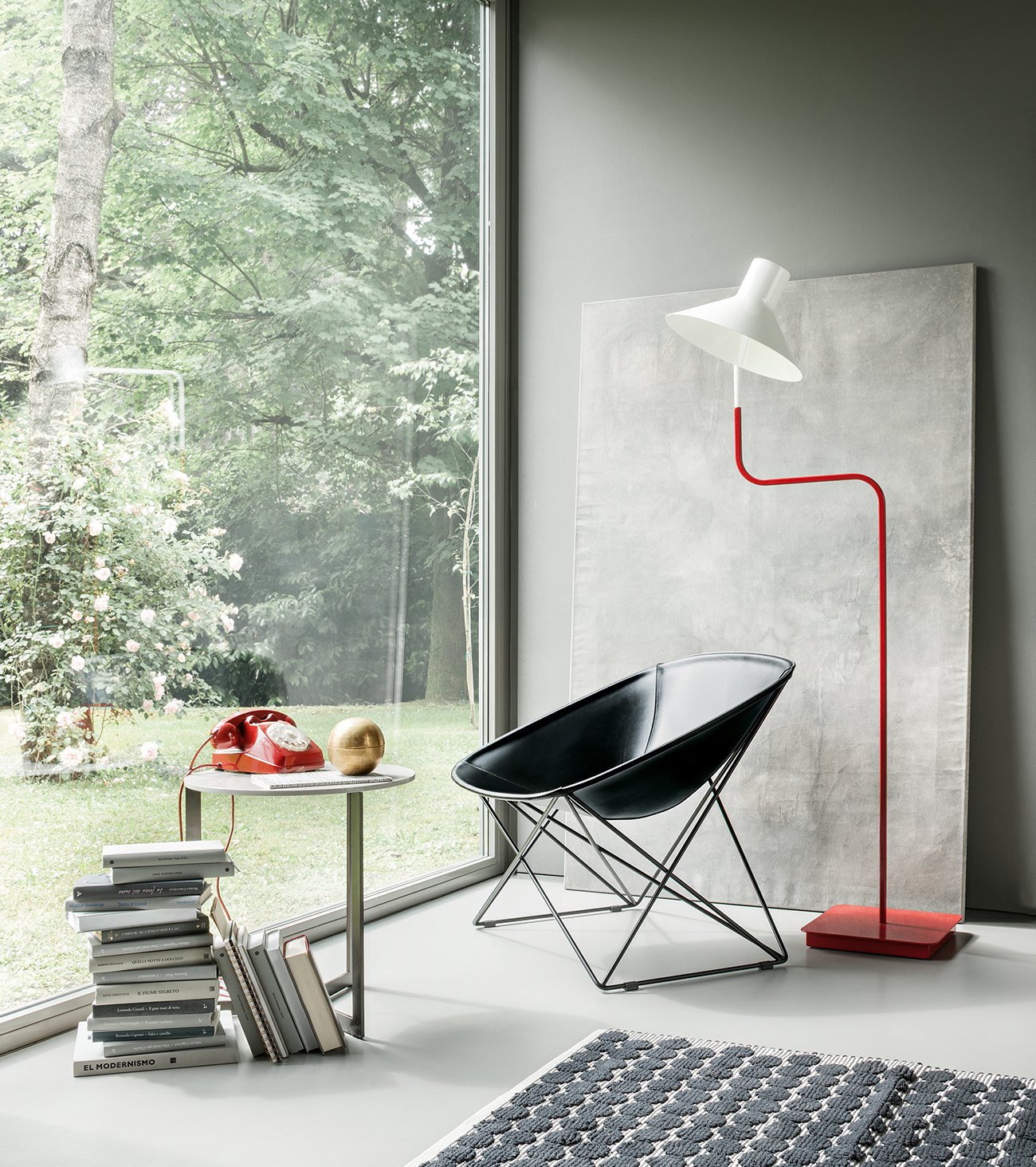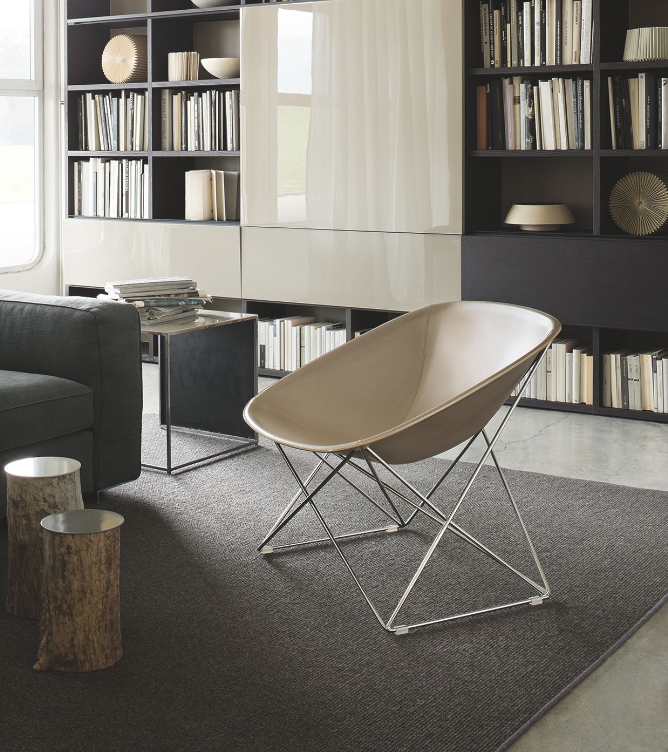 Designed by Ferruccio Laviani, the Popsi lounge chair stands out for its sophisticated design and refined materials: metal and hide. Its base features a delicate weave of rods, a light metallic web with a complex design.